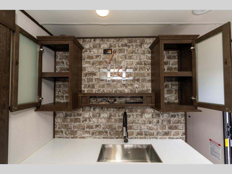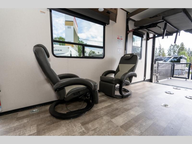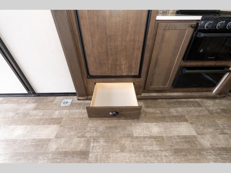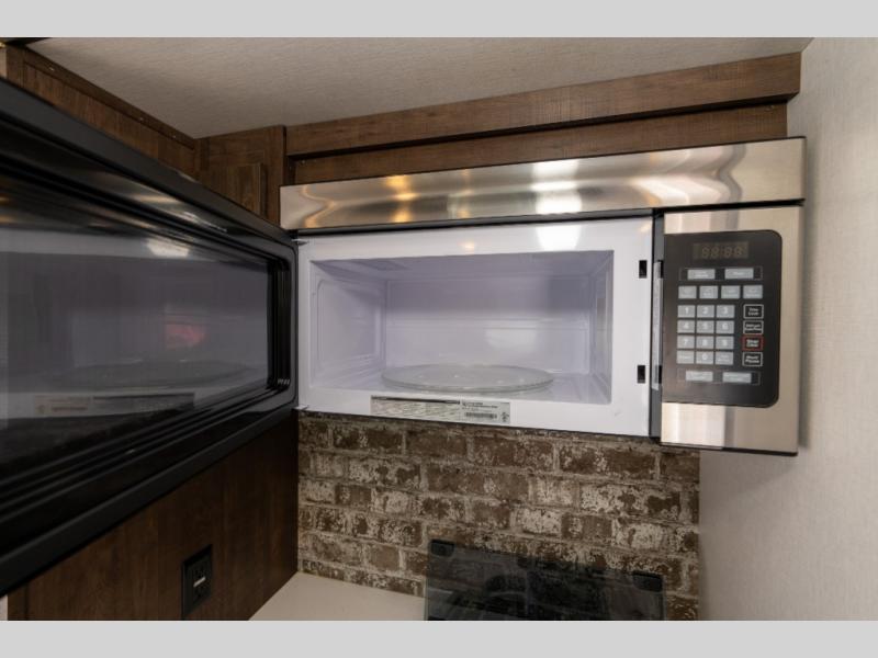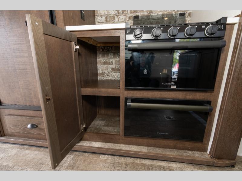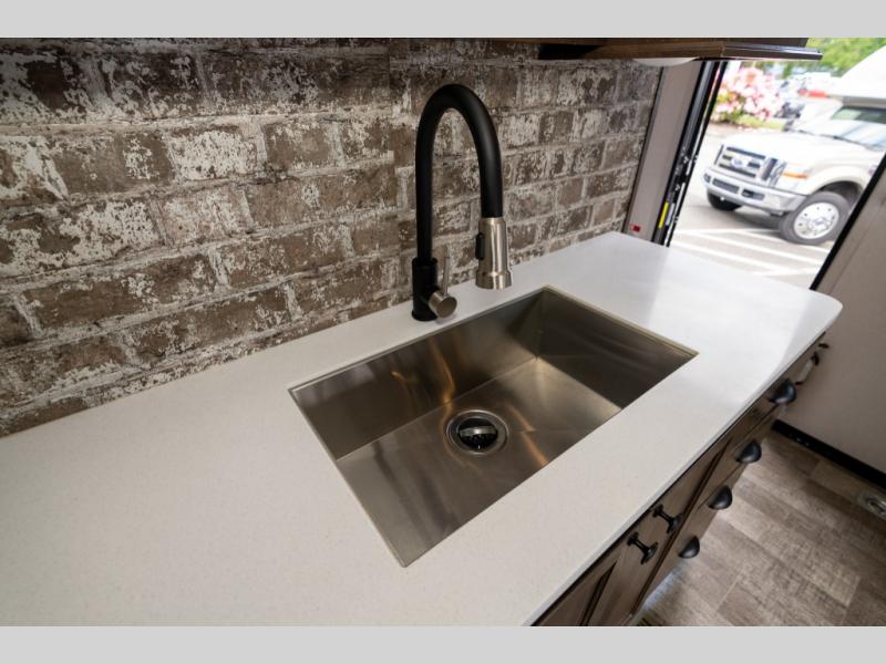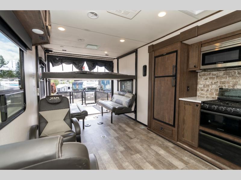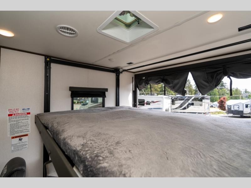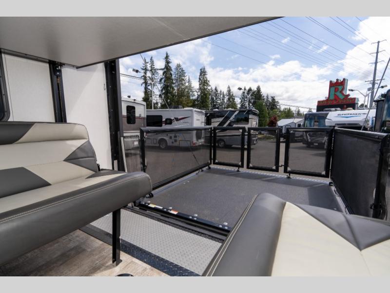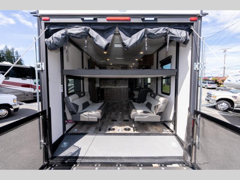 As you seek adventure with your toys, you can also require comfort in your own bedroom at the campsite! The front bedroom provides your own walk-around queen bed with dual wardrobes and windows with great views and natural lighting, plus access to the full bathroom with a radius shower. The main living and kitchen area offers two lounge chairs with end table in between to place your drinks on, dual sofas with dinettes in the rear to dine at, and a slide out with kitchen amenities plus there is extra counter space and a stainless steel single basin sink plus storage for the cook. You will love the hardwood cabinet doors, the grate style sink cover/drying rack, and the metropolitan grey countertops. And the furniture doubles as sleeping space, plus the electric bunk gives you room for two more.