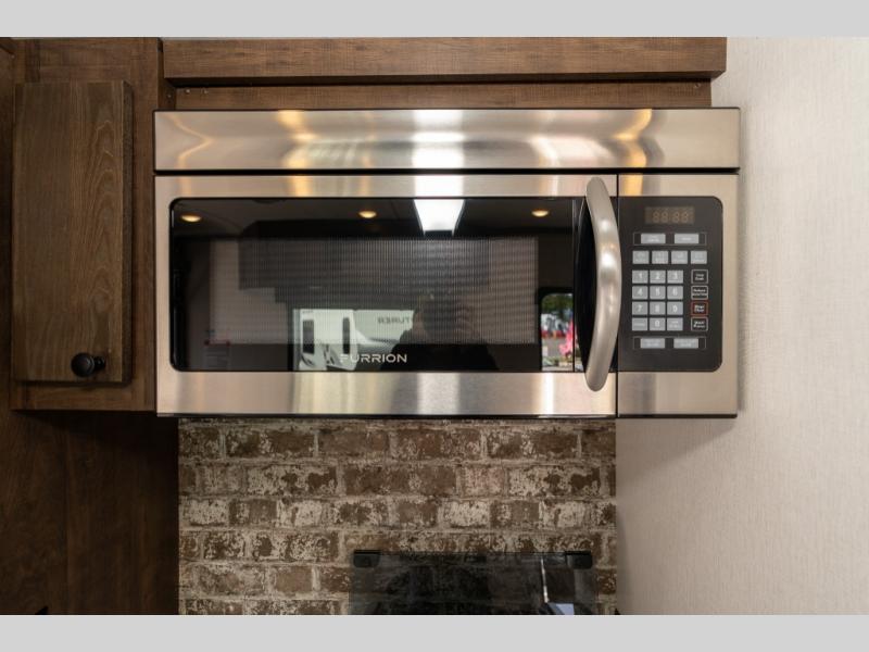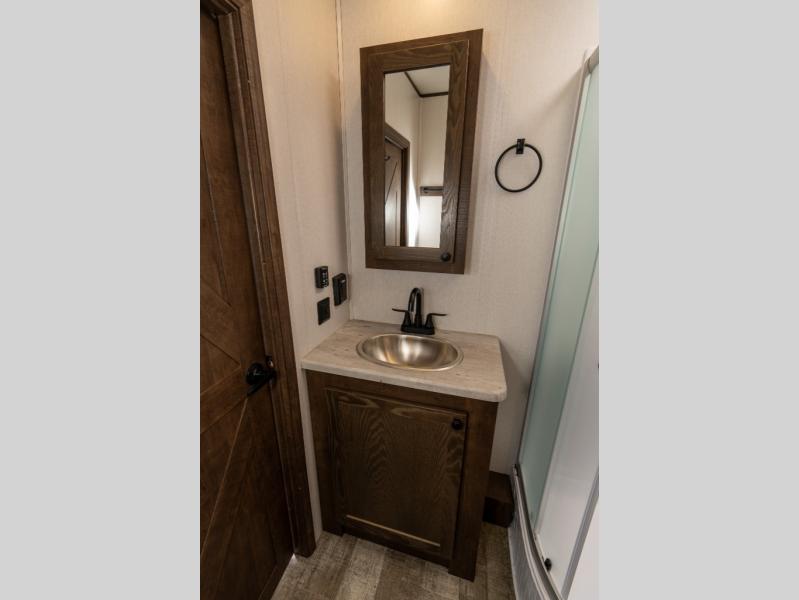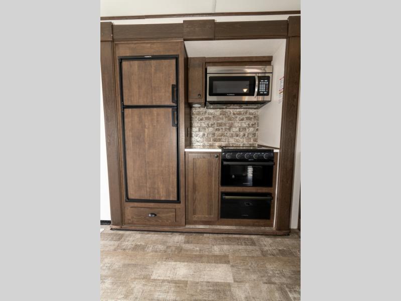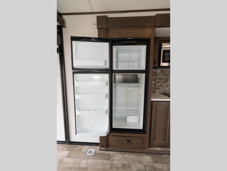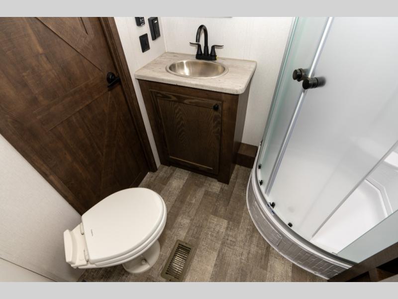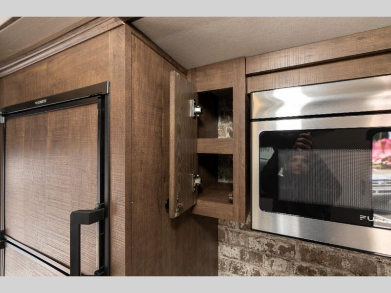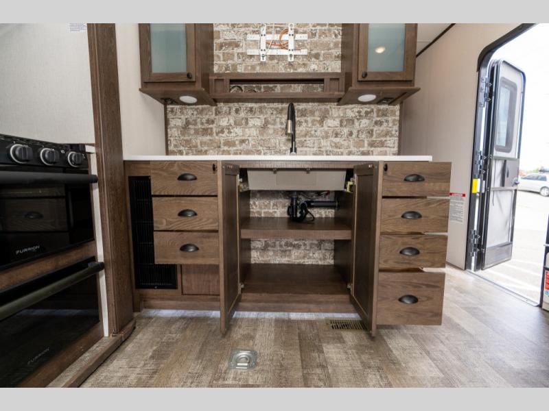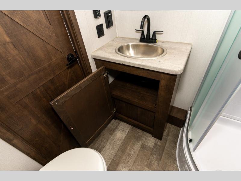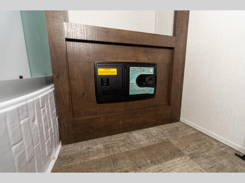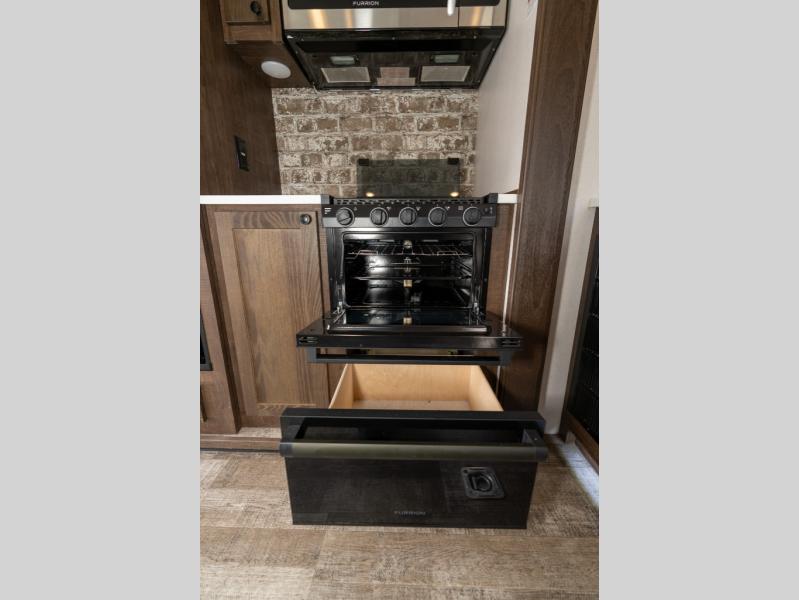 As you seek adventure with your toys, you can also require comfort in your own bedroom at the campsite! The front bedroom provides your own walk-around queen bed with dual wardrobes and windows with great views and natural lighting, plus access to the full bathroom with a radius shower. The main living and kitchen area offers two lounge chairs with end table in between to place your drinks on, dual sofas with dinettes in the rear to dine at, and a slide out with kitchen amenities plus there is extra counter space and a stainless steel single basin sink plus storage for the cook. You will love the hardwood cabinet doors, the grate style sink cover/drying rack, and the metropolitan grey countertops. And the furniture doubles as sleeping space, plus the electric bunk gives you room for two more.