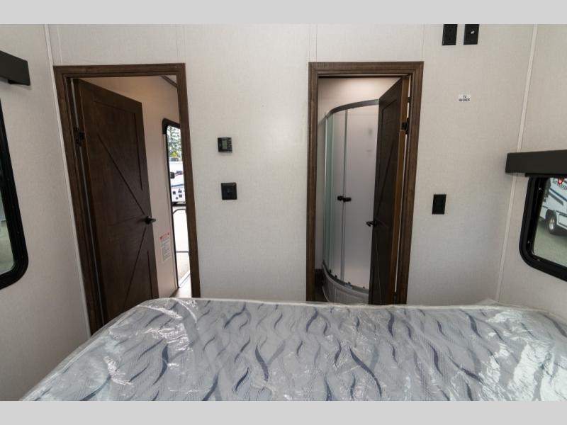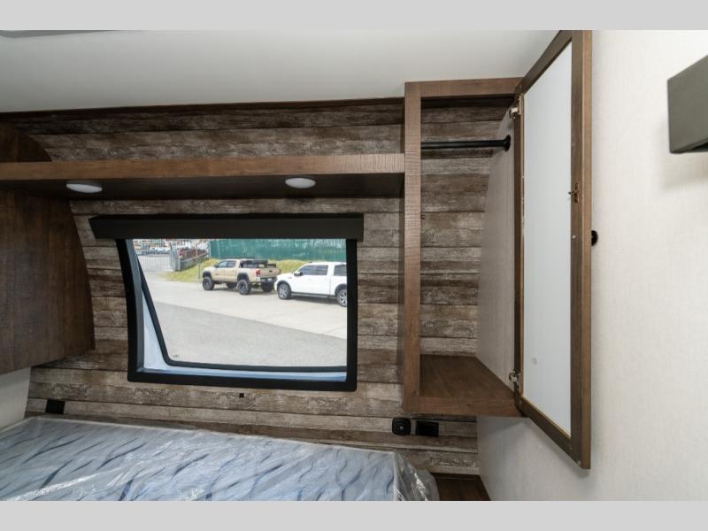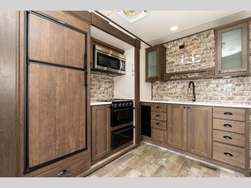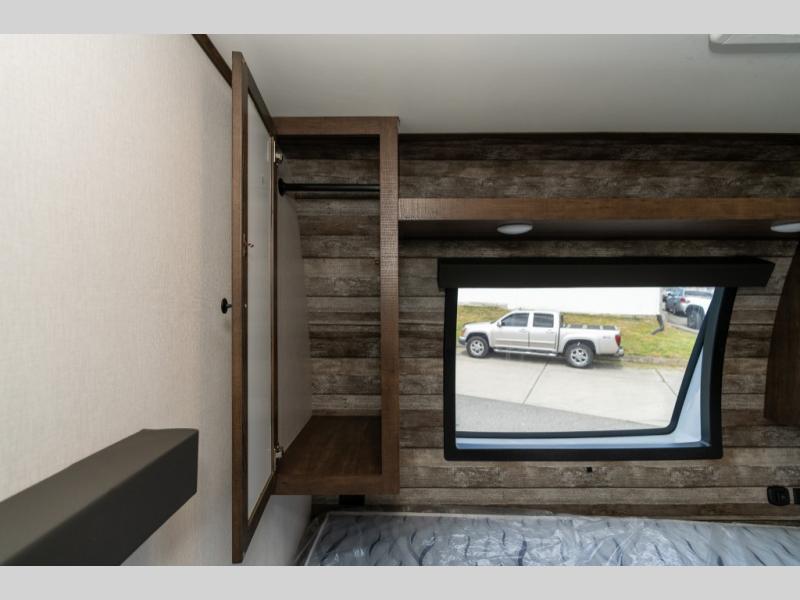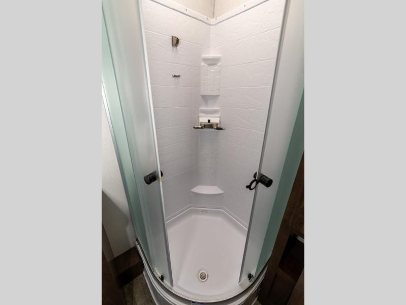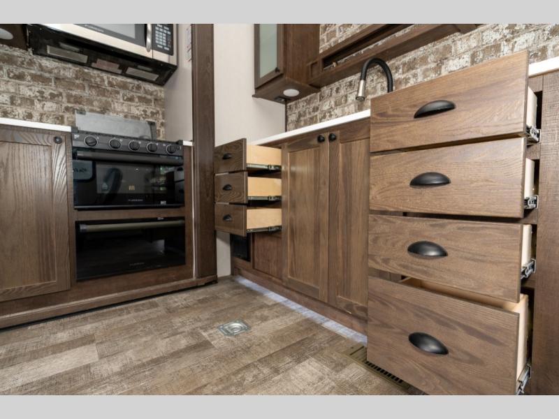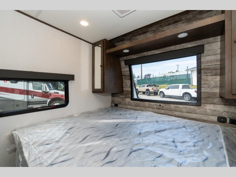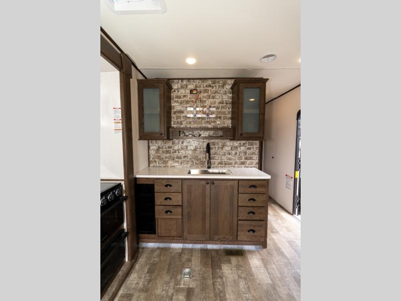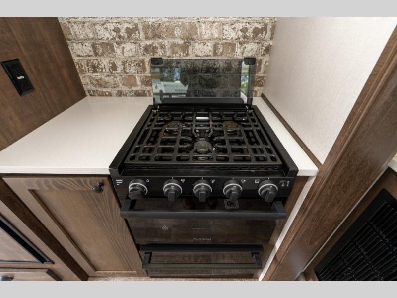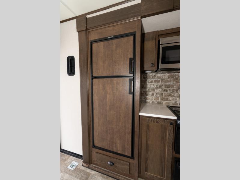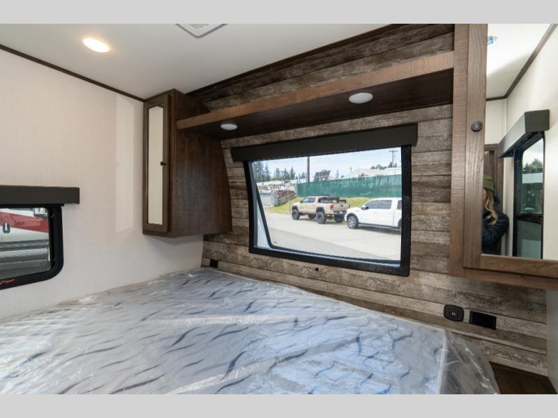 As you seek adventure with your toys, you can also require comfort in your own bedroom at the campsite! The front bedroom provides your own walk-around queen bed with dual wardrobes and windows with great views and natural lighting, plus access to the full bathroom with a radius shower. The main living and kitchen area offers two lounge chairs with end table in between to place your drinks on, dual sofas with dinettes in the rear to dine at, and a slide out with kitchen amenities plus there is extra counter space and a stainless steel single basin sink plus storage for the cook. You will love the hardwood cabinet doors, the grate style sink cover/drying rack, and the metropolitan grey countertops. And the furniture doubles as sleeping space, plus the electric bunk gives you room for two more.
