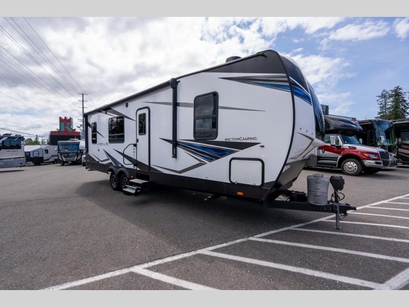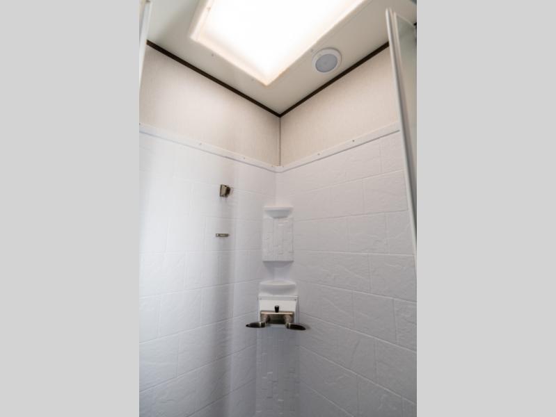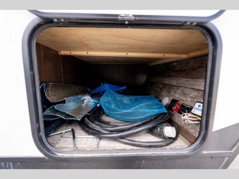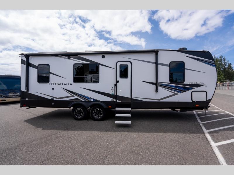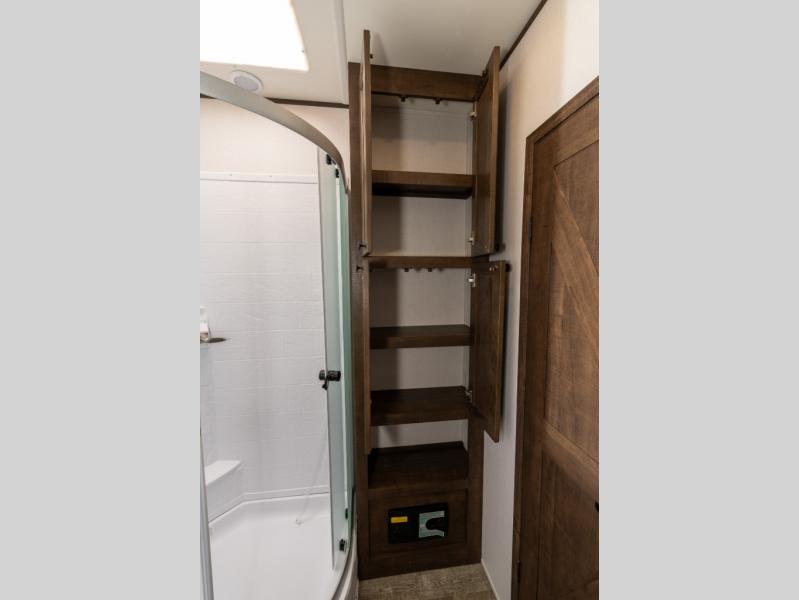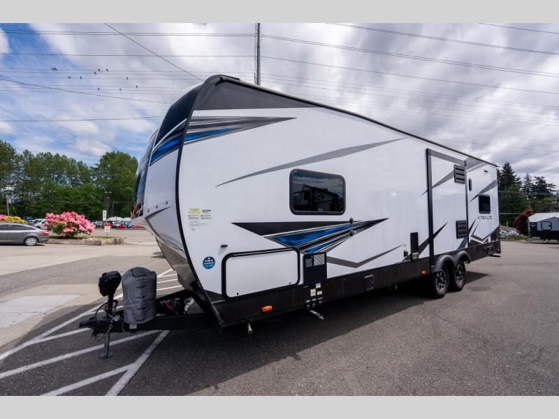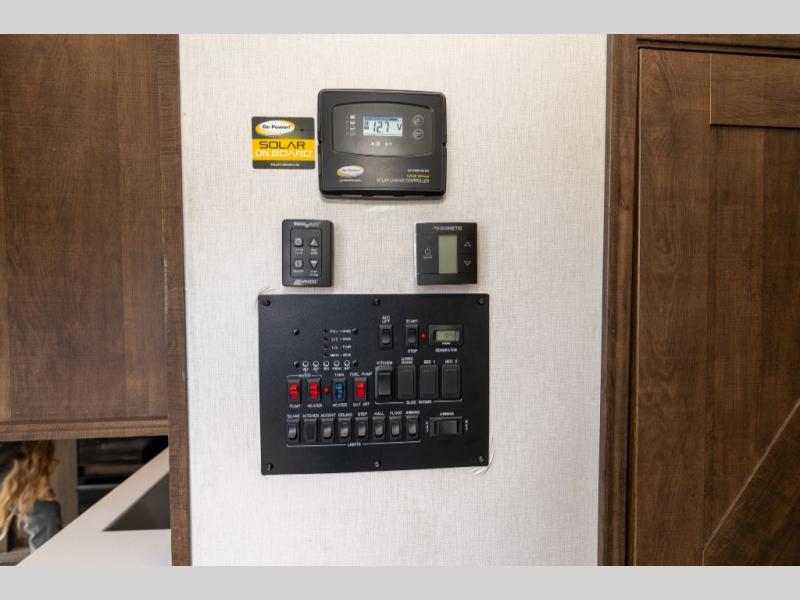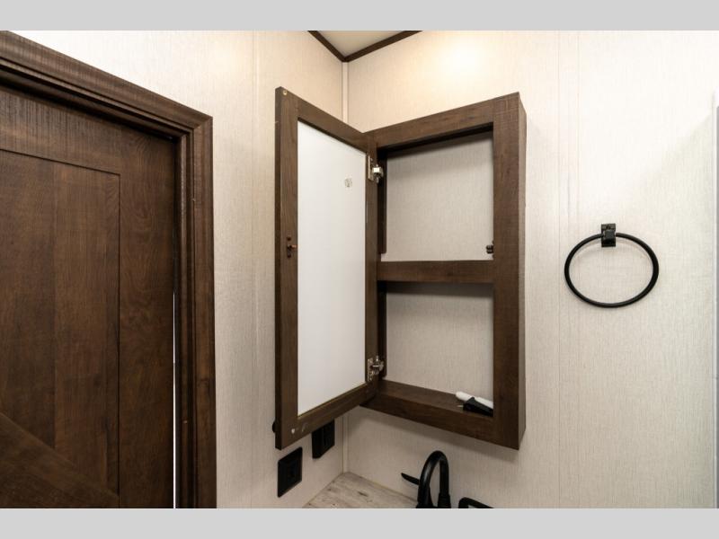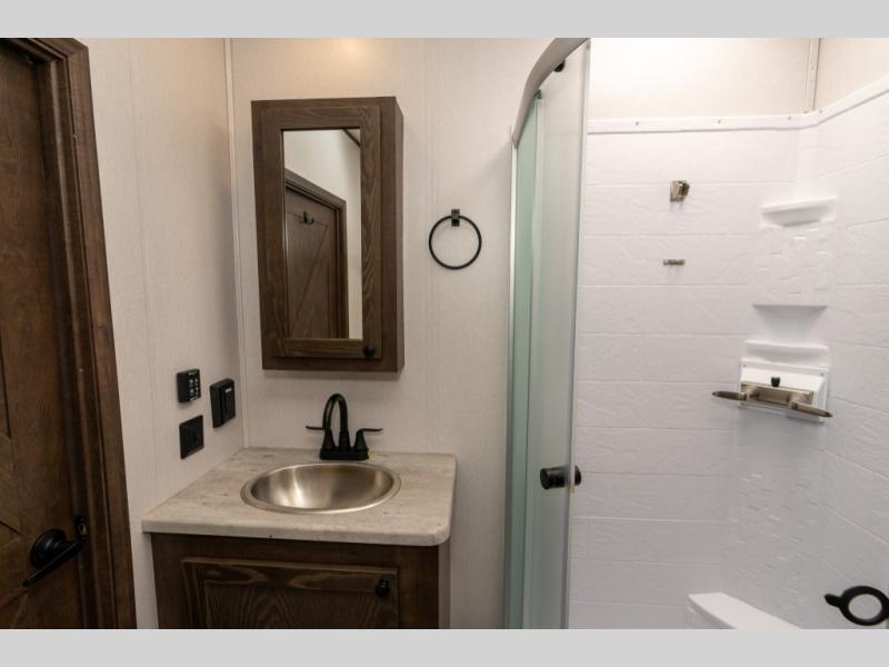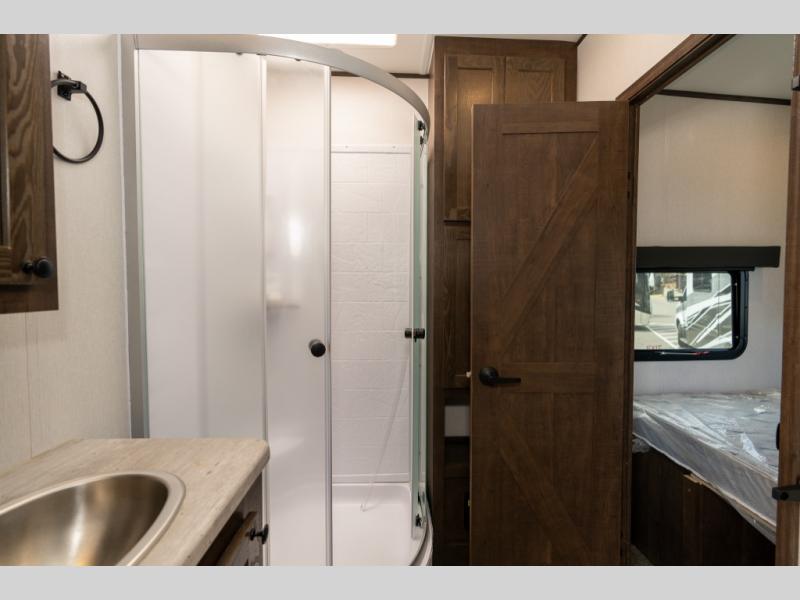 As you seek adventure with your toys, you can also require comfort in your own bedroom at the campsite! The front bedroom provides your own walk-around queen bed with dual wardrobes and windows with great views and natural lighting, plus access to the full bathroom with a radius shower. The main living and kitchen area offers two lounge chairs with end table in between to place your drinks on, dual sofas with dinettes in the rear to dine at, and a slide out with kitchen amenities plus there is extra counter space and a stainless steel single basin sink plus storage for the cook. You will love the hardwood cabinet doors, the grate style sink cover/drying rack, and the metropolitan grey countertops. And the furniture doubles as sleeping space, plus the electric bunk gives you room for two more.