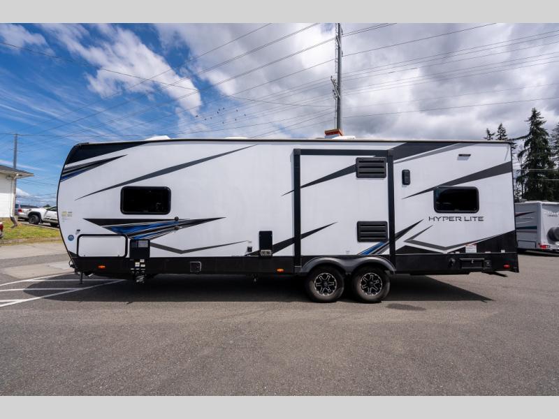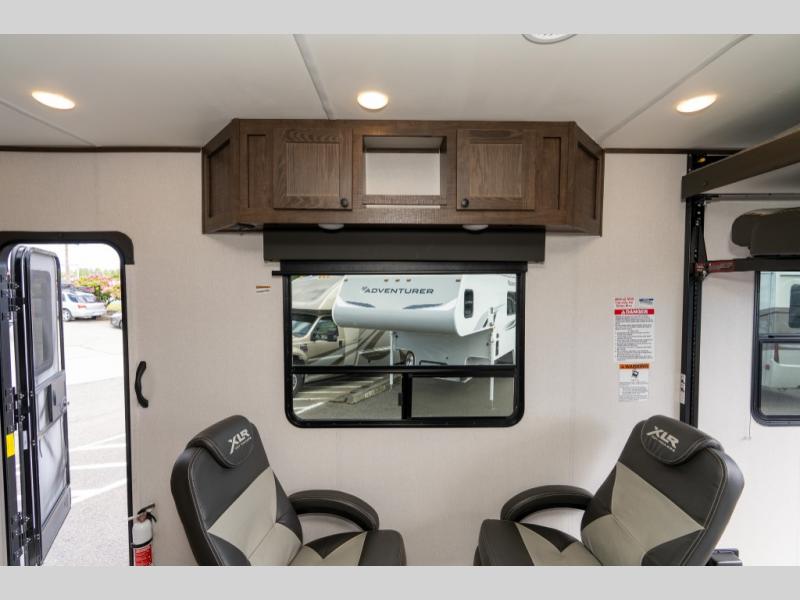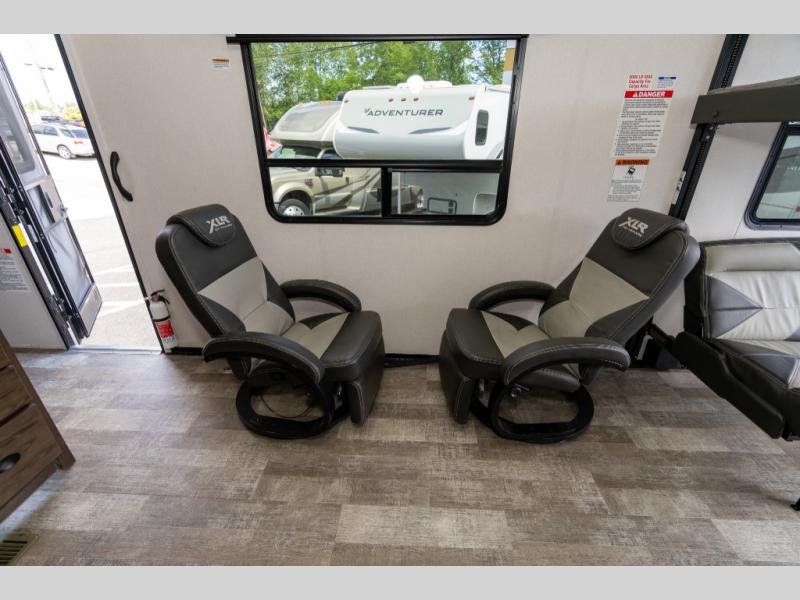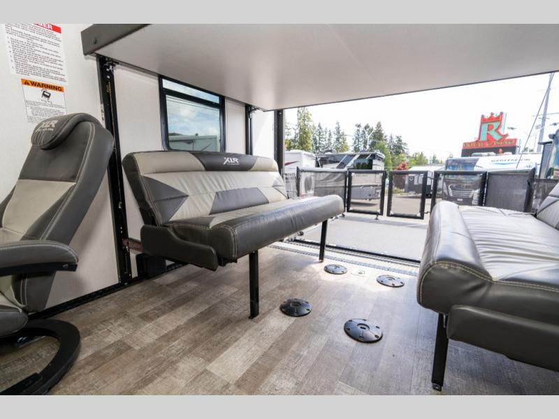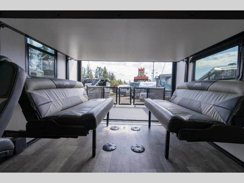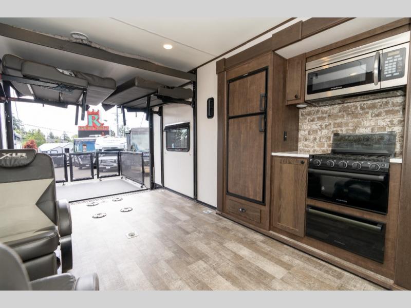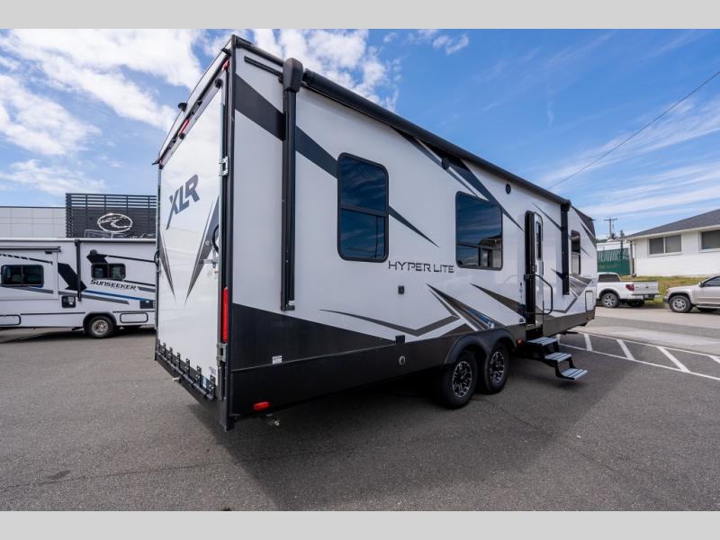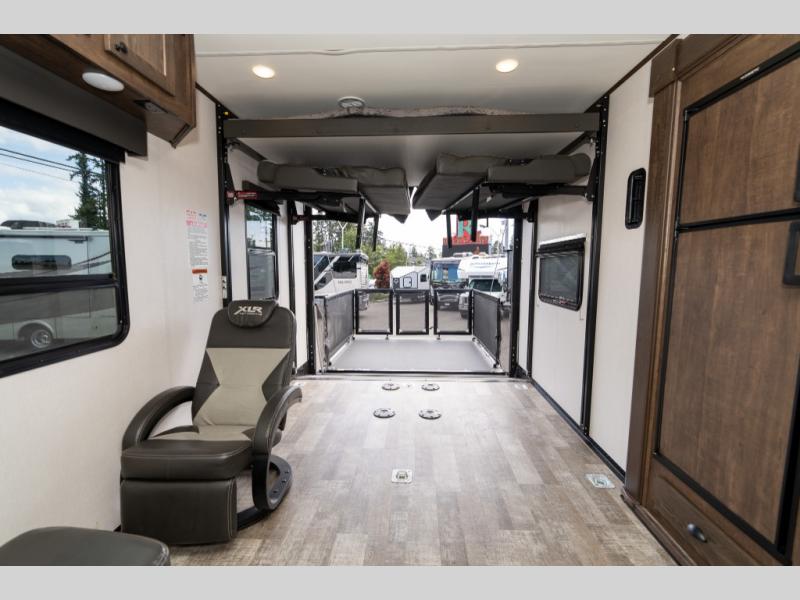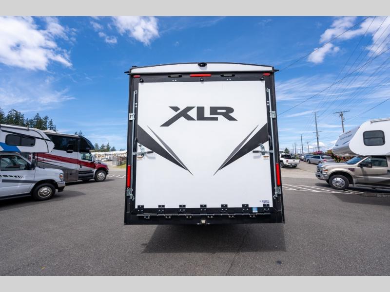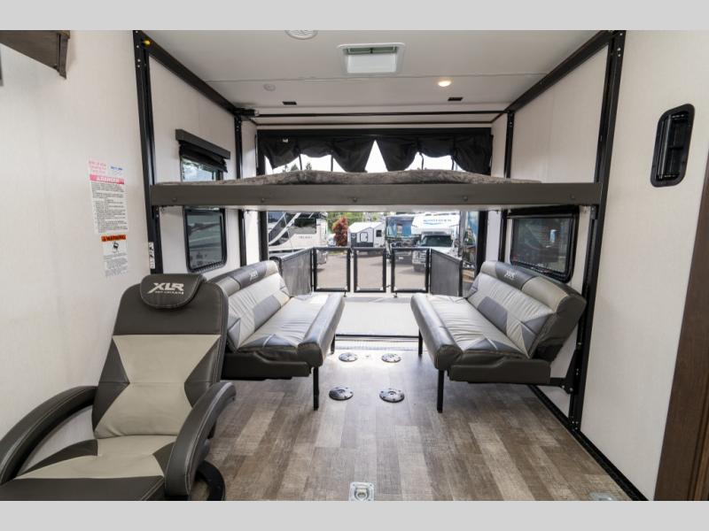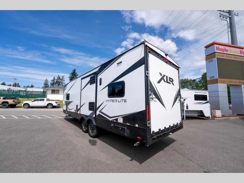 With the XLR Hyper Lite toy hauler travel trailer by Forest River, there is a wider interior with a 74" width even when the slides are retracted in so you can enjoy modern decor, at-home amenities and custom styling. The garages are spacious and include 5,000 lb. cargo tie downs that are anchored to steel plates, an insulated floor, a black rear privacy screen, a ramp patio cable kit for outdoor fun above ground, and Alumi-tread rear entry steps to mention a few highlights. More standout features include MORryde CRE3000 premium suspension that smooths out even the toughest of roads, heavy-duty Dexter axles offering the best in class carrying capacities, and the XLR fully enclosed "Body Armor" underbelly that is insulated and uses a panel system for ease of access. So when you want to play hard, choose an XLR Hyper Lite that offers upgraded features, quality construction, and allows you the control of venturing on or off road!