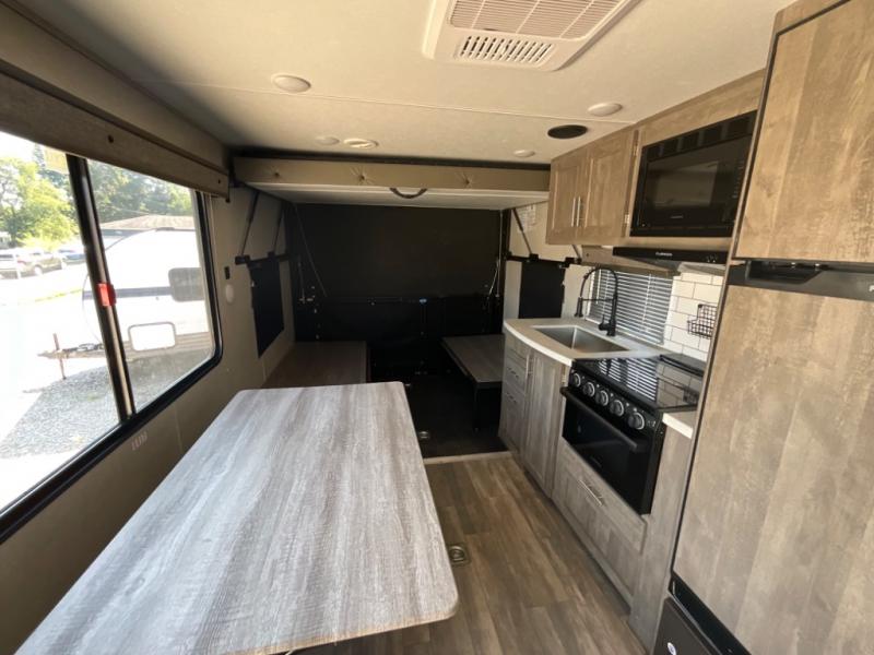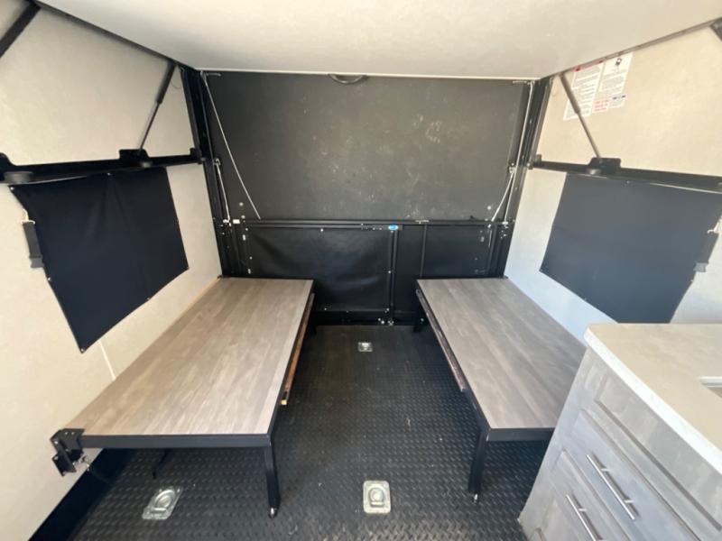 With 14' 6" total garage space, you can bring along your favorite ride-on toys for trail riding fun! Once the bikes are unloaded, set up the patio deck and relax with a cold drink. You'll also find Sit N Sleep sofas below the Sleep N Store manual bed system for more seating and sleeping space. Since this model doesn't include chairs in the main living area, you'll have more space to cook in the full kitchen, and easily head to the walk-through bath to freshen up. An RV queen bed will provide a great night's rest, and you'll find plenty of storage space for your belongings. This model also includes a 5,000 BTU fireplace, making it feel a little more like home!