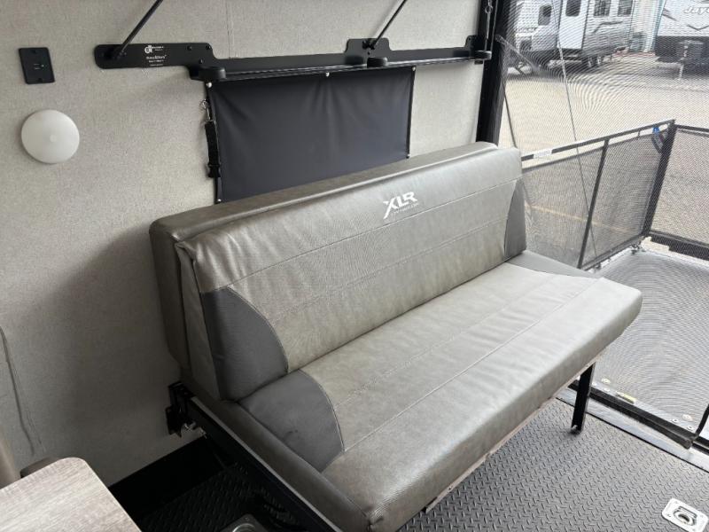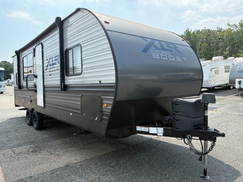 Each XLR Micro Boost toy hauler is made to last through years of use thanks to the seamless PVC roof system, the diamond plate front rock guard, and the Body Armor enclosed and insulated underbelly. You will appreciate the oil and gas resistant residential linoleum and the moisture barrier floor enclosure to keep your space clean, and the lightweight design will be perfect for smaller tow vehicles. Each model includes residential stainless steel sinks, decorative kitchen backsplash, solid core cabinet stiles, and large panoramic windows for breathtaking outdoor views. The exterior includes many convenient features to make camping easier than ever, including a pet leash for your furry friends, insulated storage doors, a hot and cold exterior shower, plus a friction hinge entry door. There is even a power awning with blue LED lights and two exterior speakers for the ultimate outdoor living space.