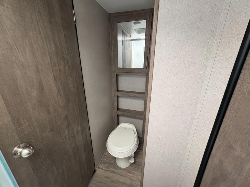 With 14' 6" total garage space, you can bring along your favorite ride-on toys for trail riding fun! Once the bikes are unloaded, set up the patio deck and relax with a cold drink. You'll also find Sit N Sleep sofas below the Sleep N Store manual bed system for more seating and sleeping space. Since this model doesn't include chairs in the main living area, you'll have more space to cook in the full kitchen, and easily head to the walk-through bath to freshen up. An RV queen bed will provide a great night's rest, and you'll find plenty of storage space for your belongings. This model also includes a 5,000 BTU fireplace, making it feel a little more like home!
