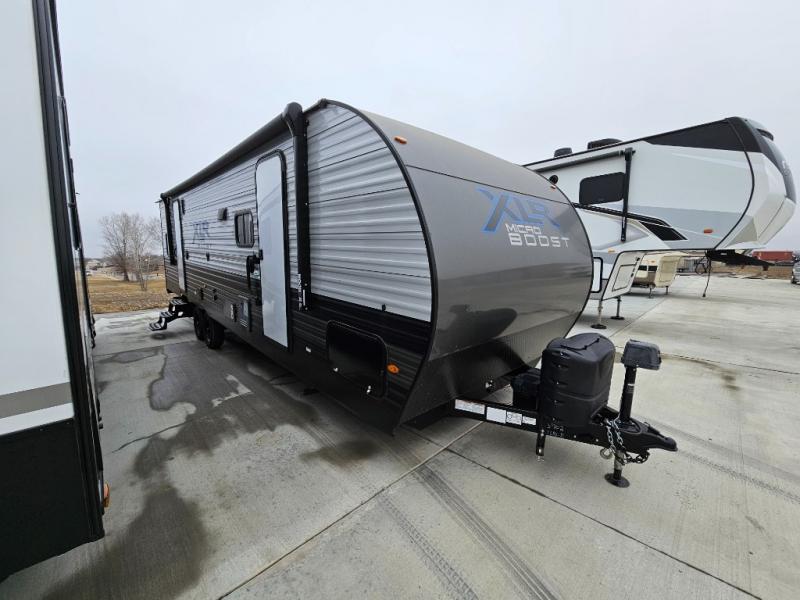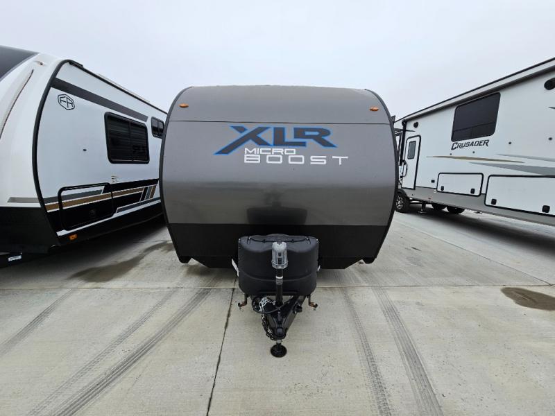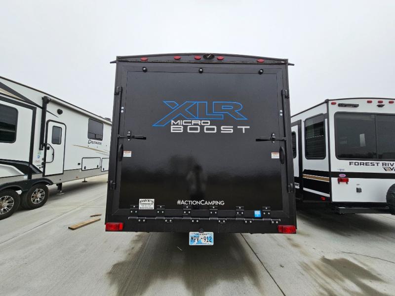 Each XLR Micro Boost toy hauler is made to last through years of use thanks to the seamless PVC roof system, the diamond plate front rock guard, and the Body Armor enclosed and insulated underbelly. You will appreciate the oil and gas resistant residential linoleum and the moisture barrier floor enclosure to keep your space clean, and the lightweight design will be perfect for smaller tow vehicles. Each model includes residential stainless steel sinks, decorative kitchen backsplash, solid core cabinet stiles, and large panoramic windows for breathtaking outdoor views. The exterior includes many convenient features to make camping easier than ever, including a pet leash for your furry friends, insulated storage doors, a hot and cold exterior shower, plus a friction hinge entry door. There is even a power awning with blue LED lights and two exterior speakers for the ultimate outdoor living space.