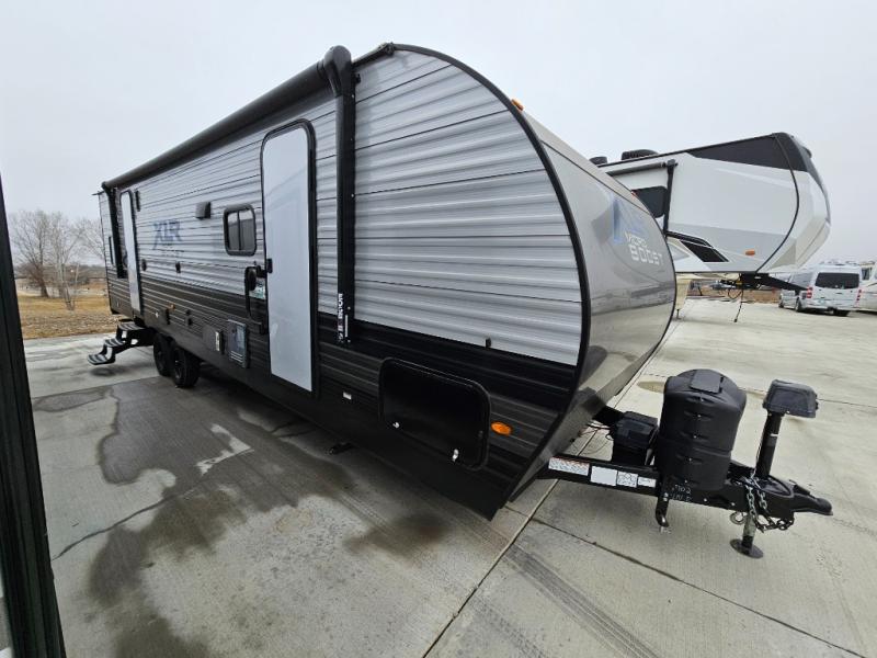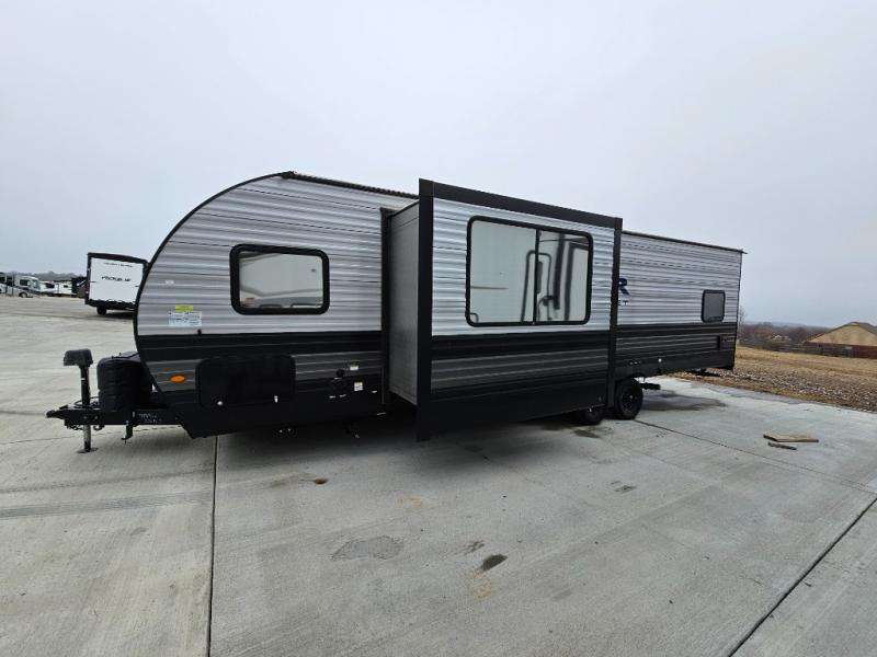 Dual entry doors in this travel trailer will make camping at your favorite state park easier than ever. Once your toys are unloaded, set up the patio deck for a cold drink. There is also Sit N Sleep sofas here and a Sleep N Store manual bed system for your guests to sleep on. Step into the walk-through bath to freshen up, then head to the full kitchen to prepare lunch on the three burner cooktop. You can relax on the theater sofa slide out, or take your plate outdoors to sit under the 15' power awning with LED lights. The RV queen bed in the front private bedroom will be calling your name after a day of fun, while your guests sleep in the separate garage. You can't beat this travel trailer!