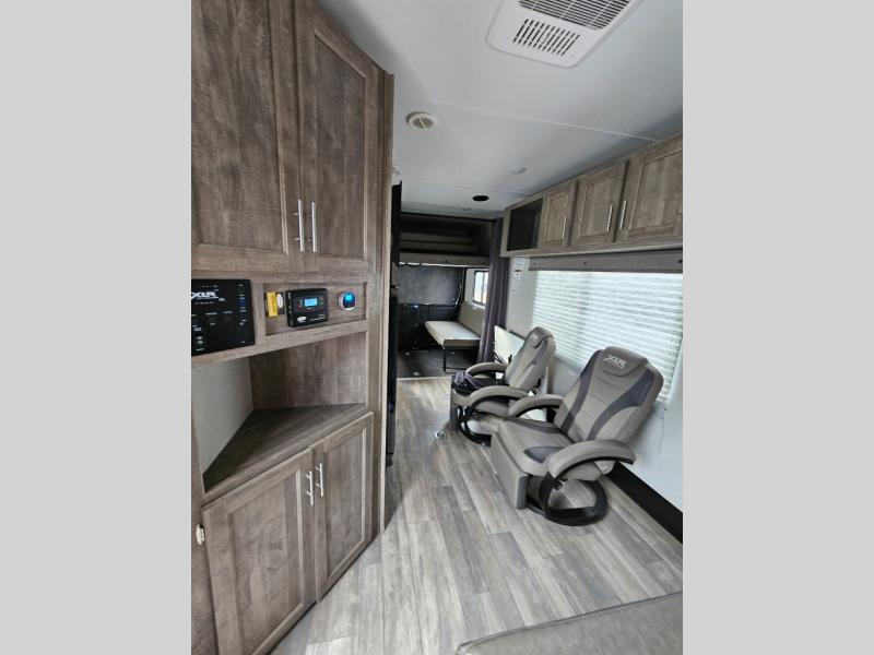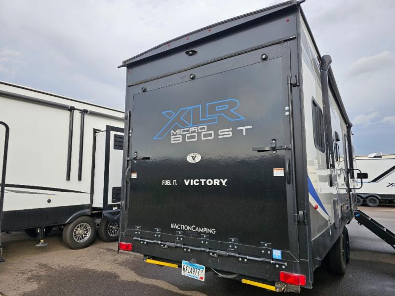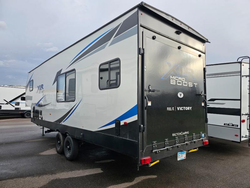 Each XLR Micro Boost toy hauler is made to last through years of use thanks to the seamless PVC roof system, the diamond plate front rock guard, and the Body Armor enclosed and insulated underbelly. You will appreciate the oil and gas resistant residential linoleum and the moisture barrier floor enclosure to keep your space clean, and the lightweight design will be perfect for smaller tow vehicles. Each model includes residential stainless steel sinks, decorative kitchen backsplash, solid core cabinet stiles, and large panoramic windows for breathtaking outdoor views. The exterior includes many convenient features to make camping easier than ever, including a pet leash for your furry friends, insulated storage doors, a hot and cold exterior shower, plus a friction hinge entry door. There is even a power awning with blue LED lights and two exterior speakers for the ultimate outdoor living space.