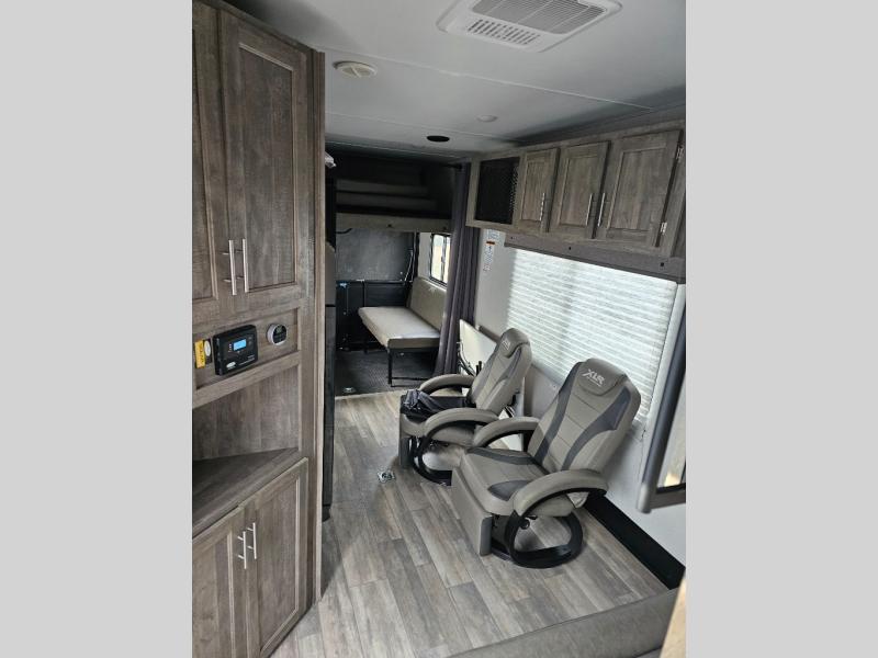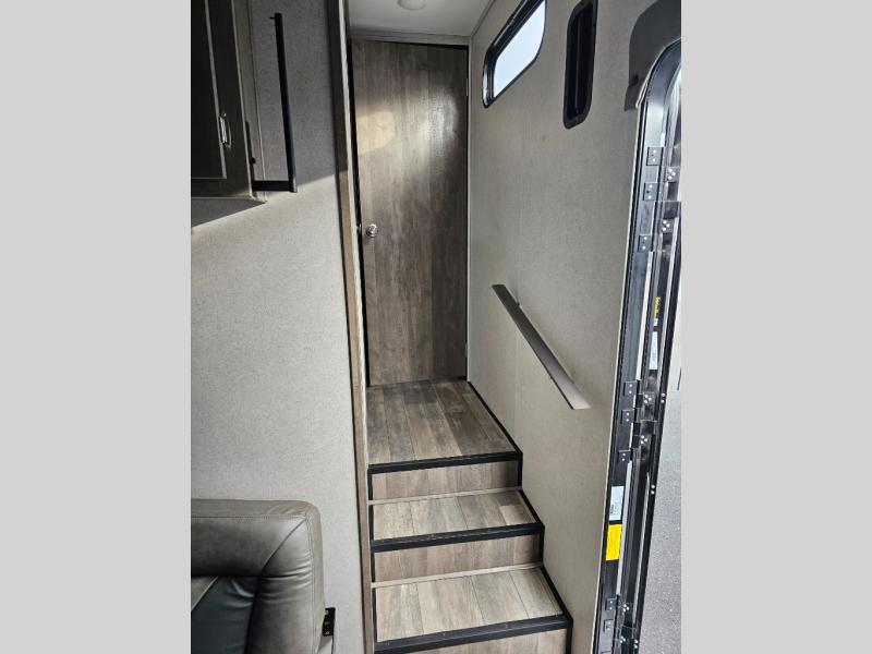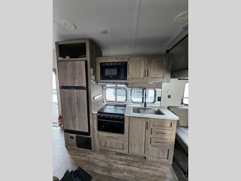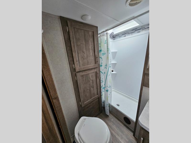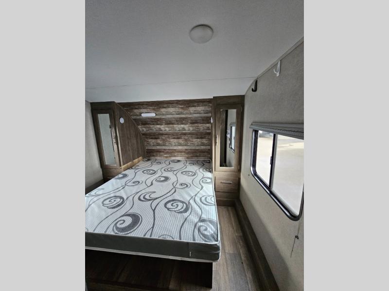 Pack your bags and head to your favorite camping spot in this fifth wheel for seven. The patio deck will be a big hit when entertaining guests, and if they decide to stay over, they can sleep on the Sleep N Store manual bed system. There are also Sit N Sleep sofas under the drop-down bed for even more sleeping space. While the chef of your group is preparing a meal on the three burner cooktop, everyone else can visit on the rollover sofa or the two barrel chairs. If you want a little more comfort, just choose the optional Euro recliners in place of the barrel chairs and you're good to go! The front private bedroom with an RV queen bed, night stands and beside shelves is sure to bring comfort, and you can clean up in the full bath before ending your day!