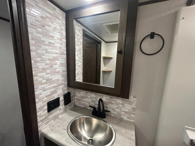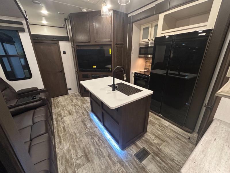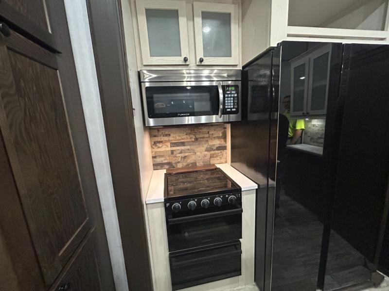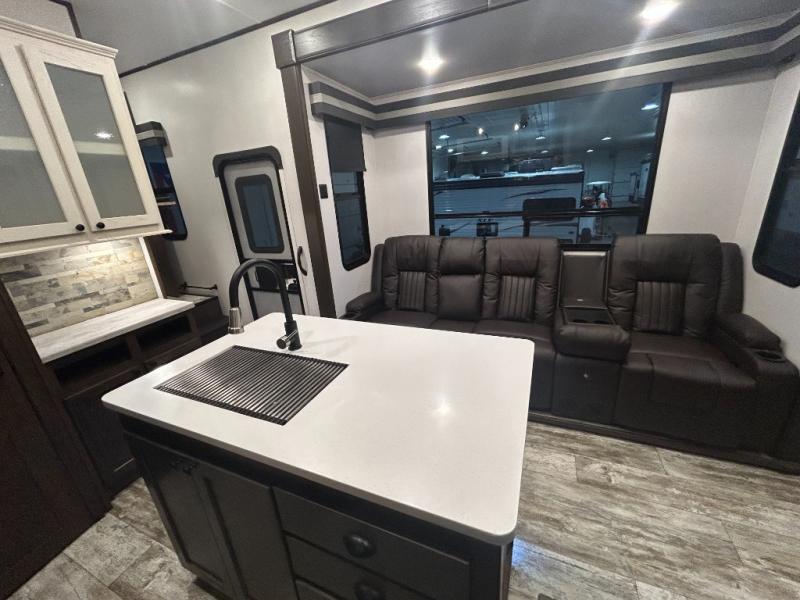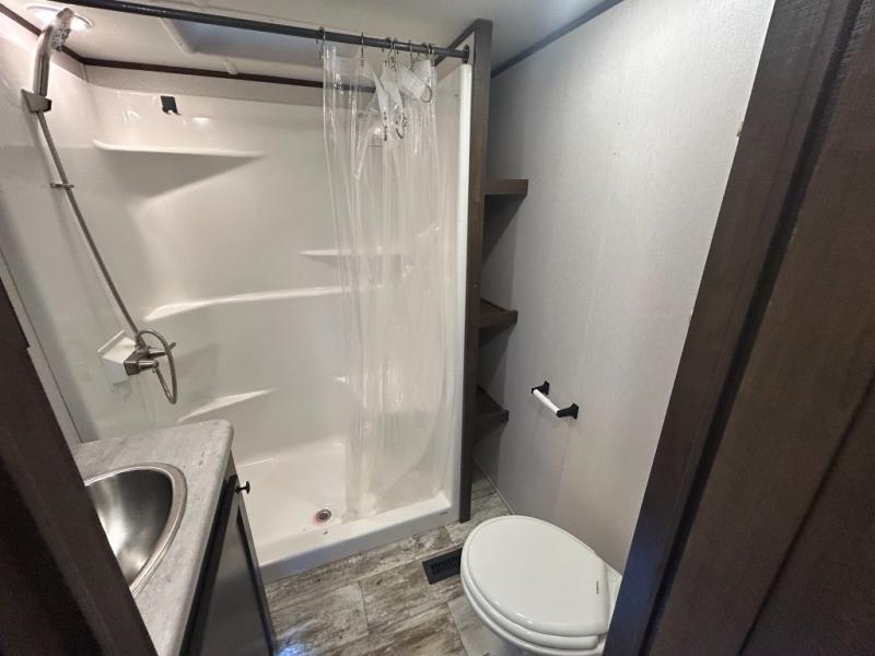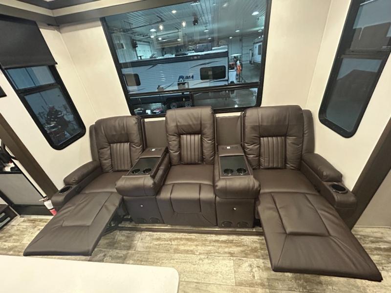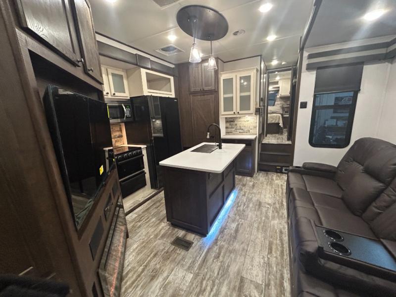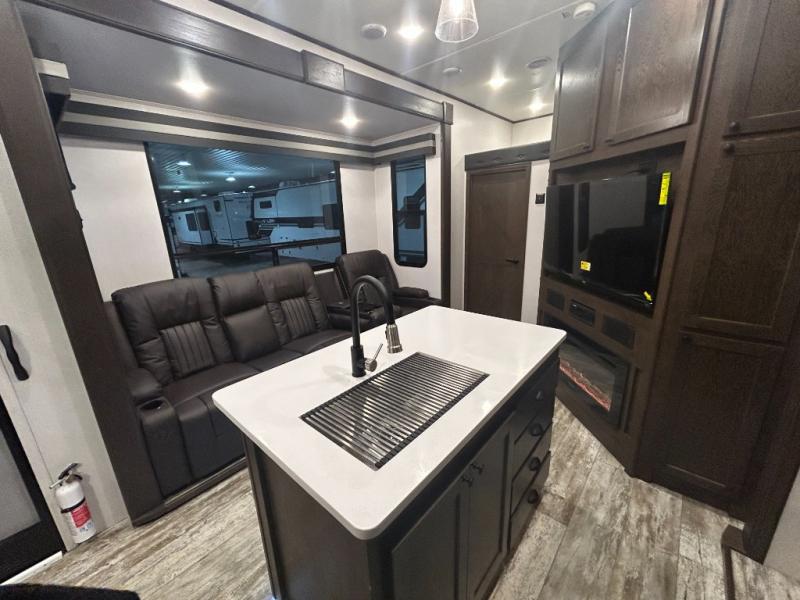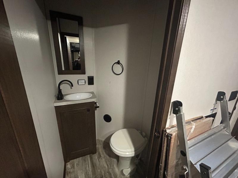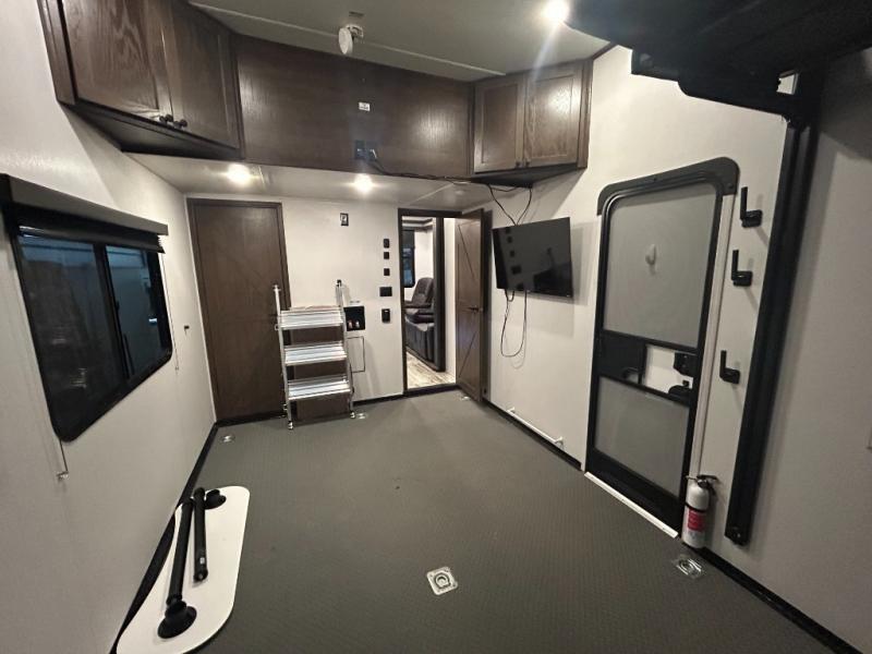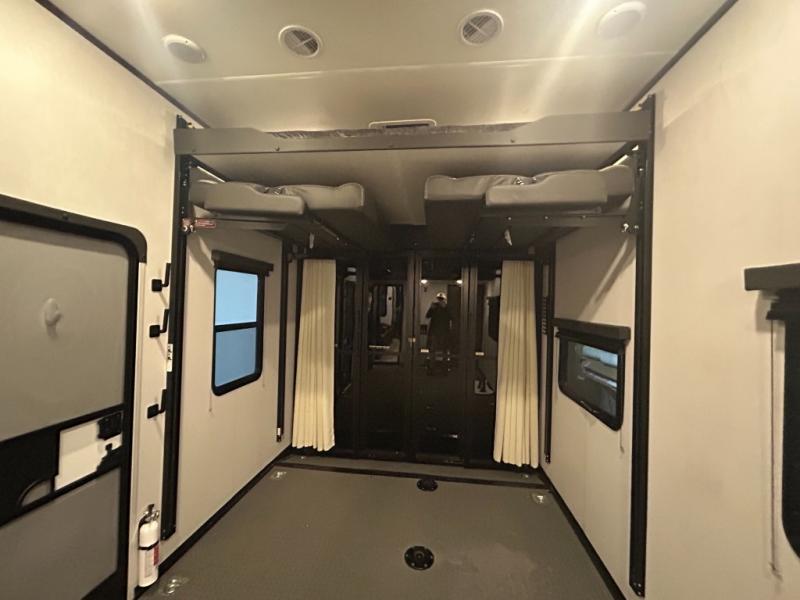 Pack your bags and load up your toys into the 15' garage area of this toy hauler with the spring assisted ramp door! The garage also has a set of opposing sofas with a table in between, a bed above them, a loft, and a half bathroom, plus one of the dual entry doors to the unit. The chef will enjoy cooking meals in the kitchen with the 17" oven, the cast iron cooktop, and the kitchen island which has two bar stools for you to sit while peeling potatoes. Relax in true comfort each night on the sofa slide across from the electric fireplace at the entertainment center which also has a 50" TV to watch your favorite movies. Clean up each morning in the full bathroom with a shower with a seat and skylight above for extra natural lighting. The front private bedroom has a king bed to lay your head on at night and a wardrobe slide to keep your clothes looking their best!