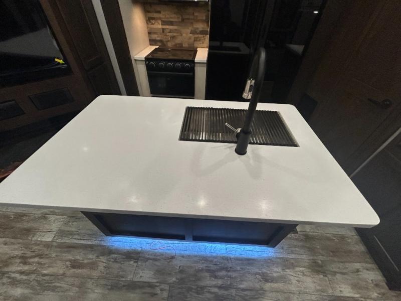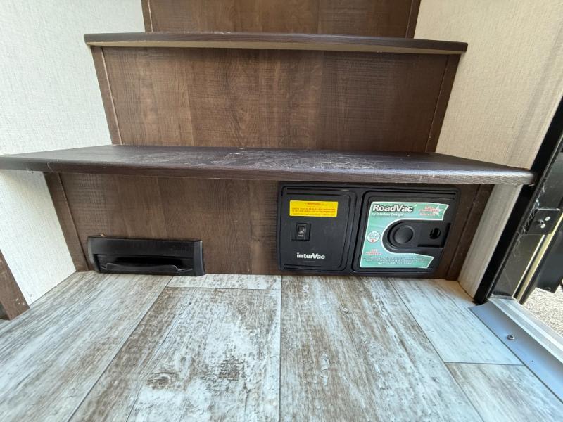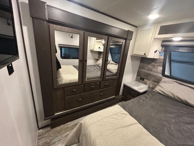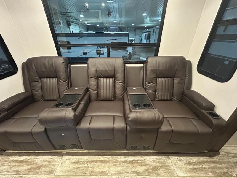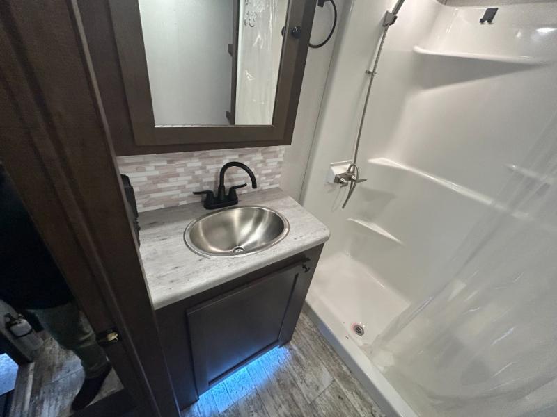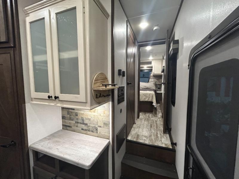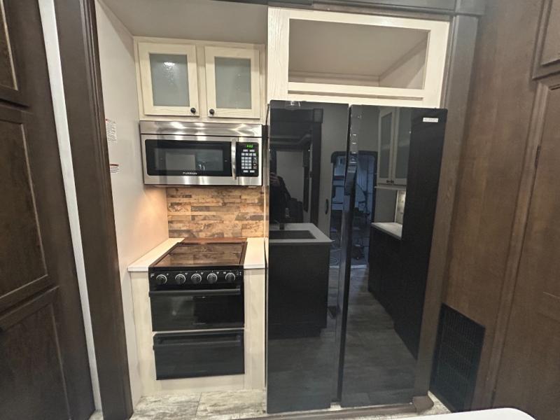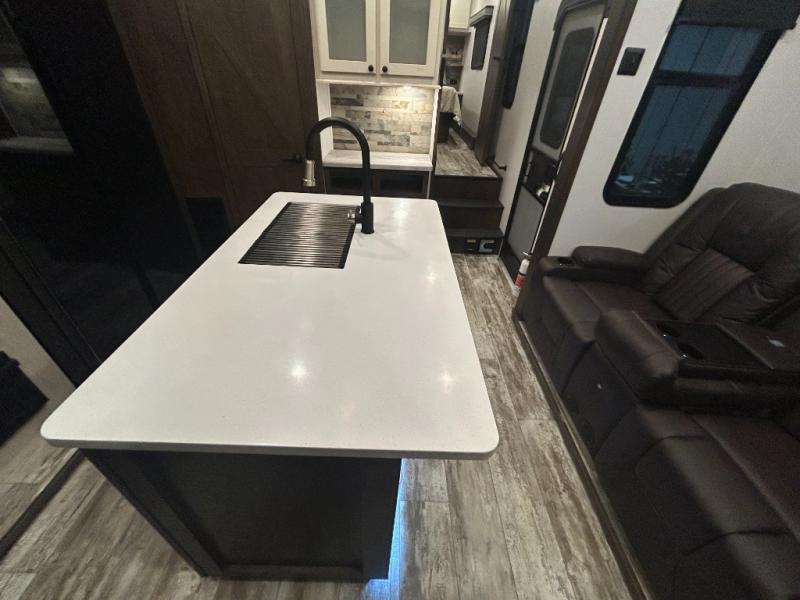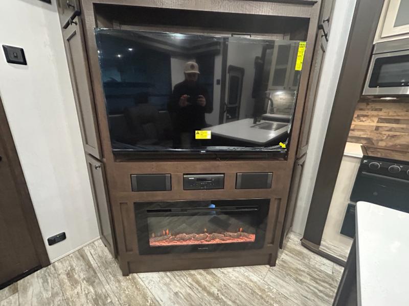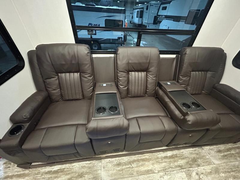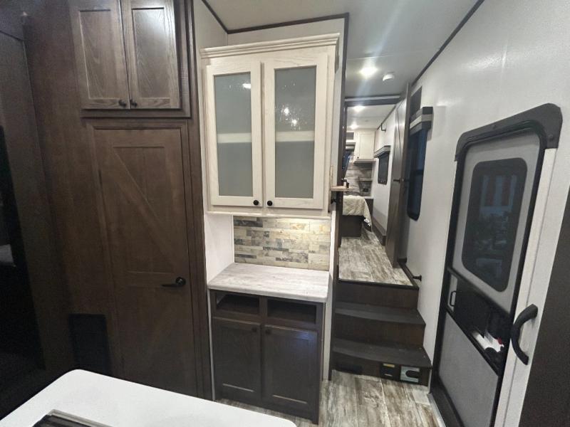 Pack your bags and load up your toys into the 15' garage area of this toy hauler with the spring assisted ramp door! The garage also has a set of opposing sofas with a table in between, a bed above them, a loft, and a half bathroom, plus one of the dual entry doors to the unit. The chef will enjoy cooking meals in the kitchen with the 17" oven, the cast iron cooktop, and the kitchen island which has two bar stools for you to sit while peeling potatoes. Relax in true comfort each night on the sofa slide across from the electric fireplace at the entertainment center which also has a 50" TV to watch your favorite movies. Clean up each morning in the full bathroom with a shower with a seat and skylight above for extra natural lighting. The front private bedroom has a king bed to lay your head on at night and a wardrobe slide to keep your clothes looking their best!
