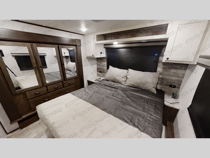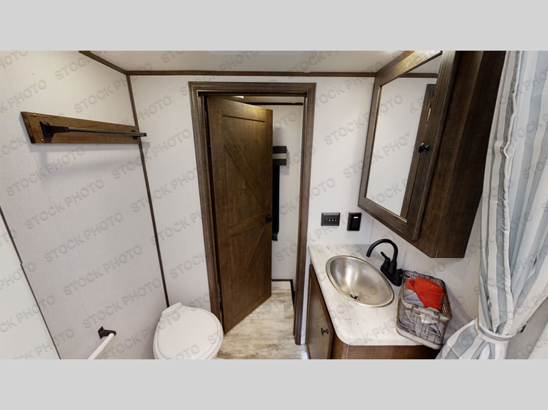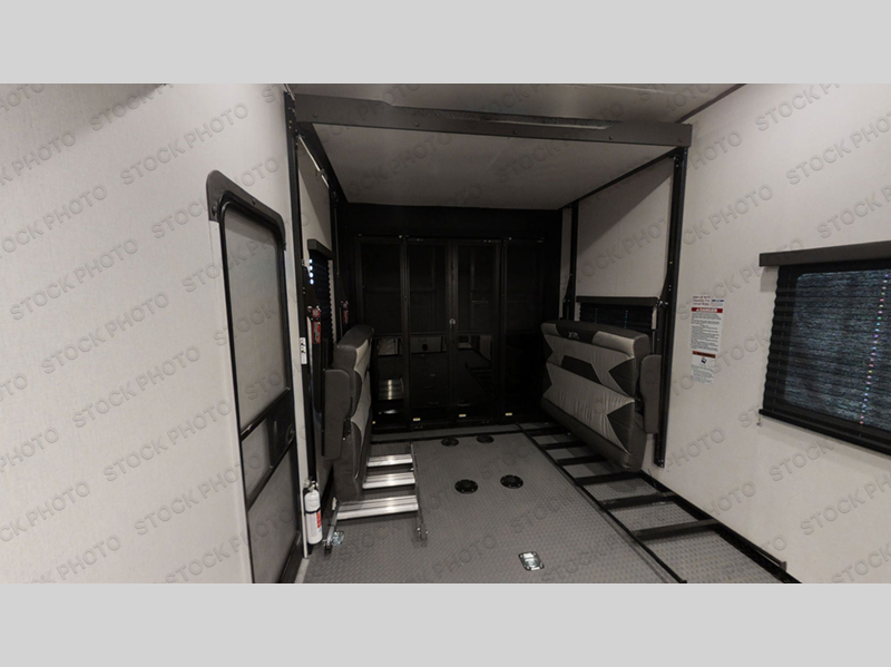Pack your bags and load up your toys into the 15' garage area of this toy hauler with the spring assisted ramp door! The garage also has a set of opposing sofas with a table in between, a bed above them, a loft, and a half bathroom, plus one of the dual entry doors to the unit. The chef will enjoy cooking meals in the kitchen with the 17" oven, the cast iron cooktop, and the kitchen island which has two bar stools for you to sit while peeling potatoes. Relax in true comfort each night on the sofa slide across from the electric fireplace at the entertainment center which also has a 50" TV to watch your favorite movies. Clean up each morning in the full bathroom with a shower with a seat and skylight above for extra natural lighting. The front private bedroom has a king bed to lay your head on at night and a wardrobe slide to keep your clothes looking their best!