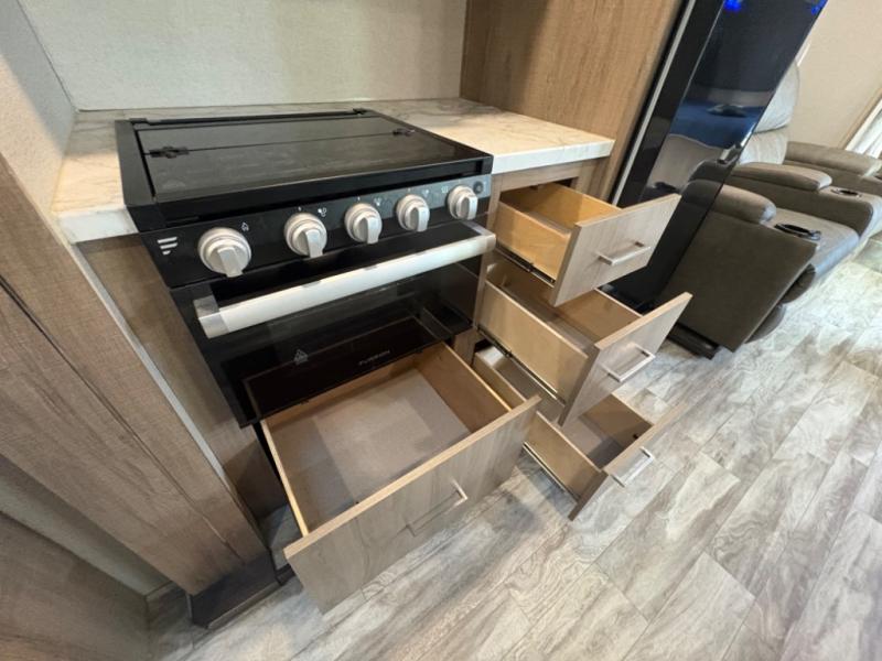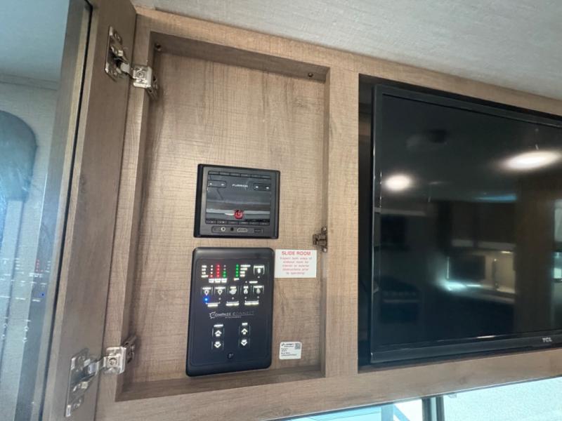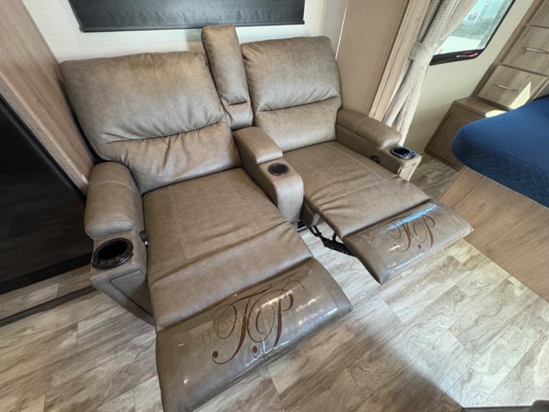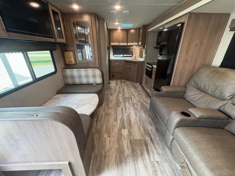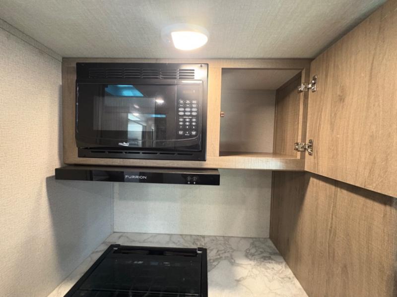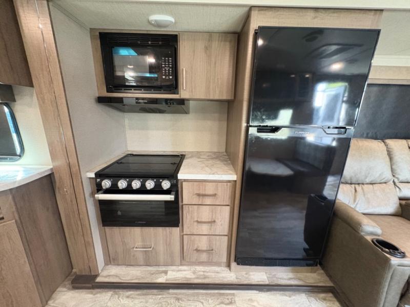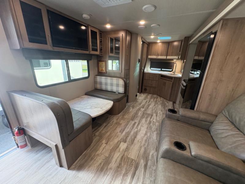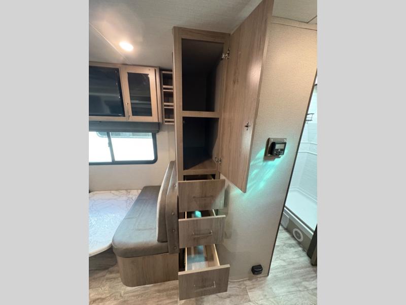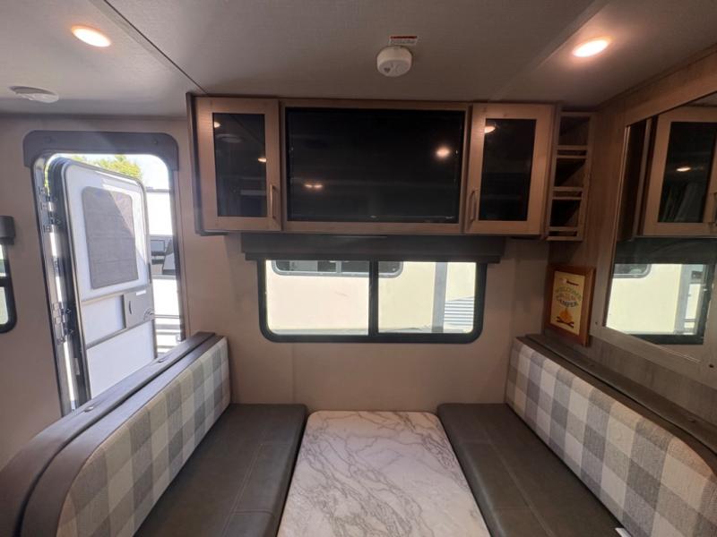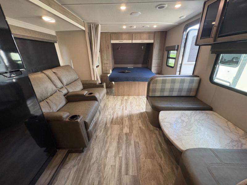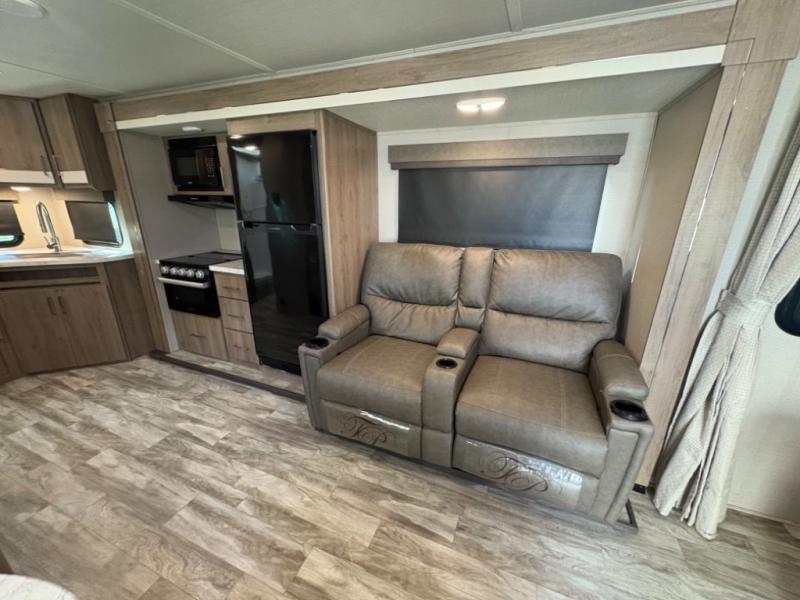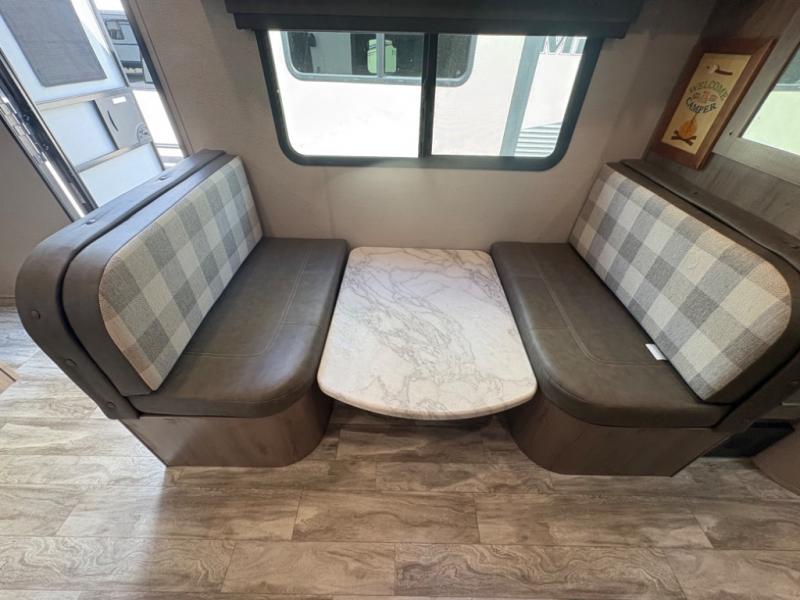 This Imagine XLS travel trailer has theater seating and a booth dinette that you can use any time you need a little break from the outdoors. If you want to come in and grab a coffee, put together a puzzle, or work on your itinerary for the week, just put up your feet and relax. You could even switch on the LED HDTV if you want a little entertainment. The front queen-size bed has a privacy curtain that you can draw to create a semi-private bedroom, and in the back of the trailer you will find the rest of your amenities, like the kitchen and the bathroom. The large slide makes it easy to enjoy spending your time indoors, but if you do want to get back outside, you can sit underneath the 18' electric awning for some shade.