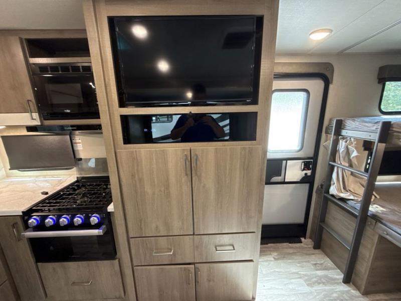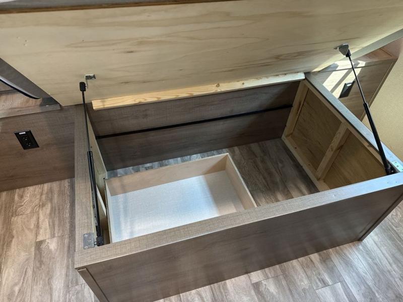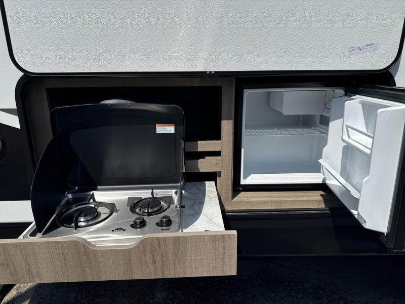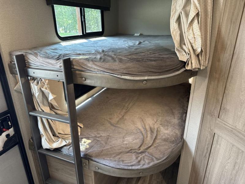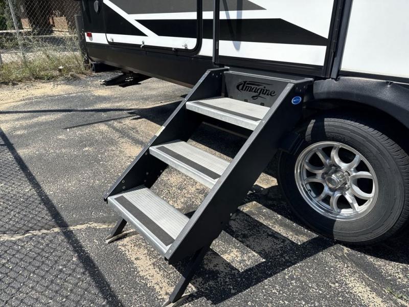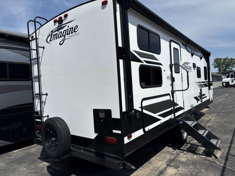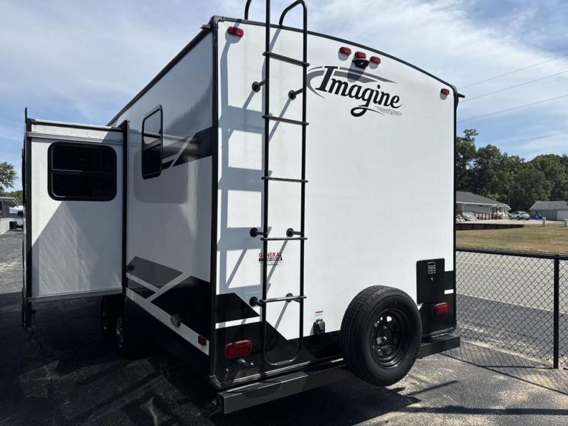 Just imagine what you can do with this Imagine travel trailer! You'll have a U-shaped dinette with removable ottoman so that you can relax in true comfort. The kitchen sits across from the dinette and includes a flip-up countertop extension for more prep space. The private bedroom includes a 60" x 80" bed with overhead cabinets and closets on either side of the bed, and the 47" x 76" bunks have privacy curtains that you can close to create a private sleeping area. You'll love having your own bathroom with 30" x 36" shower and skylight so that you don't have to wait in line to use the campsite's facilities, and you can head outside anytime to create a delicious meal at the outdoor kitchen.