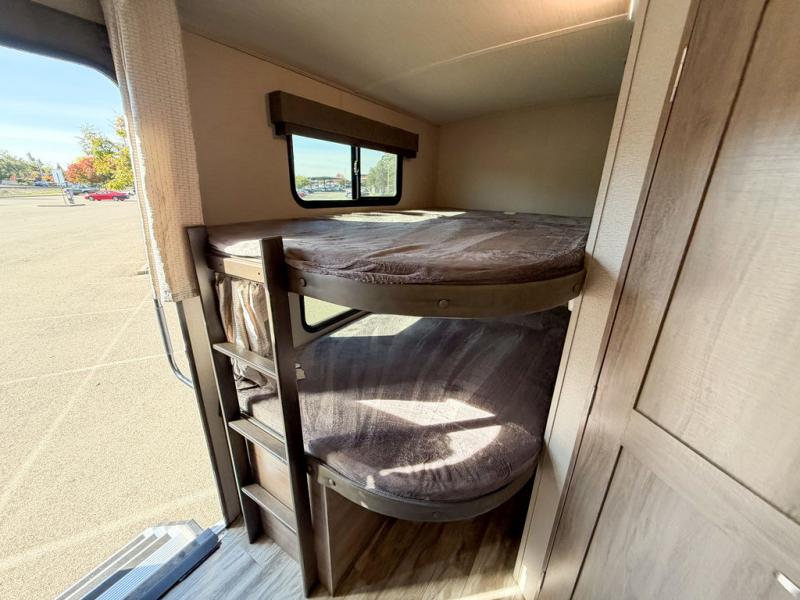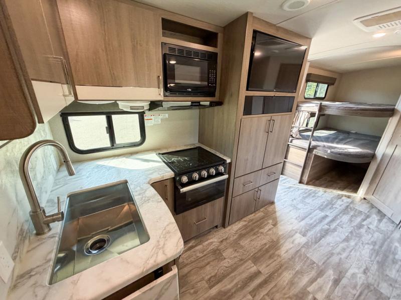Just imagine what you can do with this Imagine travel trailer! You'll have a U-shaped dinette with removable ottoman so that you can relax in true comfort. The kitchen sits across from the dinette and includes a flip-up countertop extension for more prep space. The private bedroom includes a 60" x 80" bed with overhead cabinets and closets on either side of the bed, and the 47" x 76" bunks have privacy curtains that you can close to create a private sleeping area. You'll love having your own bathroom with 30" x 36" shower and skylight so that you don't have to wait in line to use the campsite's facilities, and you can head outside anytime to create a delicious meal at the outdoor kitchen.