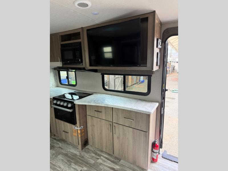 You will have an amazing amount of fun in this Imagine travel trailer! There is a tri-fold sofa and U-shaped dinette with removable ottoman that you can relax on while you watch the LED HDTV, and this trailer has two entry doors so that you can come and go as you please. The private bedroom contains the second entry door, so you can quickly head inside to grab a sweatshirt when you need one. While you're outside, you'll have a 21' power awning to protect you, and there is an exterior coax TV hookup, LP quick connect, and spray port to make your camping life easier. The interior walk-through bathroom connects the bedroom to the rest of the trailer, and the kitchen has a countertop extension so that you can chop veggies on extra counter space.