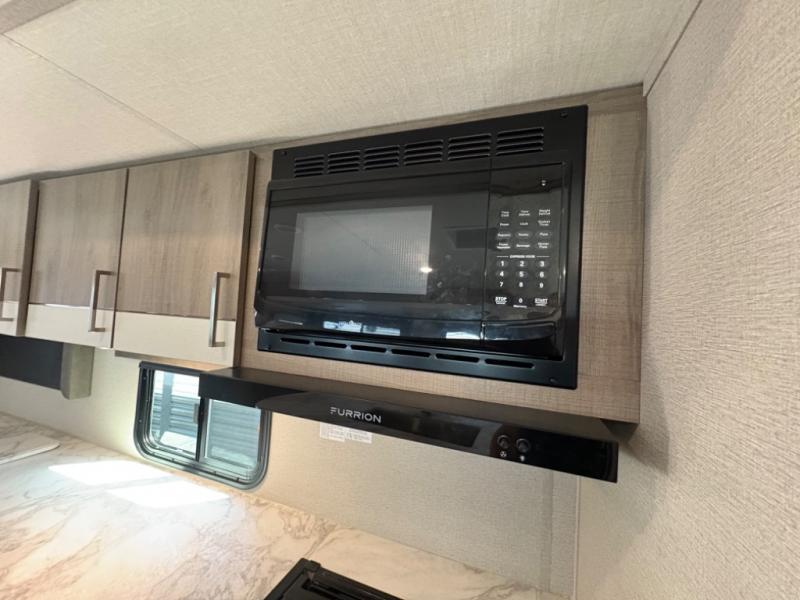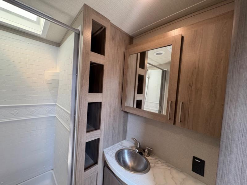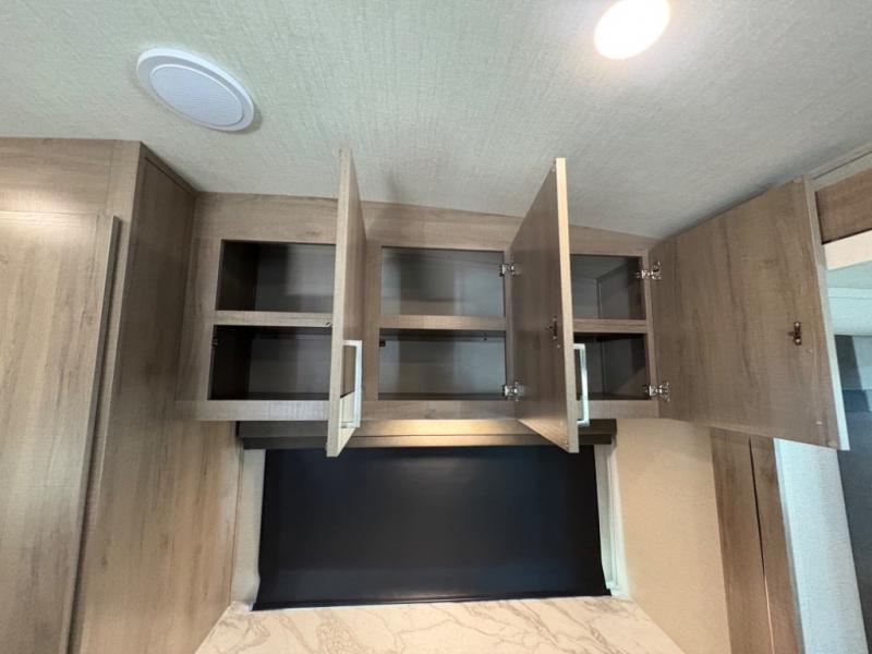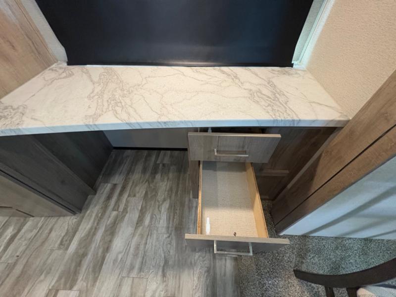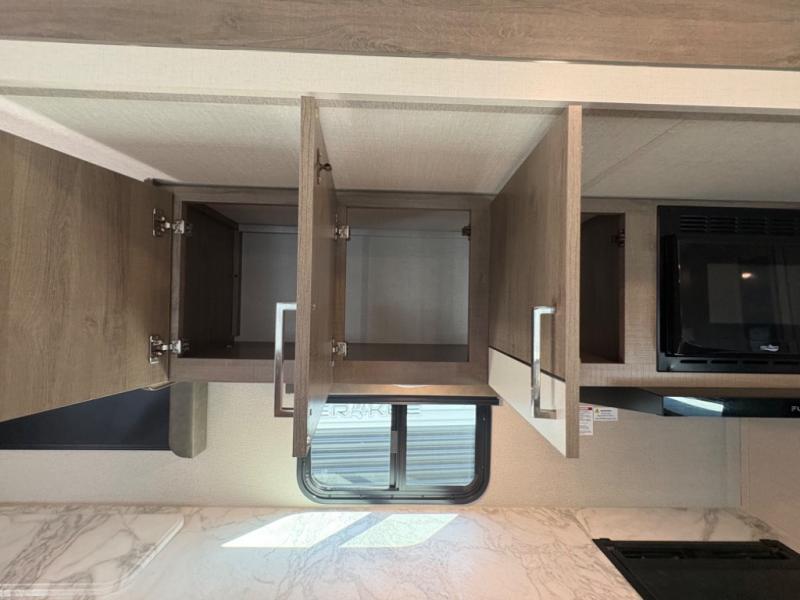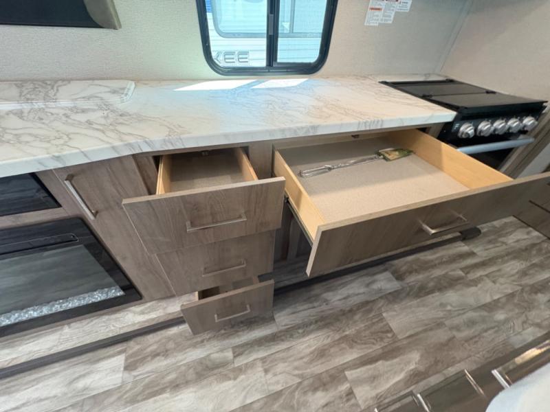 With this Imagine travel trailer, you can work while you're on the road because it offers you a desk in the main living area. You won't have to miss out on the action since you'll be right next to the booth dinette and tri-fold sofa, and there is even a pantry directly to the left of the desk for you to grab a quick snack while you're working. Once you're done with work, you can relax on the tri-fold sofa while you watch the telescoping 40" LED HDTV, and the private bedroom offers you a 60" x 80" bed to rest on when you're ready to call it a night.