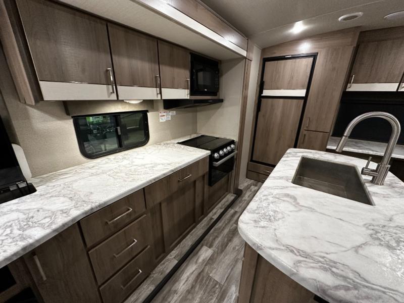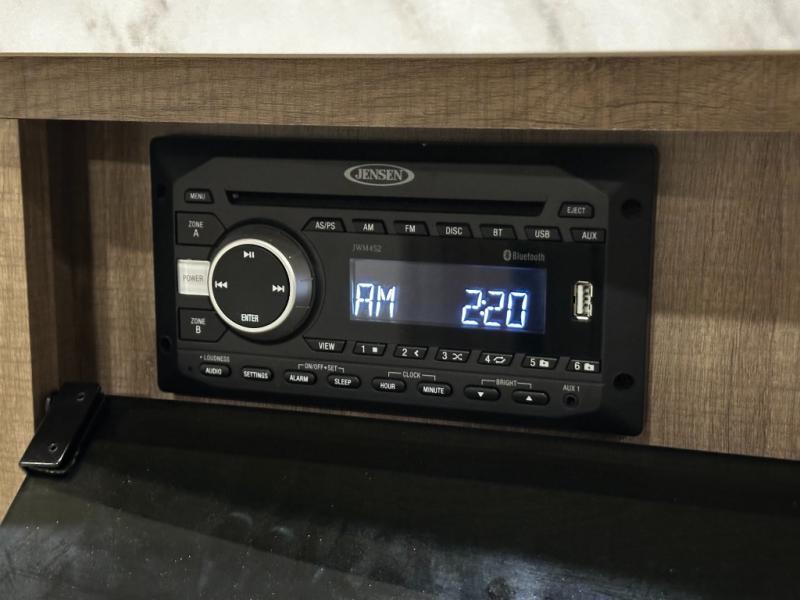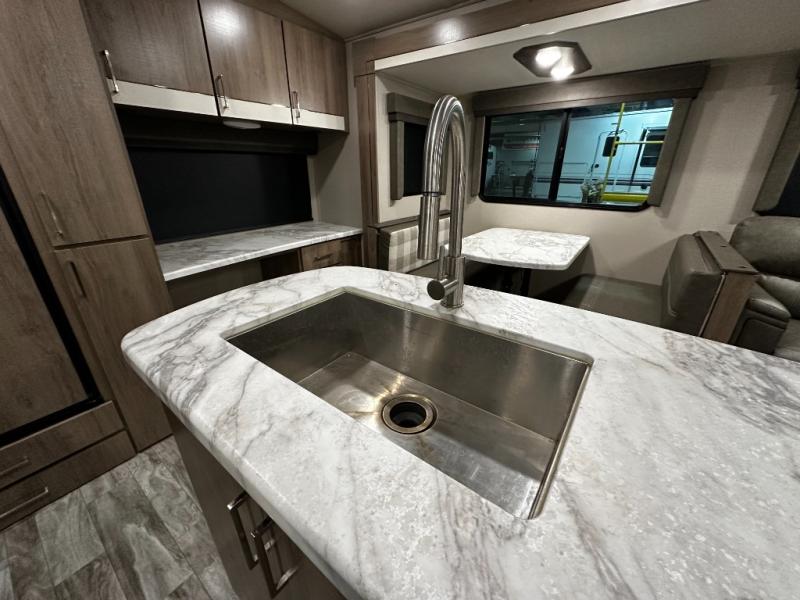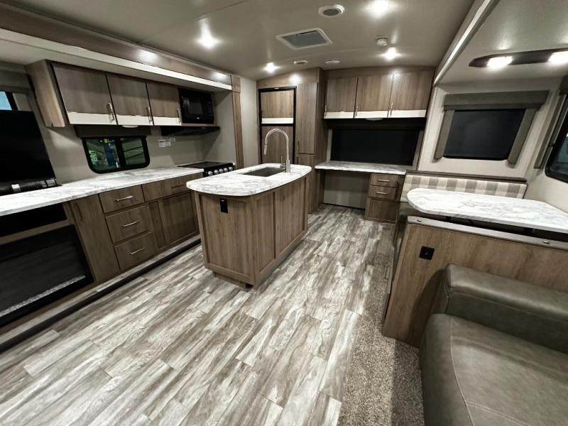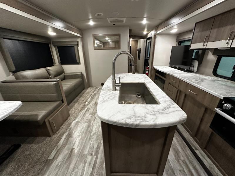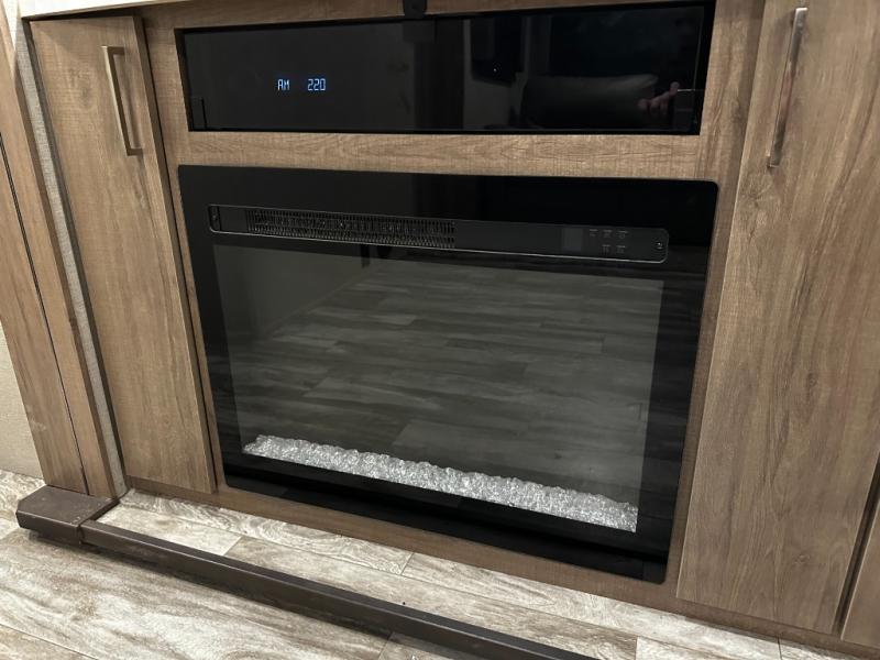 Step inside and you’ll appreciate the thoughtful layout designed with both comfort and convenience in mind. A large kitchen island makes meal prep a joy and doubles as a gathering spot for friends and family. A dedicated desk area lets you stay productive while traveling, whether you’re checking email or planning your next destination. Relax on the tri-fold sofa or at the booth dinette, enjoy the warmth of the fireplace, or watch your favorite show on the telescoping 40" LED HDTV.