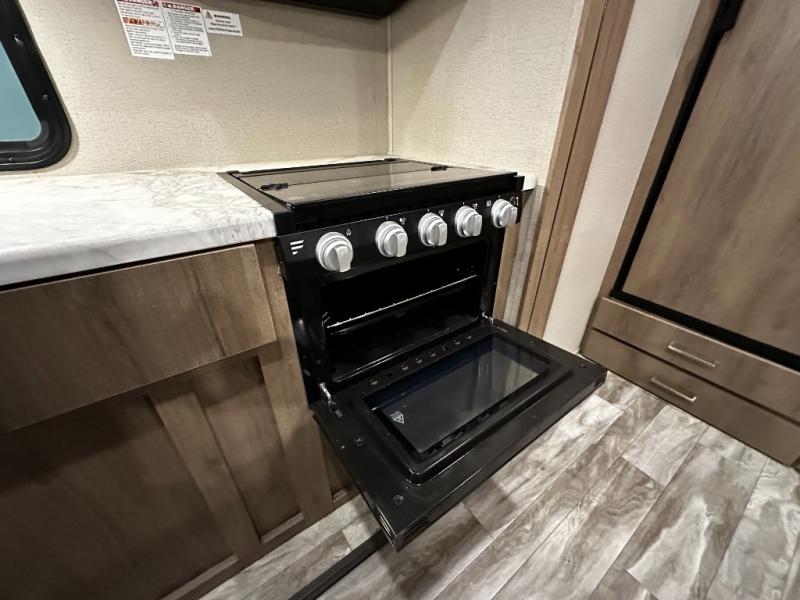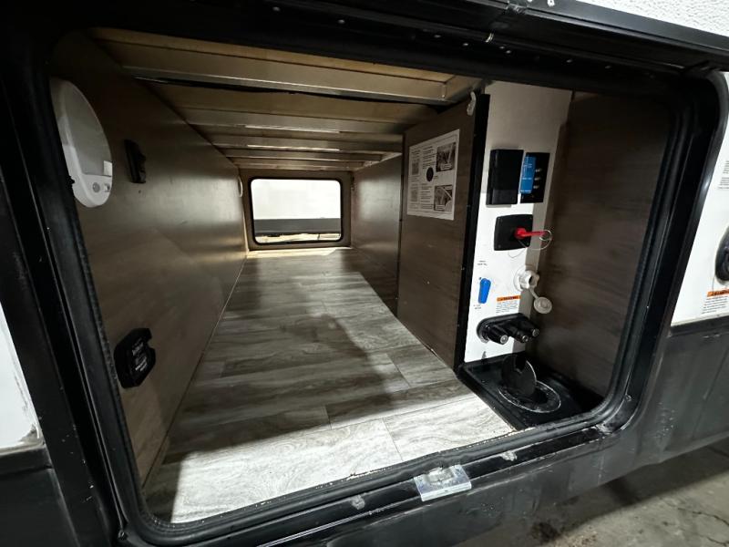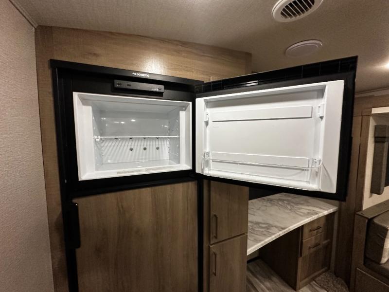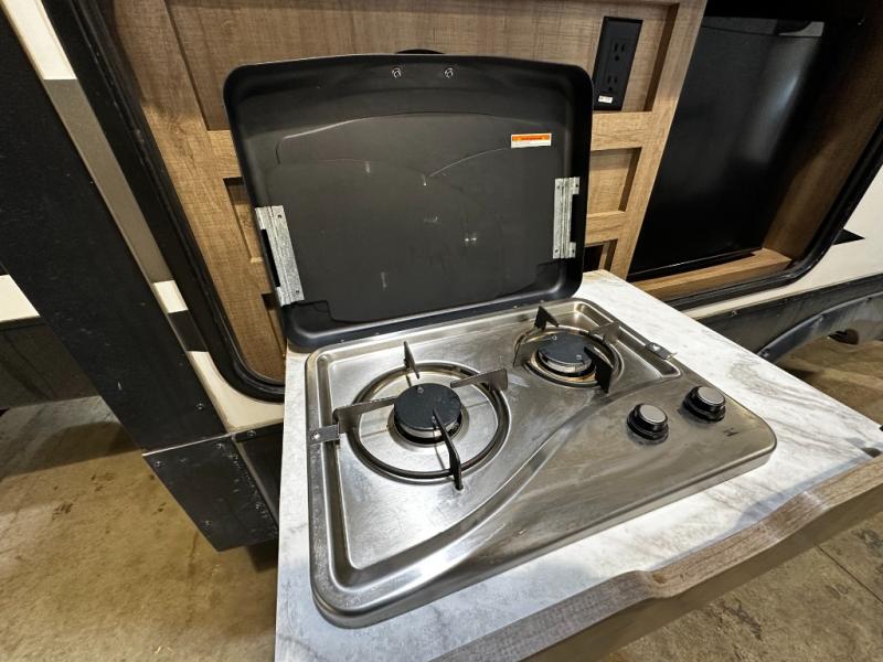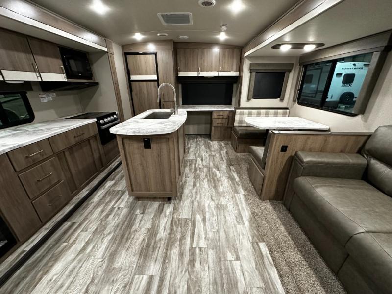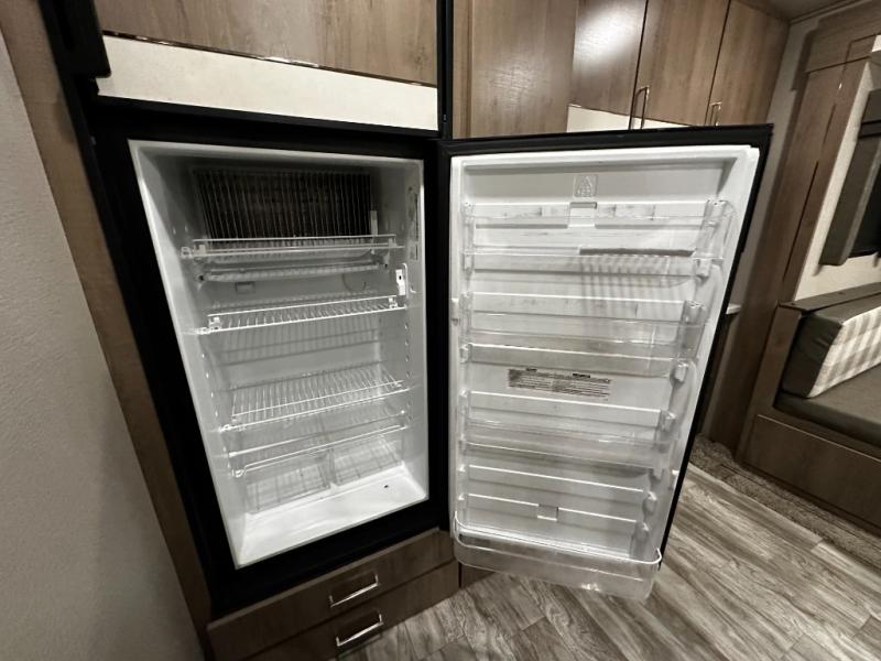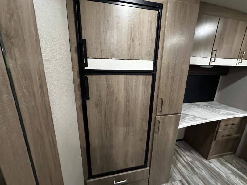 Step inside and you’ll appreciate the thoughtful layout designed with both comfort and convenience in mind. A large kitchen island makes meal prep a joy and doubles as a gathering spot for friends and family. A dedicated desk area lets you stay productive while traveling, whether you’re checking email or planning your next destination. Relax on the tri-fold sofa or at the booth dinette, enjoy the warmth of the fireplace, or watch your favorite show on the telescoping 40" LED HDTV.