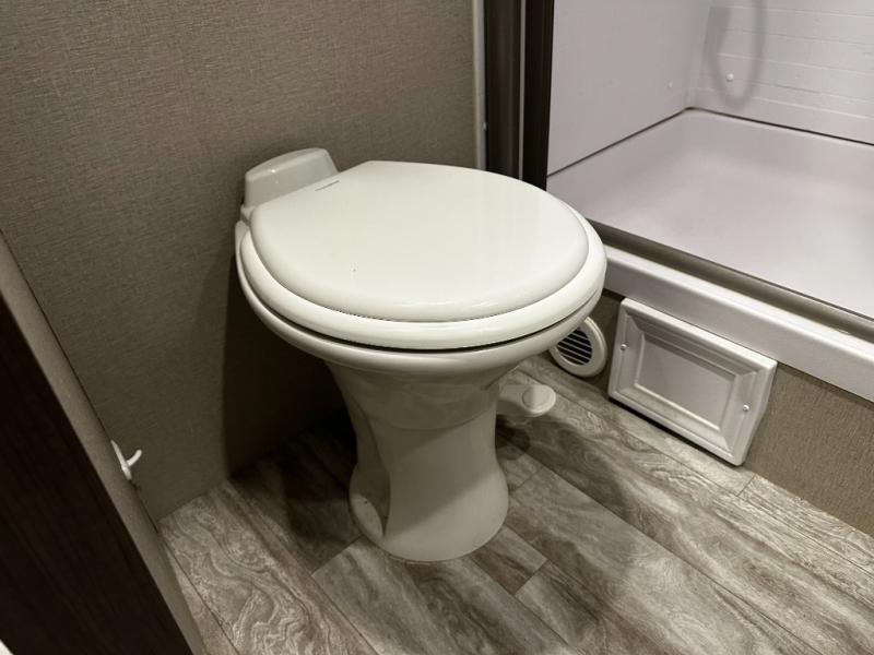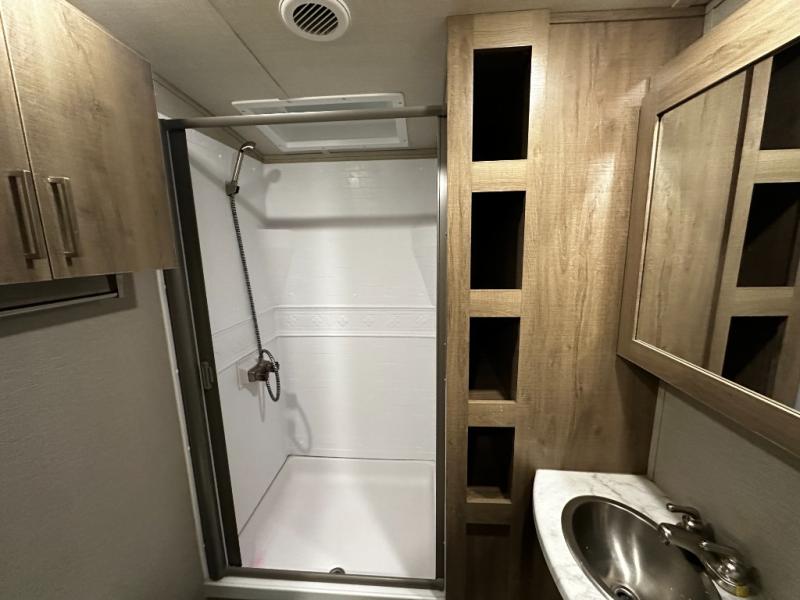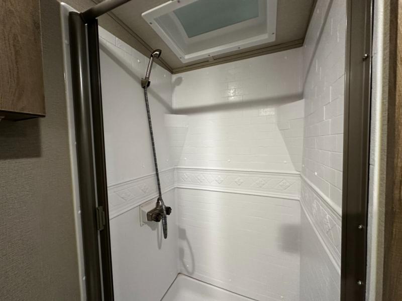 The private front bedroom offers a queen-size bed with plenty of storage, built-in cubby shelving, and USB charging stations for your devices. Adjacent, a spacious walk-through bathroom features a roomy 30" x 36" residential shower with skylight, medicine cabinet, and power vent fan — perfect for freshening up after a day of outdoor adventure.