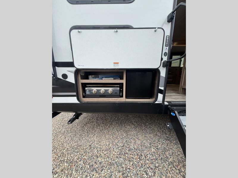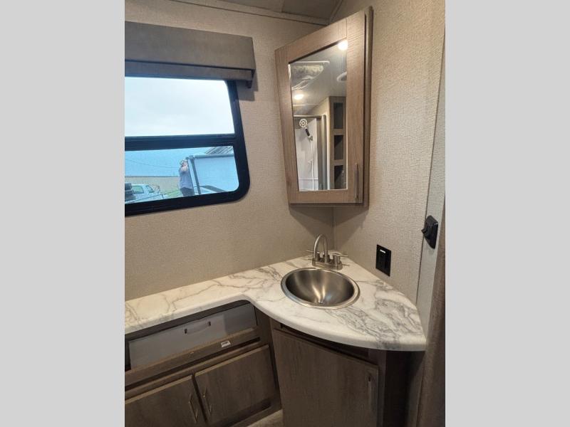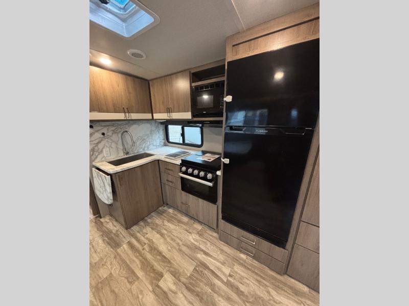 Where will you go with this Imagine travel trailer? The possibilities are endless! You can take your family on an exciting excursion because this trailer has enough sleeping space for everyone with the 60" x 80" bed in the private bedroom, the U-shaped dinette and tri-fold sofa in the main living area, and the 47" x 76" bunk beds with privacy curtains. You can come and go as you please with two entry doors, and the outdoor kitchen will be fun to use when the weather is nice. Your family's pet can eat out of the pet dish below the refrigerator, and the large slide will keep this trailer feeling spacious.