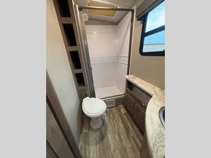 What I liked most: Bunk area area lifts up for additional storage which is very unique. Place for shoes. The bathroom shower surround has a brick molded design look.