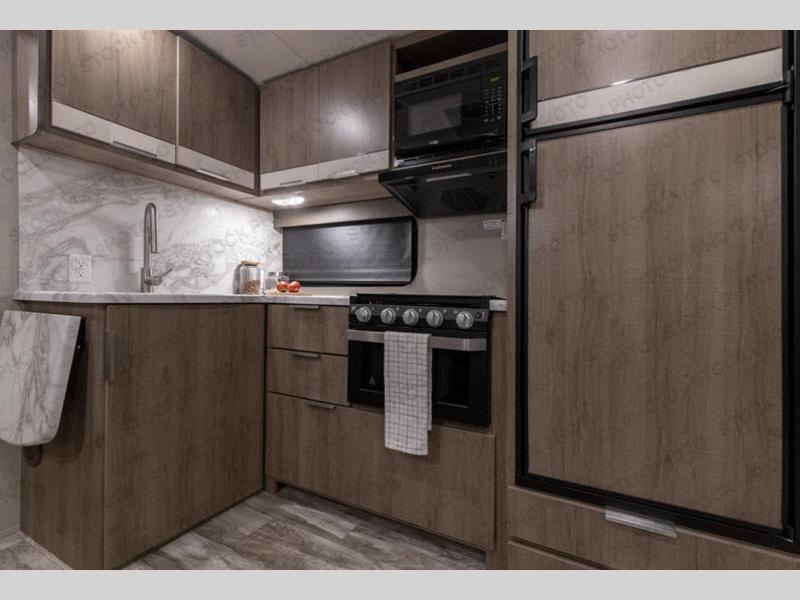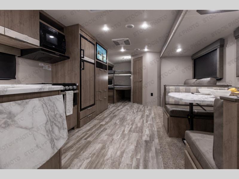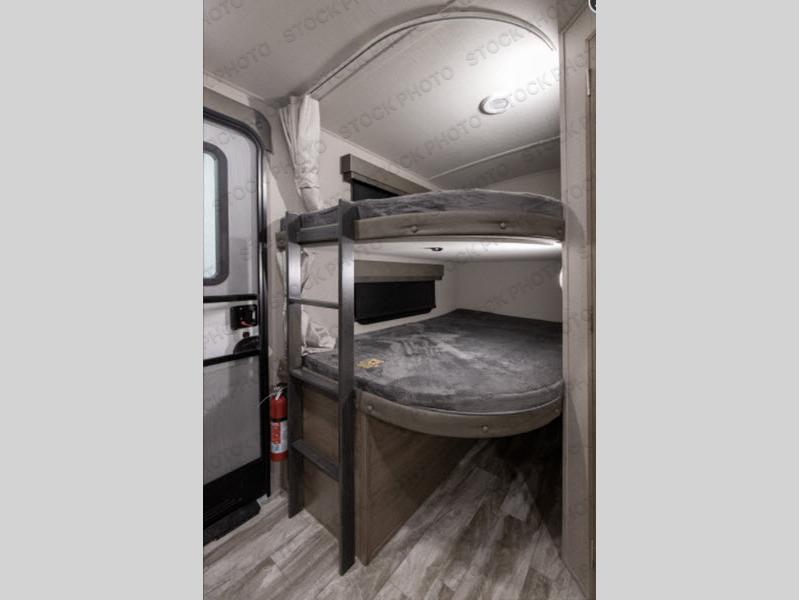 Where will you go with this Imagine travel trailer? The possibilities are endless! You can take your family on an exciting excursion because this trailer has enough sleeping space for everyone with the 60" x 80" bed in the private bedroom, the U-shaped dinette and tri-fold sofa in the main living area, and the 47" x 76" bunk beds with privacy curtains. You can come and go as you please with two entry doors, and the outdoor kitchen will be fun to use when the weather is nice. Your family's pet can eat out of the pet dish below the refrigerator, and the large slide will keep this trailer feeling spacious.
