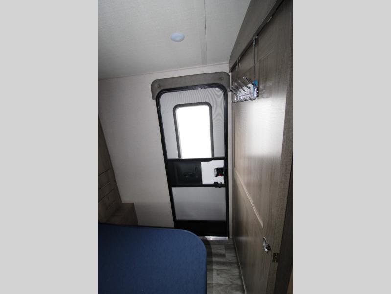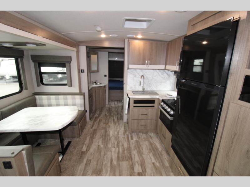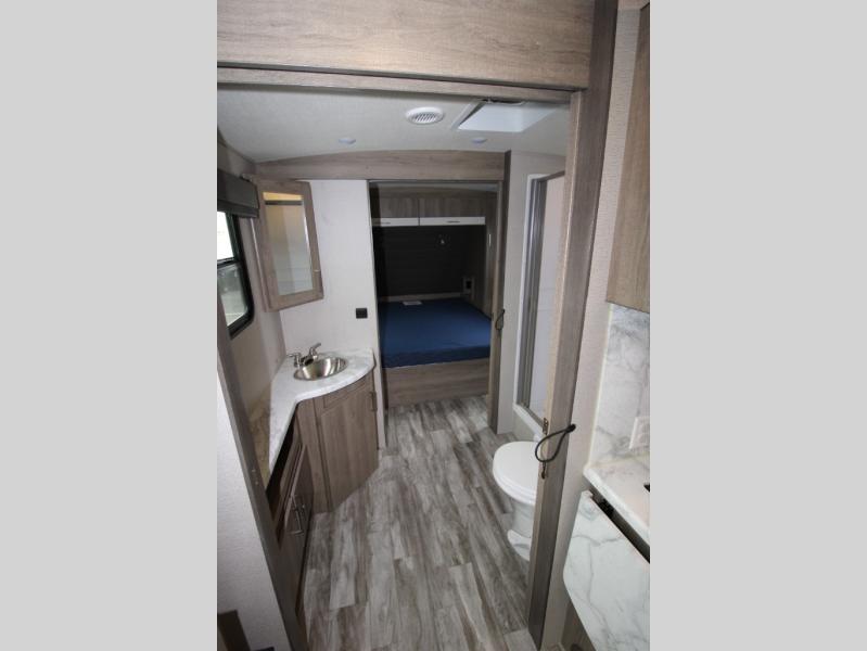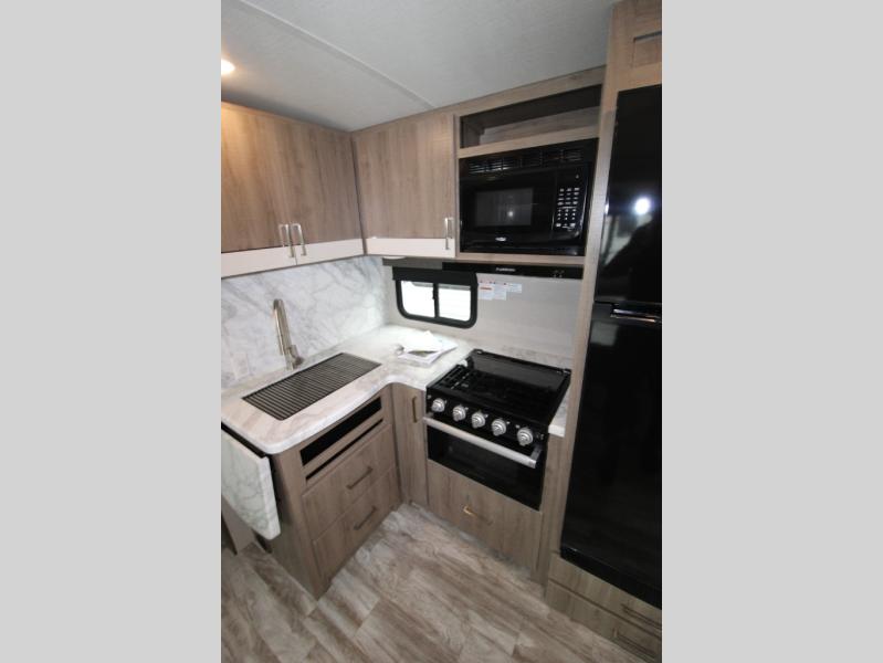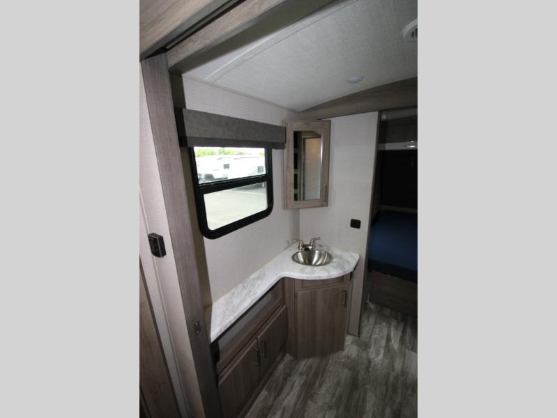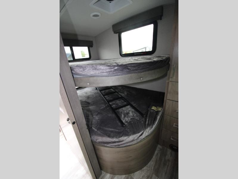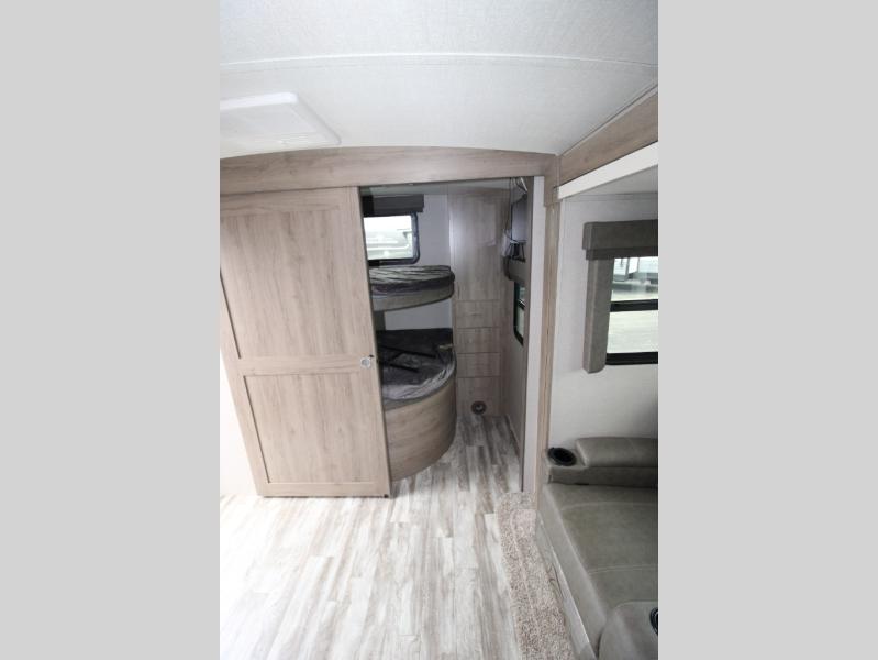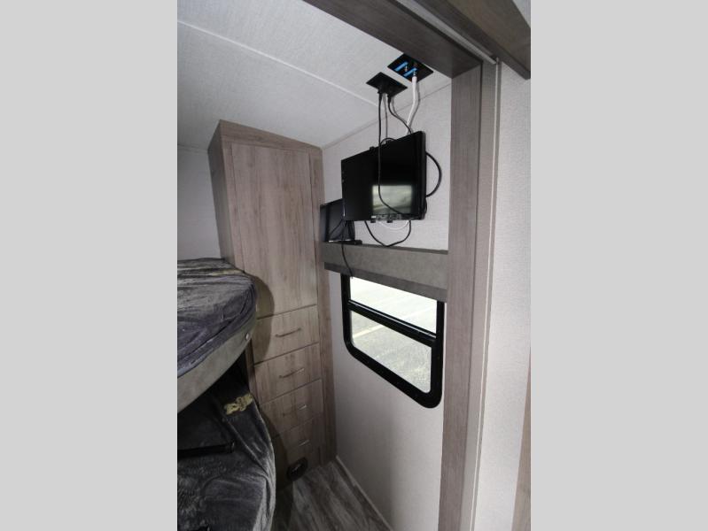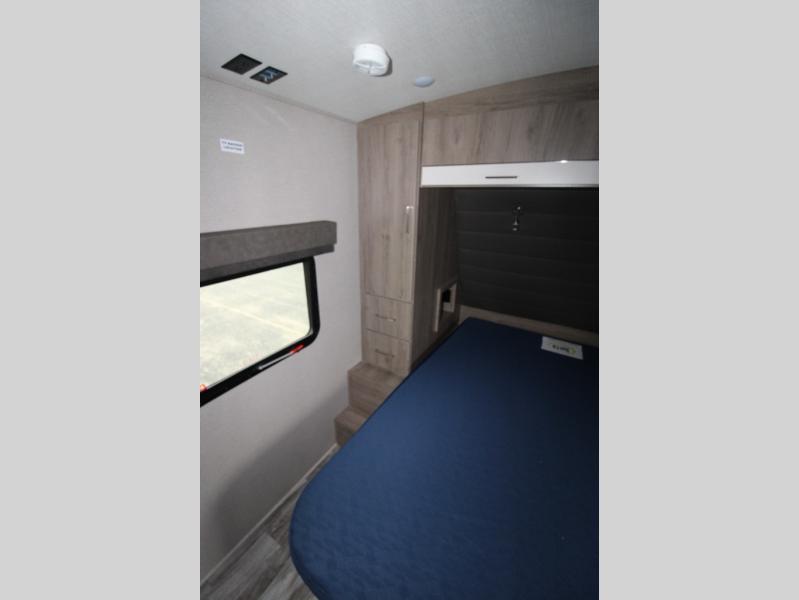 With this Imagine travel trailer, you won't have to imagine what a great camping trip will be like because you can live it! The kitchen includes everything you will need to prepare a meal for everyone, like a 10-cubic foot refrigerator, three-burner range with oven, microwave, stainless steel sink, and flip-up countertop extension. There is a pet dish below the refrigerator, and the LED HDTV sits across from the tri-fold sofa and U-shaped dinette with removable ottoman so that you can watch a movie or the big game in comfort. Another great addition is the private bunkhouse because it provides you with a second secluded sleeping space. This bunkhouse includes a wardrobe, drawers, and an area prepped for a TV.