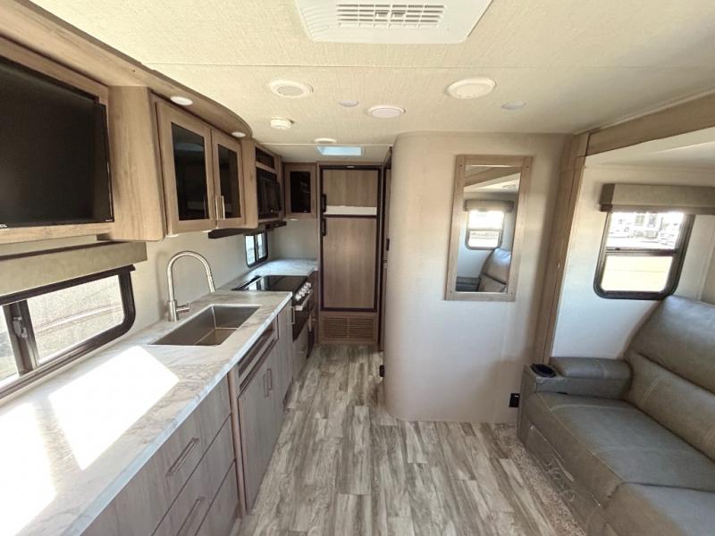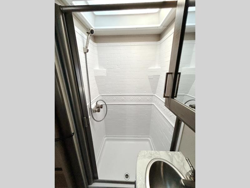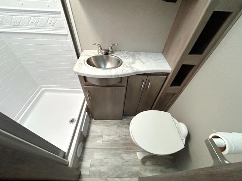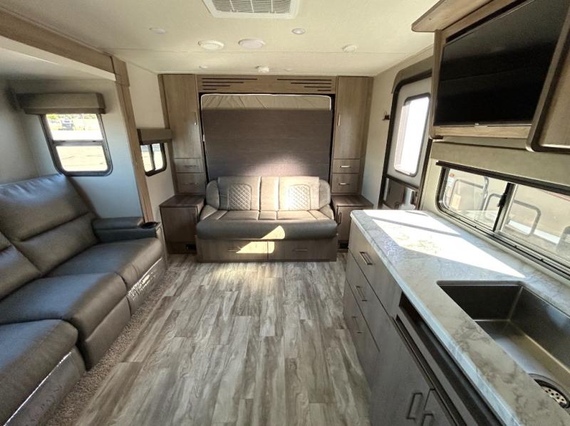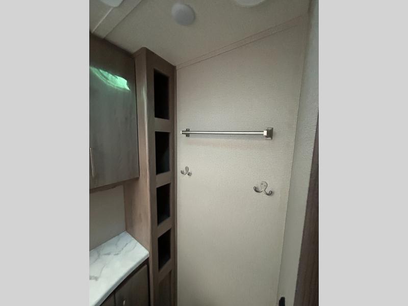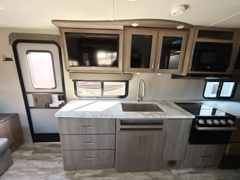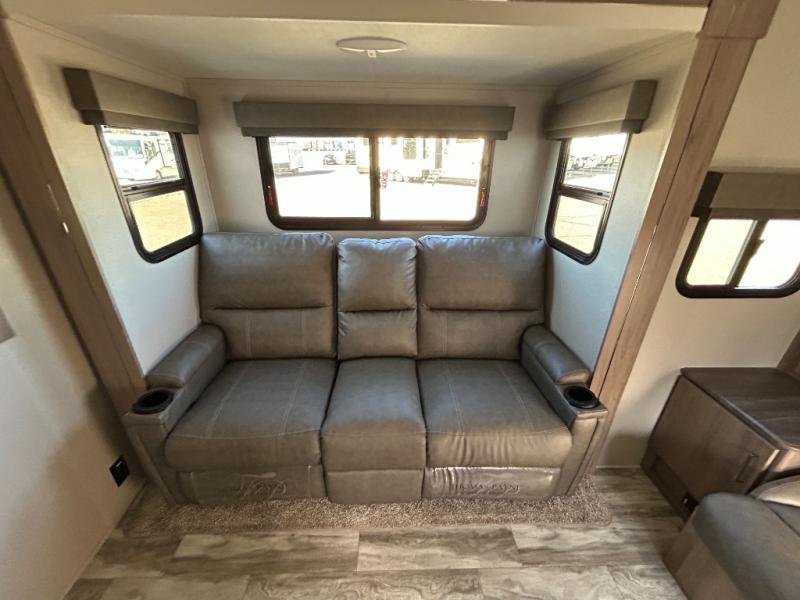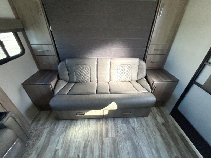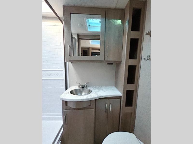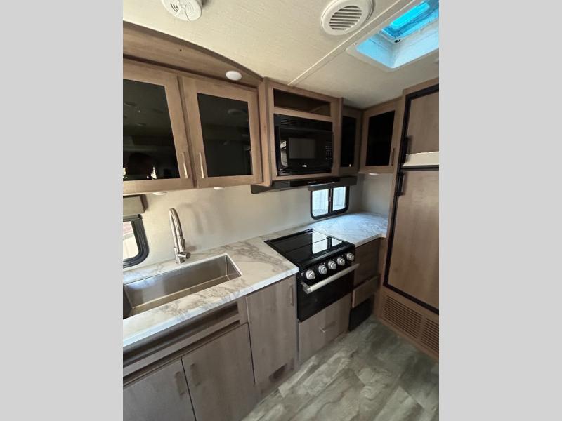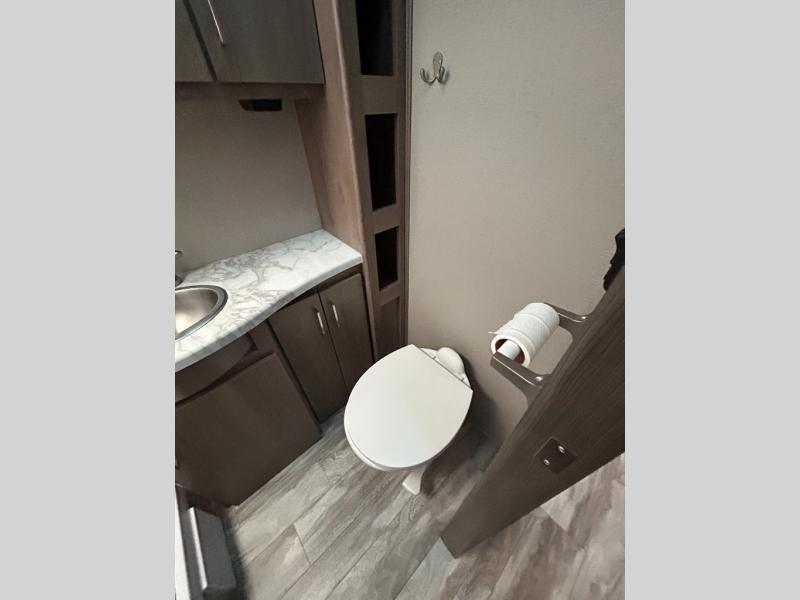 The Murphy bed is the eye-catching feature on this Imagine XLS travel trailer! Not only can it fold away in the morning to reveal a sofa for lounging, but it will also provide you with drawer storage under the sofa. Another functional feature is the theater dinette with a removable table in front. It rests on the single slide so that there is more floor space, and it offers you great comfort while you dine across from the LED HDTV. A full bathroom will keep you clean and fresh with its residential walk-in shower, skylight, linen closet, vanity, toilet, and power vent fan.