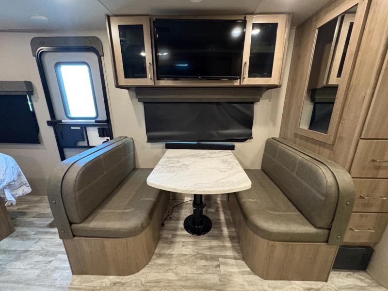 This Imagine XLS travel trailer has theater seating and a booth dinette that you can use any time you need a little break from the outdoors. If you want to come in and grab a coffee, put together a puzzle, or work on your itinerary for the week, just put up your feet and relax. You could even switch on the LED HDTV if you want a little entertainment. The front queen-size bed has a privacy curtain that you can draw to create a semi-private bedroom, and in the back of the trailer you will find the rest of your amenities, like the kitchen and the bathroom. The large slide makes it easy to enjoy spending your time indoors, but if you do want to get back outside, you can sit underneath the 18' electric awning for some shade.