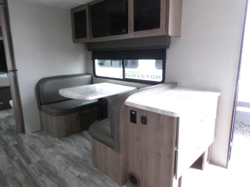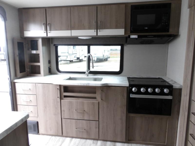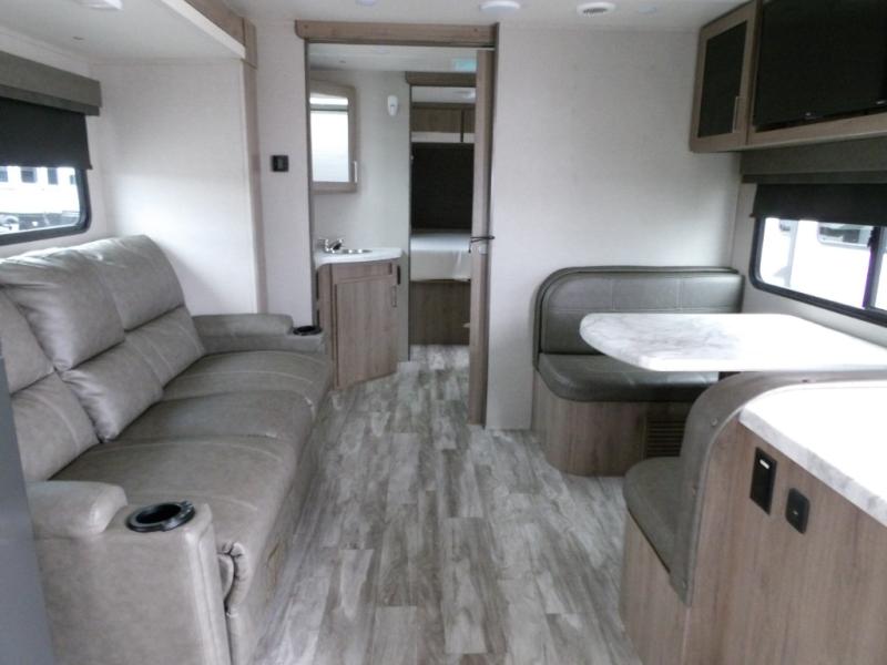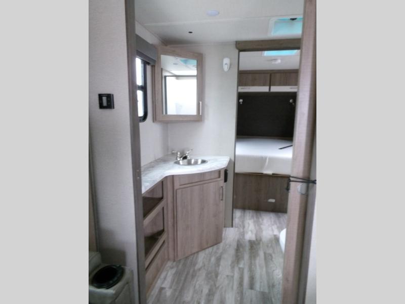 Treat yourself to a weekend of fun in this Imagine XLS travel trailer! Whether it's just you and your spouse, or you've chosen to bring along a group of friends, this trailer will meet the need. The front bedroom can sleep two people on the walk-around queen-size bed. The bedroom is quite functional because it not only contains the second exterior entry door, but it also has a private entrance into the walk-through bathroom since it is located on the other side of the bathroom. The booth dinette is functional too because it can transform from a dining location into a sleeping location, and the theater seating is directly across from the 32" LED TV for easy viewing. When you enter through the entry door that is right next to the rear kitchen, you'll be able to take off your shoes and put them in the shoe storage below the dinette.