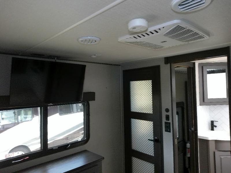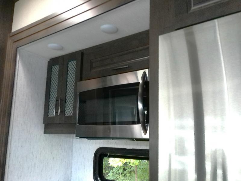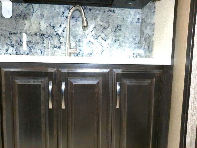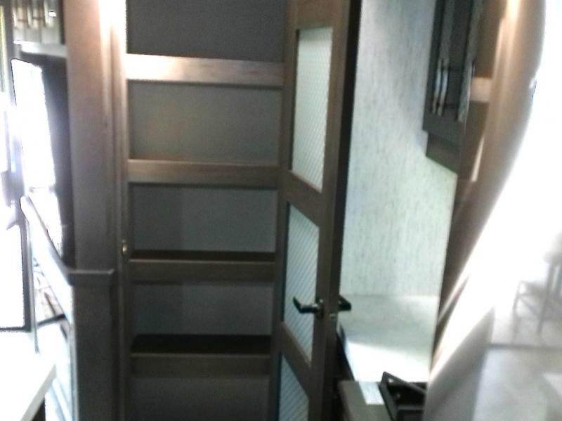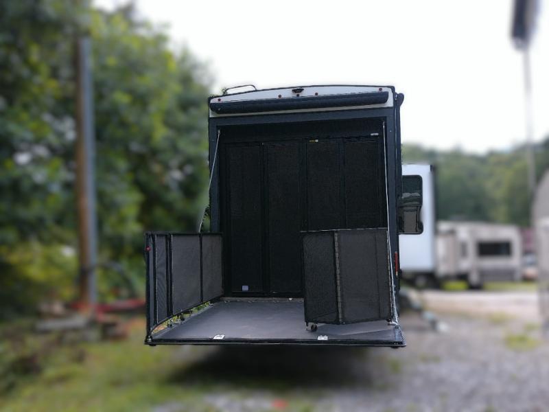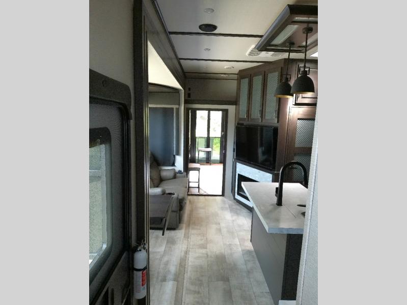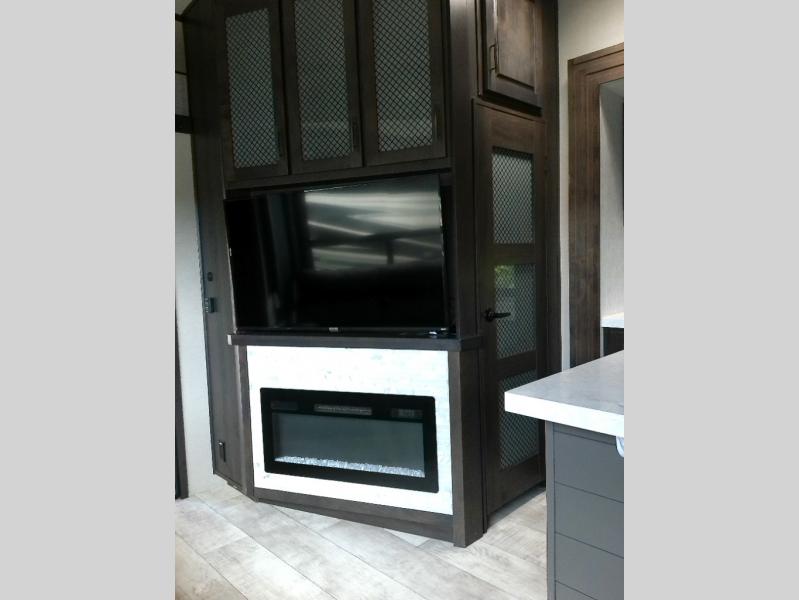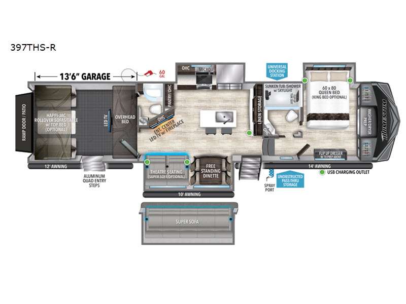 Load up your toys, your clothes and food and start your adventure as you smoothing tow this fifth wheel to your campsite. You will enjoy the Fast Ramp rear ramp door, the Ram-Air garage vents on both sides, the 2,500 lb. rated flush-mount tie-downs and the protective diamond plate on the garage sidewalls. You will surely appreciate the full bathroom and LED TV, plus the option to add Happi-Jac rollover sofas/table with top bed. The main area provides a living and kitchen area with a 49" LED TV and fireplace, theatre seating and a free standing table, plus full kitchen amenities including a residential refrigerator. The kitchen island even offers bar stools. Head up front to use the full bathroom with dual entry, the sunken tub/shower with flip-up teak seat, and fall quickly to sleep on your own queen bed or choose a king option in the front bedroom. There is more to love and options to choose from. And if you would prefer to have an 18-cubic foot RV refrigerator, you should check out model 397THS!