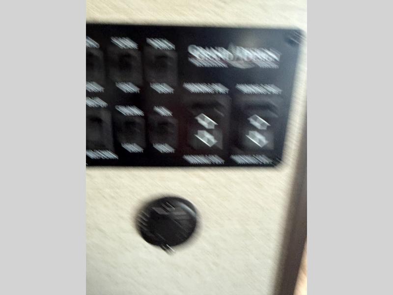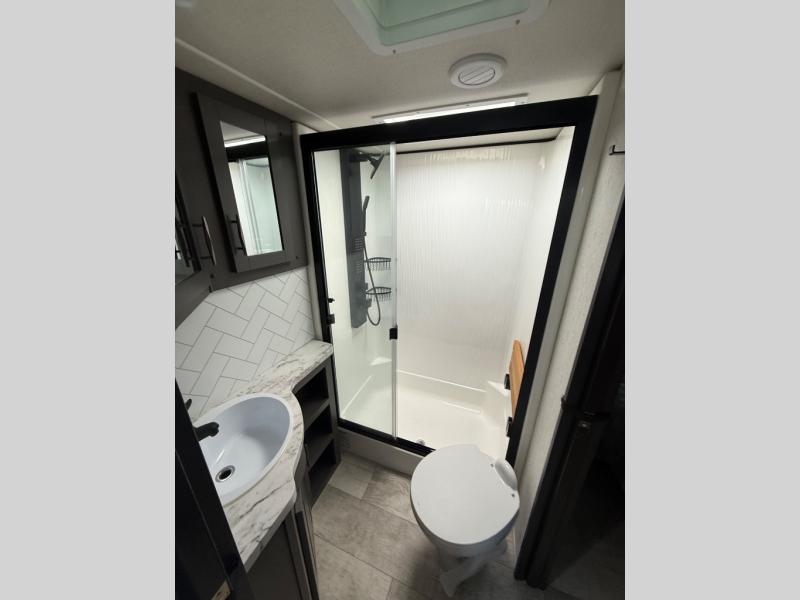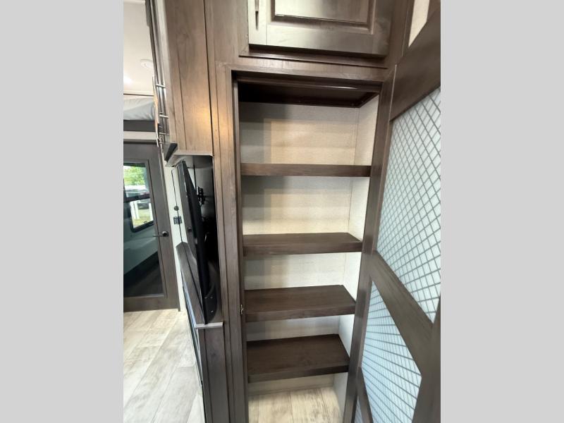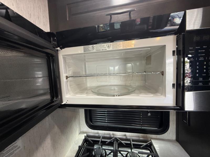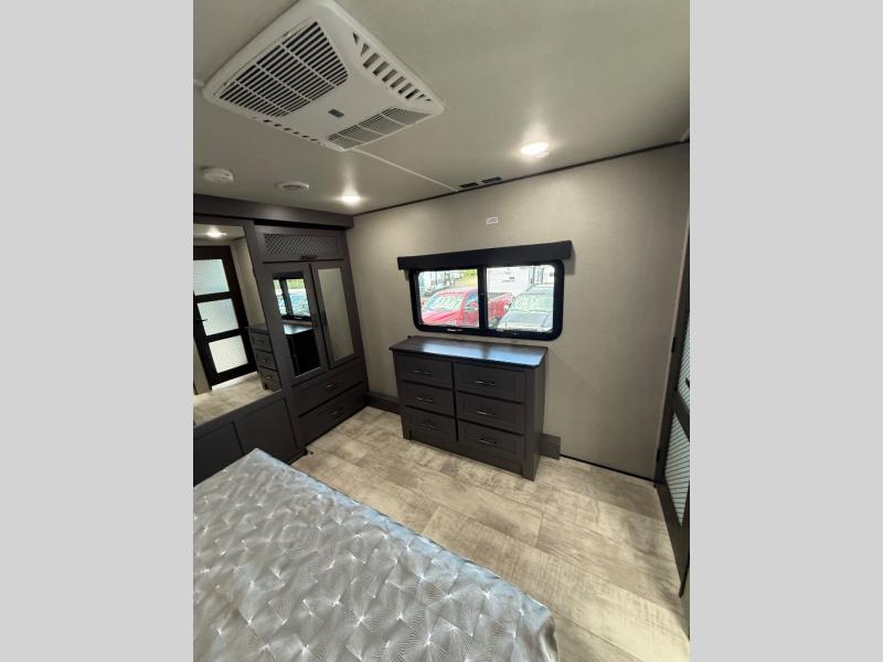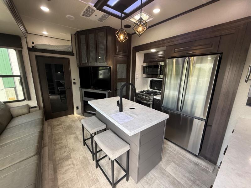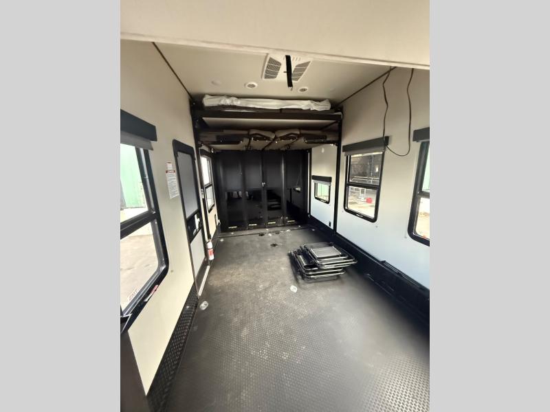 Traveling with friends and family can be comfortable when you have a full double entry bathroom and a half bath available when camping and enjoying the trails on your off-road toys! You will have an 15' garage space that can become a second living/dining area as well as a bedroom if you decide to add the Happi-Jac rollover sofas and a table with a top bed option, plus you can add other options such as an LED TV and/or a washer/dryer. There is an overhead loft bed and a four-seat sofa slide for more sleeping space in the main living area. Everyone can watch the 49" LED TV when waiting for dinner, and enjoy the fireplace on those chiller nights. The kitchen island offers a sink to wash dishes, extra counter space for serving meals and two stools to dine at. The cook will love all the upgraded appliances, and the space thanks to the slide. The front bedroom gives you a queen bed slide or choose a king, lots of clothing space, and a flip-up dresser for even more storage. If you want less garage space, take a look at 351MS-R!