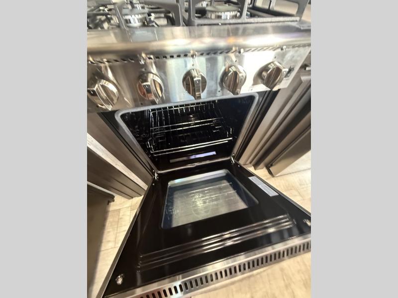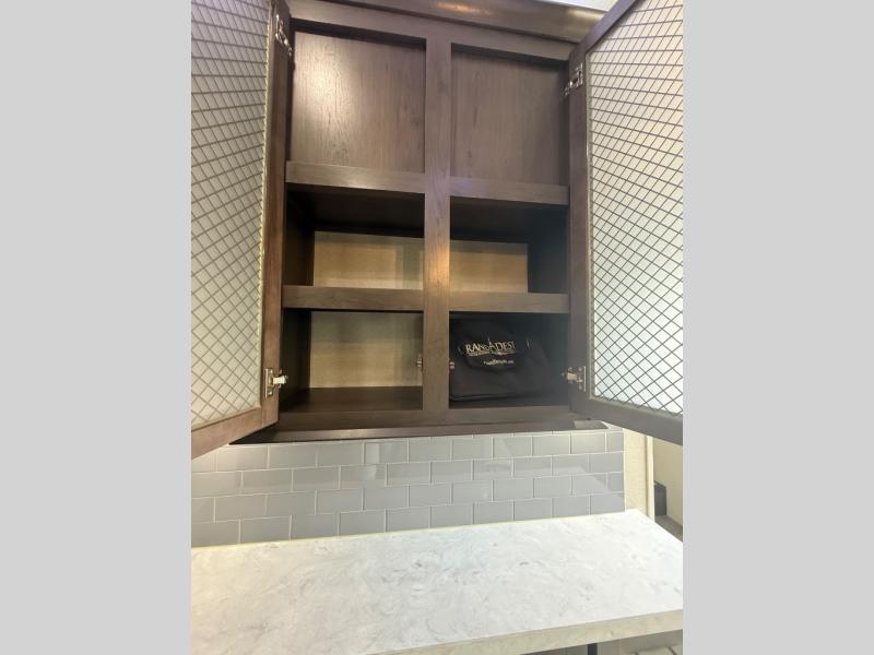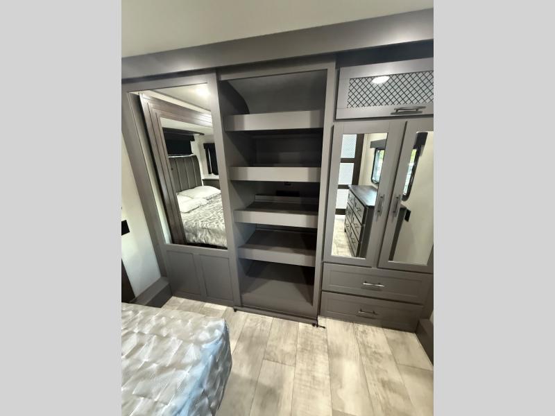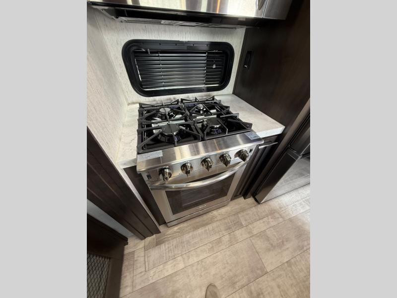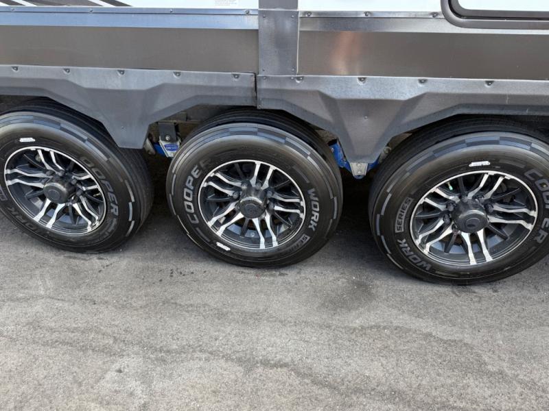 The Momentum M-Class fifth wheel toy haulers by Grand Design are lighter than the Momentum yet aren't lightweight on features when it comes to elegant design, luxury and a "Class" of its own! The chef-inspired kitchen provides a free-standing 3.7 cu. ft. gas range, a four burner cooktop with cast iron grill, an electronic ignition oven, and a digital display and interior oven light, plus 42,500 BTU of cooking power. The upgraded main bathroom offers solid surface counter tops, a three-jet shower panel system, a shower wand, and a teak bench seat. Each toy hauler includes a triple insulated garage floor, Tuff-Ply gas and oil resistant garage flooring, 2,500 lb. rated flush-mount tie-downs, and a Fast Ramp rear ramp door with two-sided lift-assist technology making it easy for one person to operate. And the MORryde CRE3000 suspension system and the rubber pin box, plus the upgraded axle hangers provide performance and smooth towing to your favorite destinations!