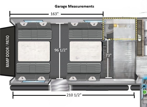 Load up your toys, gear, clothes and food to enjoy some off-road fun with your toys and friends! Once at the RV park, unload your toys, and setup the three slide outs, the two awnings, and begin planning your trail rides! You might decide to make a meal or snack in the combined kitchen and main living area which offers all the appliances you need, plus a kitchen island with an extended countertop and two bar stools, a pantry, a 49" LED TV with a fireplace below, plus a slide out four-seat sofa. The garage even offers the option to add two Happi-Jac rollover sofas and a table with a top bed if you want seating and sleeping space, plus there is storage, a prepped space to add a washer/dryer option, and an optional half bath. The overhead loft bed provides sleeping space as well. You will love the sunken tub/shower with a seat in the full bathroom with a space savings sliding door, and the front bedroom can be your escape. The queen bed is the largest bed size the floorplan can accommodate, a slide out wardrobe and USB charging outlets. If you want less garage space, take a look at 349M-R!