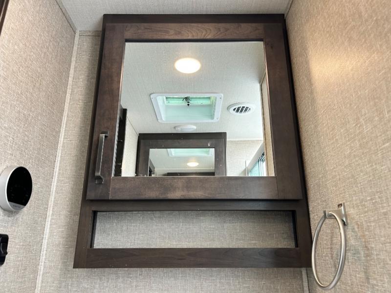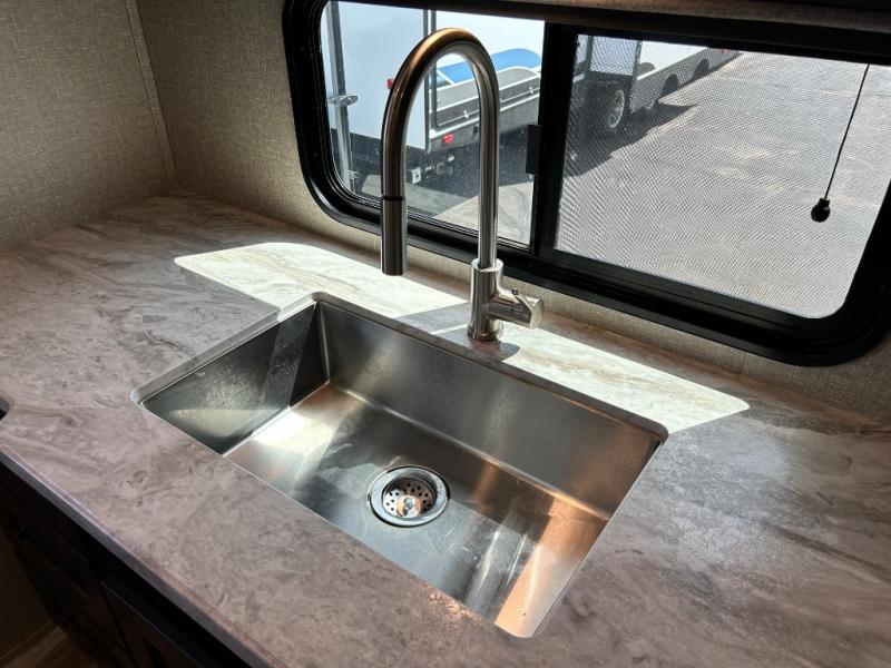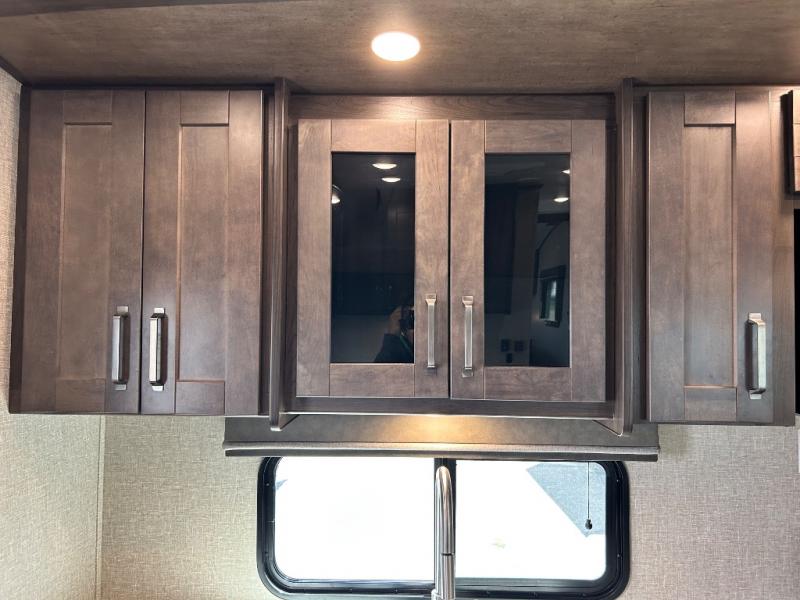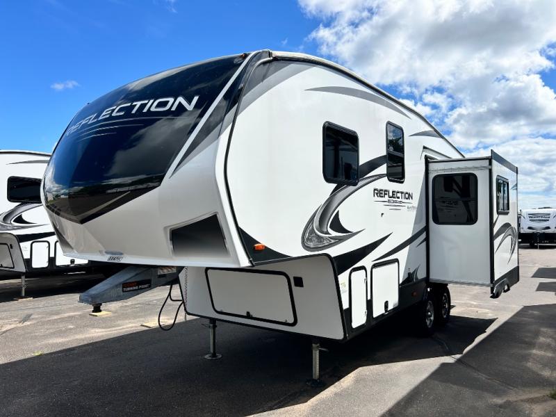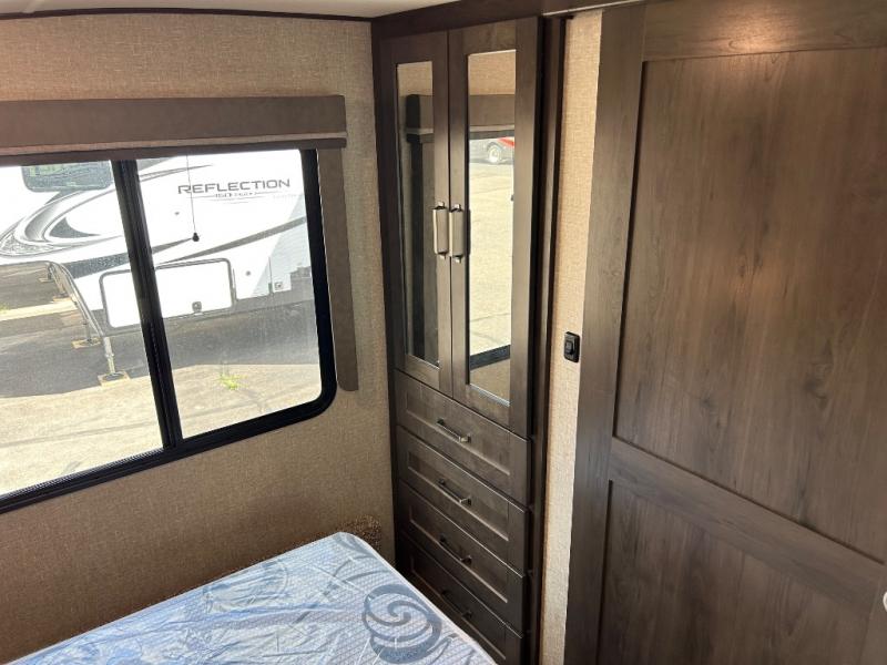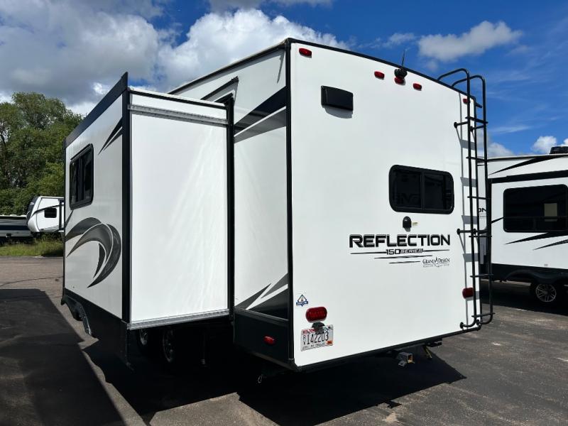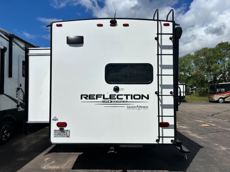 With any Reflection 150 Series fifth wheel by Grand Design, there is more available payload capacity and a broader range of half-ton trucks capable of towing this fifth wheel, and no slider hitch is needed thanks to the 90-degree turning radius which makes them short bed friendly and easier to tow. The mandatory Ultimate Power package provides a "One-Touch" automatic leveling system and a detachable power cord with LED light for easy setup, plus motion sensor pass-through lighting and entry lighting, and the Tire Linc TPMS will help you stay safe on the road. The interior offers residential luxury from the cabinetry and gunstock hardware plus the booth dinette to the residential-style window treatment. Make your refined decision today!