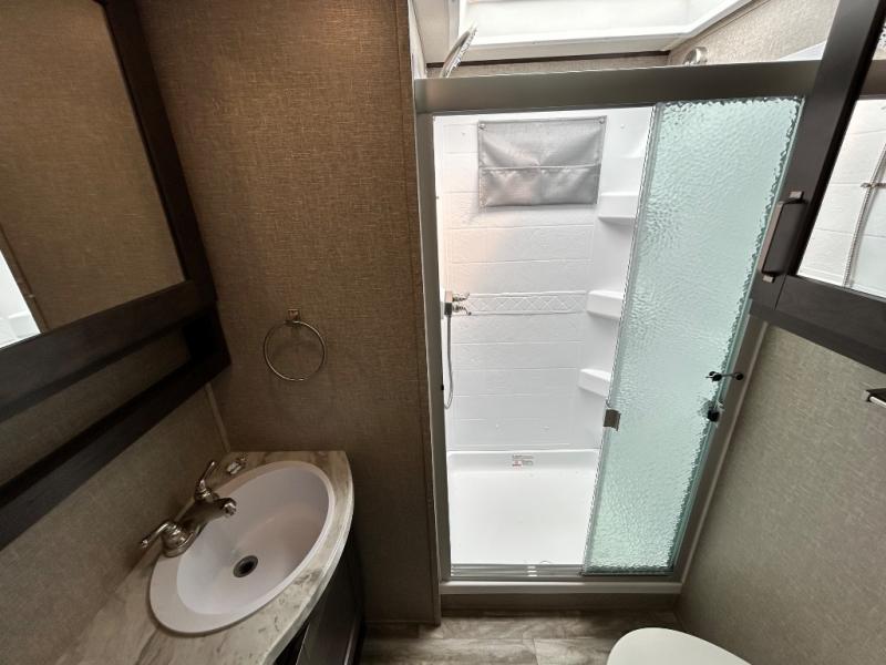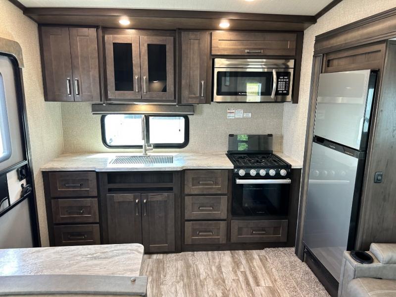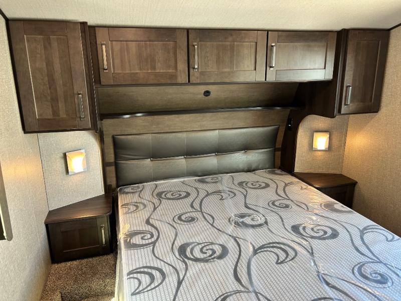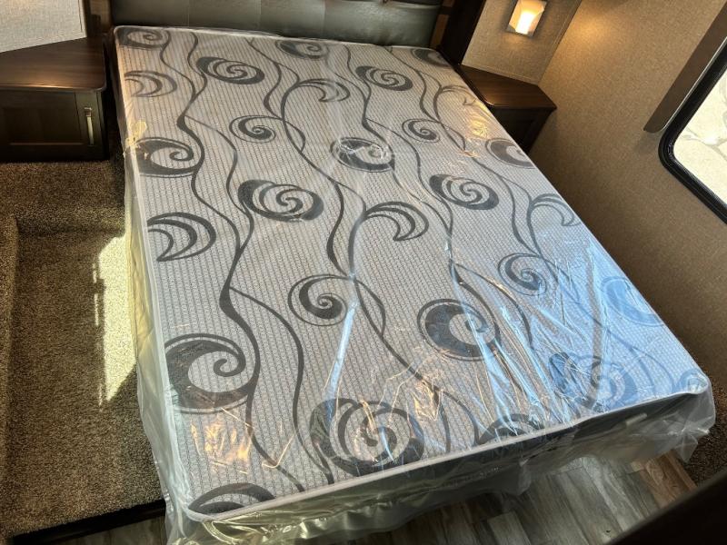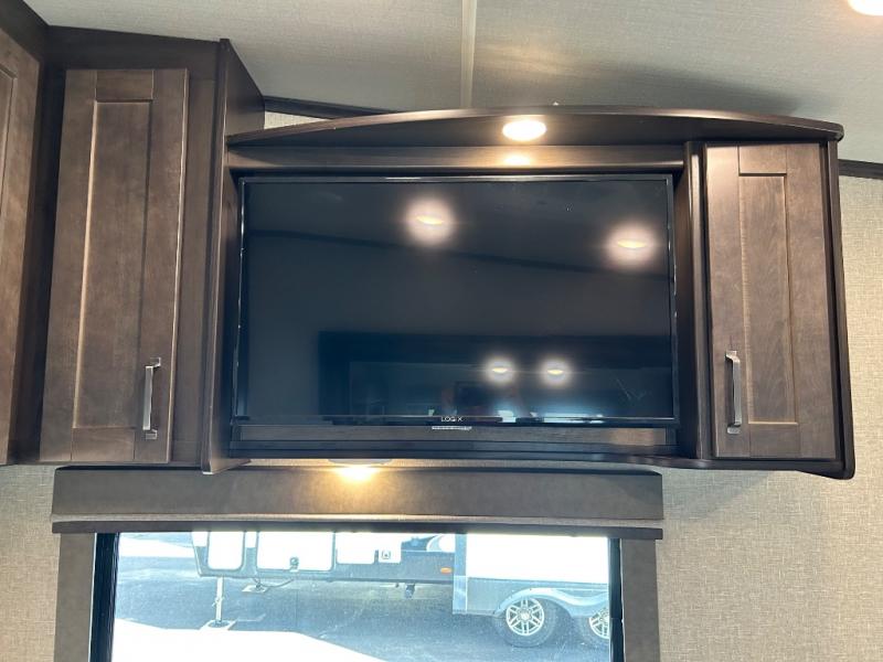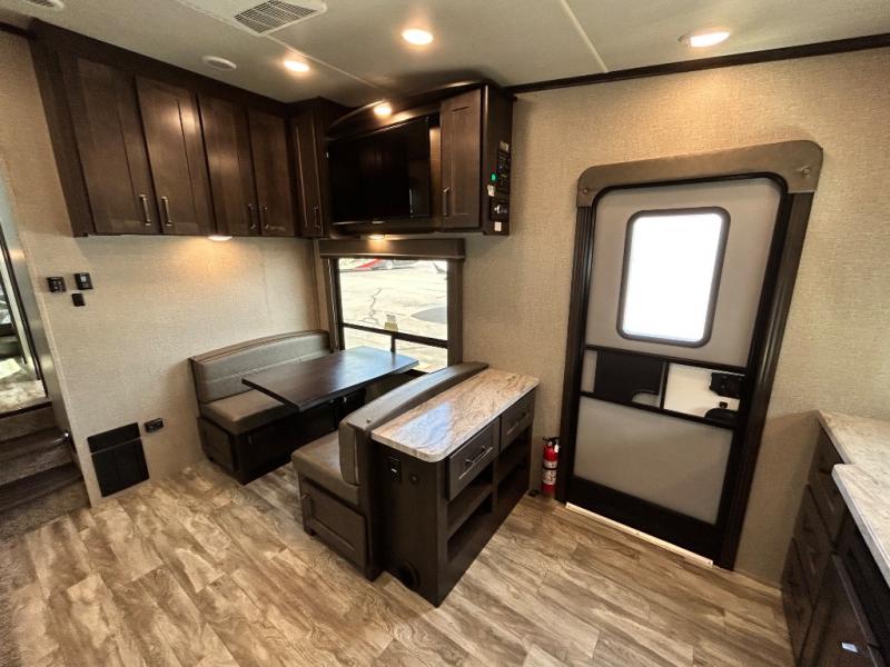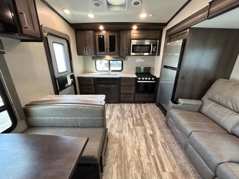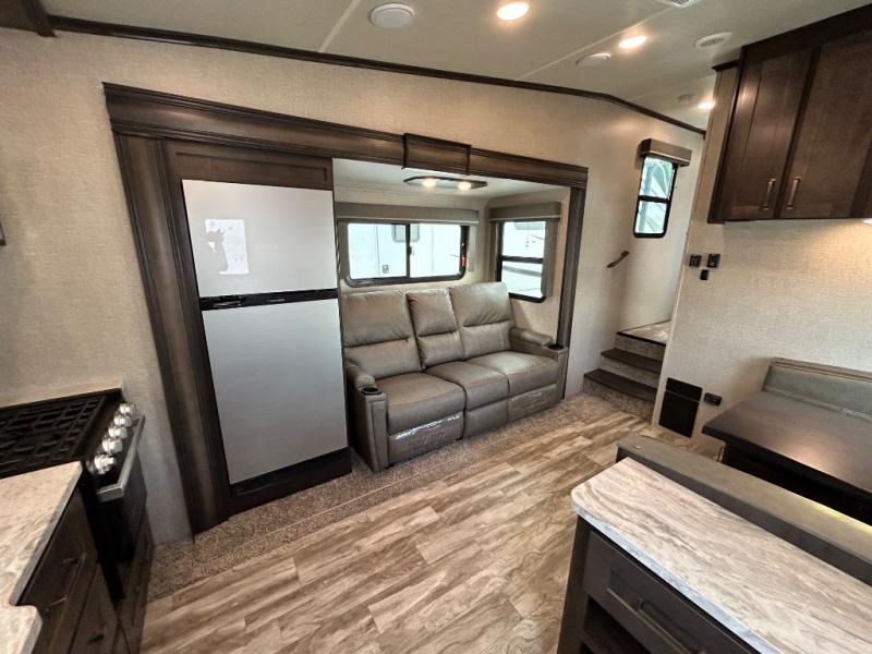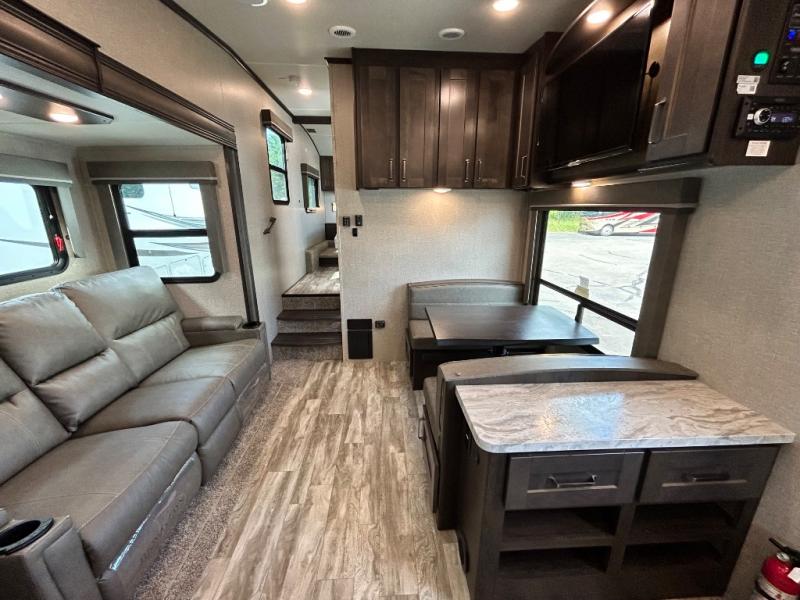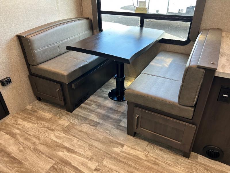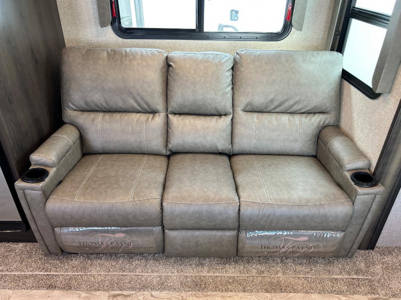 Enjoy a weekend getaway at a campground or off-grid in this fifth wheel! The front private bedroom has a queen bed for you to lay your head on at night and overhead cabinets to keep things out of the way. Inside the full bathroom there is a shower with a skylight for added natural lighting as you get ready each morning. Once you have prepared a delicious home cooked meal at the rear kitchen, head to the booth dinette for a comfortable place to enjoy it. What better way to wind down your nights than to relax on the 70" theatre seating and watch your favorite movie on the 40" LED HDTV. The theatre seats can also be switched out for an optional tri-fold seating if you would prefer that type of seating.