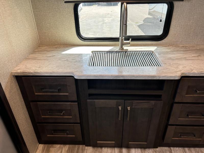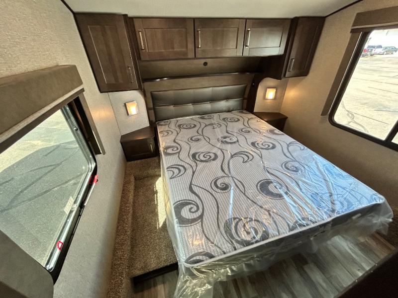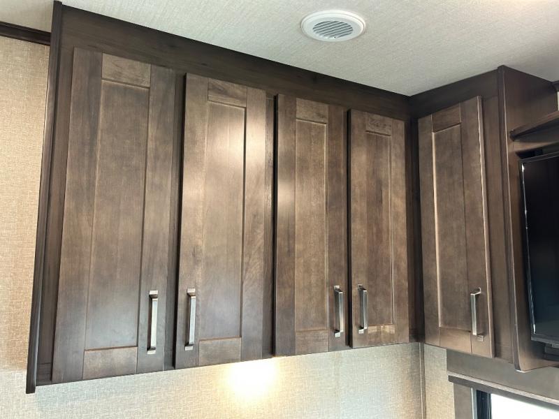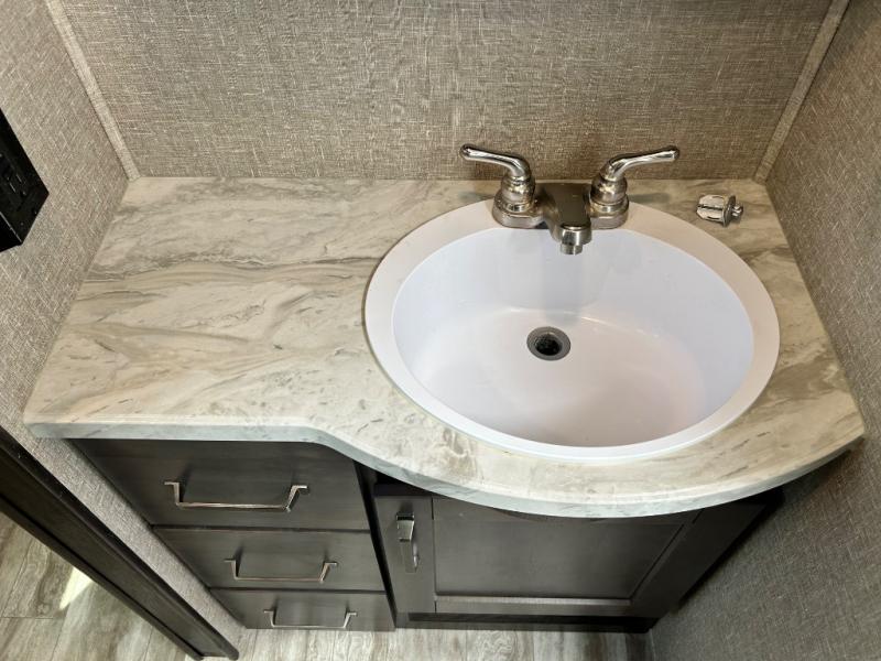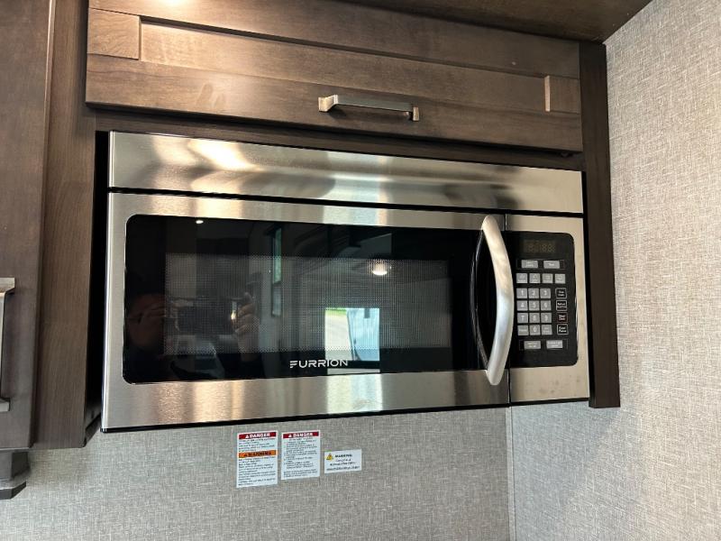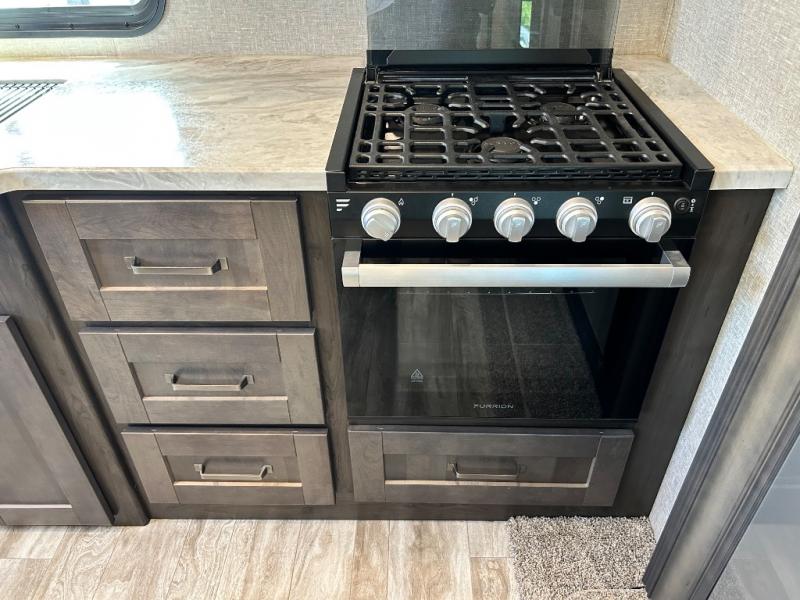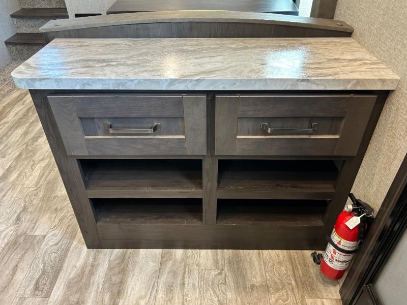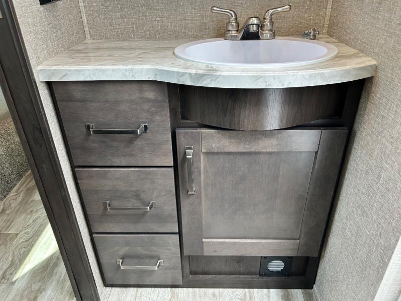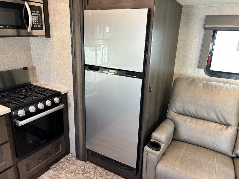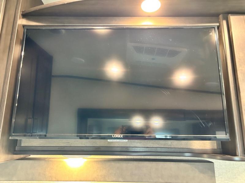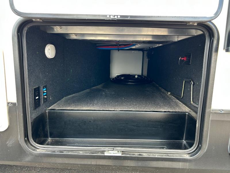 Enjoy a weekend getaway at a campground or off-grid in this fifth wheel! The front private bedroom has a queen bed for you to lay your head on at night and overhead cabinets to keep things out of the way. Inside the full bathroom there is a shower with a skylight for added natural lighting as you get ready each morning. Once you have prepared a delicious home cooked meal at the rear kitchen, head to the booth dinette for a comfortable place to enjoy it. What better way to wind down your nights than to relax on the 70" theatre seating and watch your favorite movie on the 40" LED HDTV. The theatre seats can also be switched out for an optional tri-fold seating if you would prefer that type of seating.