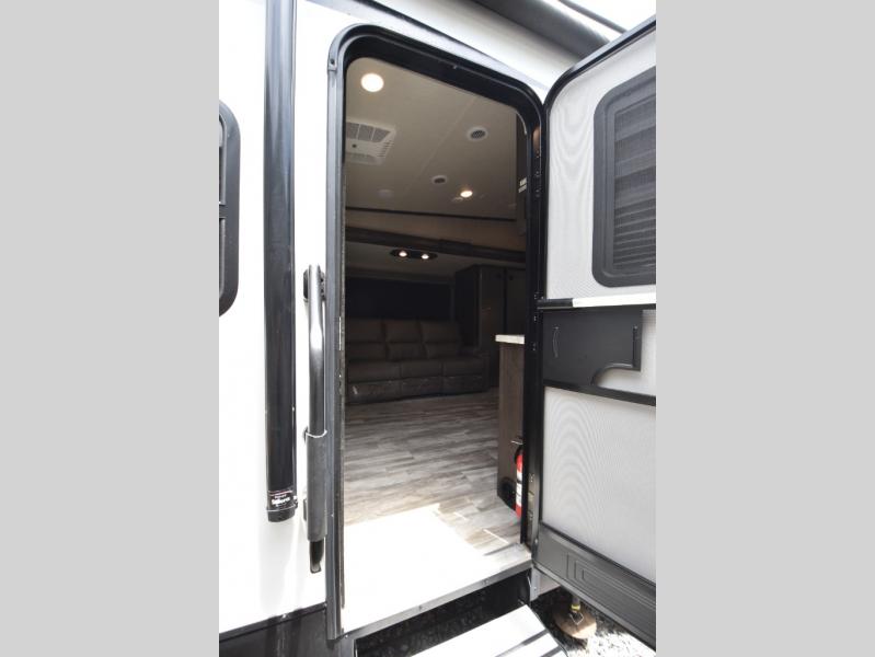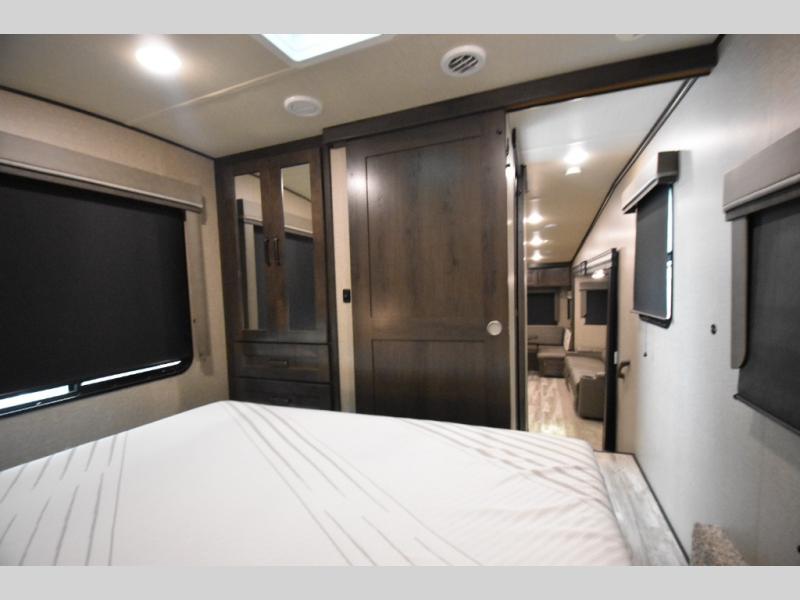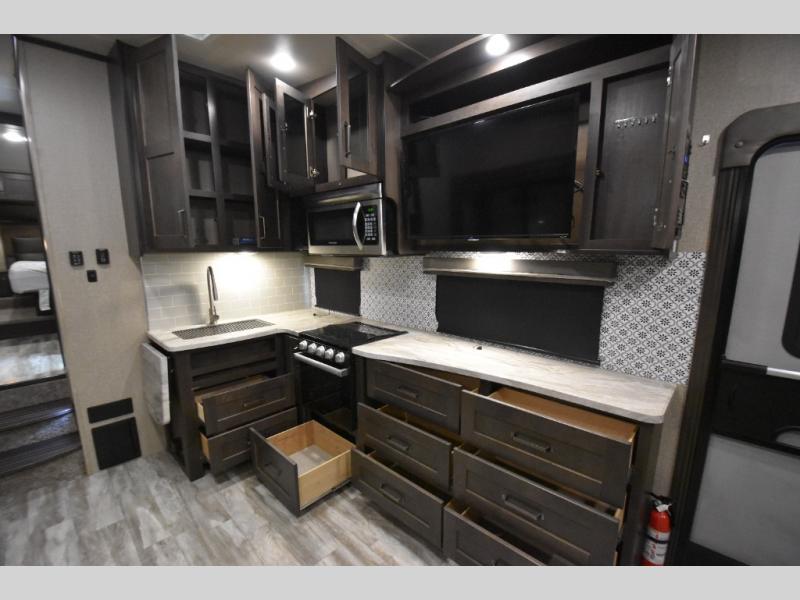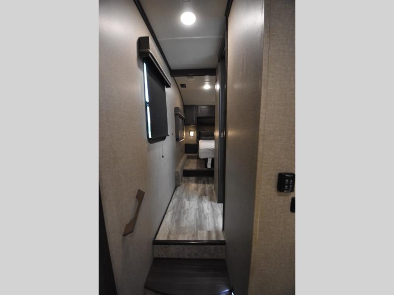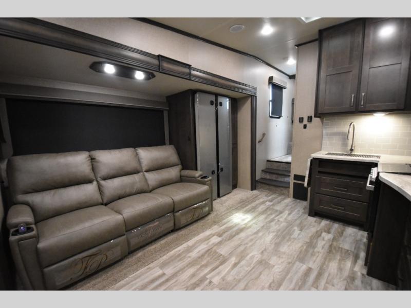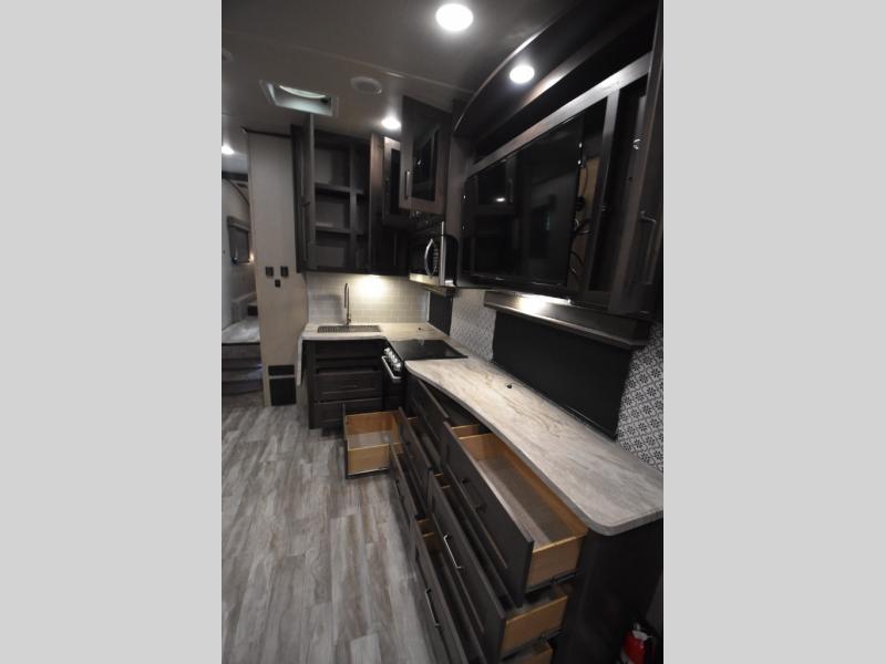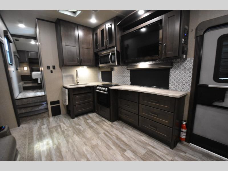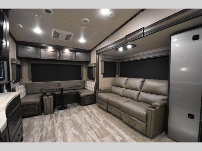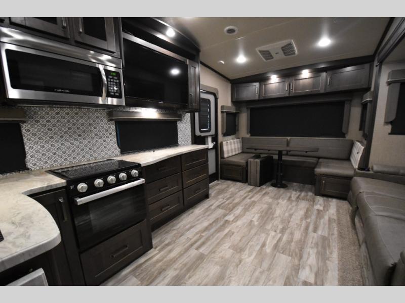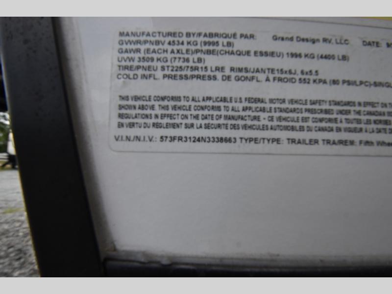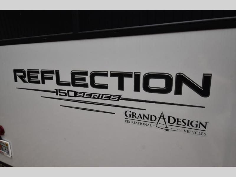 With any Reflection 150 Series fifth wheel by Grand Design, there is more available payload capacity and a broader range of half-ton trucks capable of towing this fifth wheel, and no slider hitch is needed thanks to the 90-degree turning radius which makes them short bed friendly and easier to tow. The mandatory Ultimate Power package provides a "One-Touch" automatic leveling system and a detachable power cord with LED light for easy setup, plus motion sensor pass-through lighting and entry lighting, and the Tire Linc TPMS will help you stay safe on the road. The interior offers residential luxury from the cabinetry and gunstock hardware plus the booth dinette to the residential-style window treatment. Make your refined decision today!