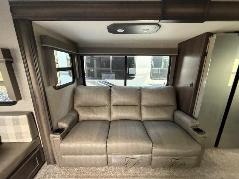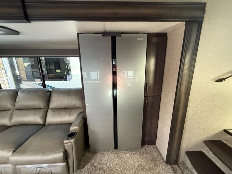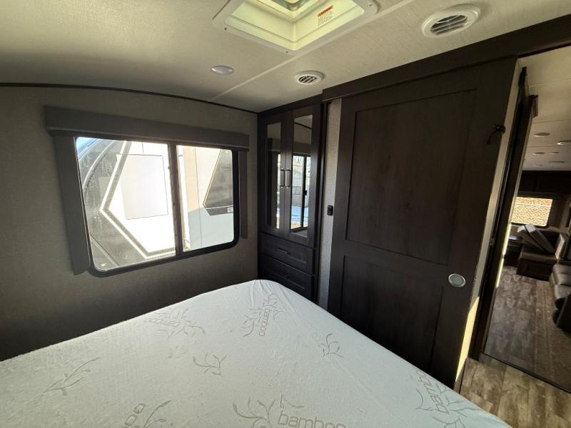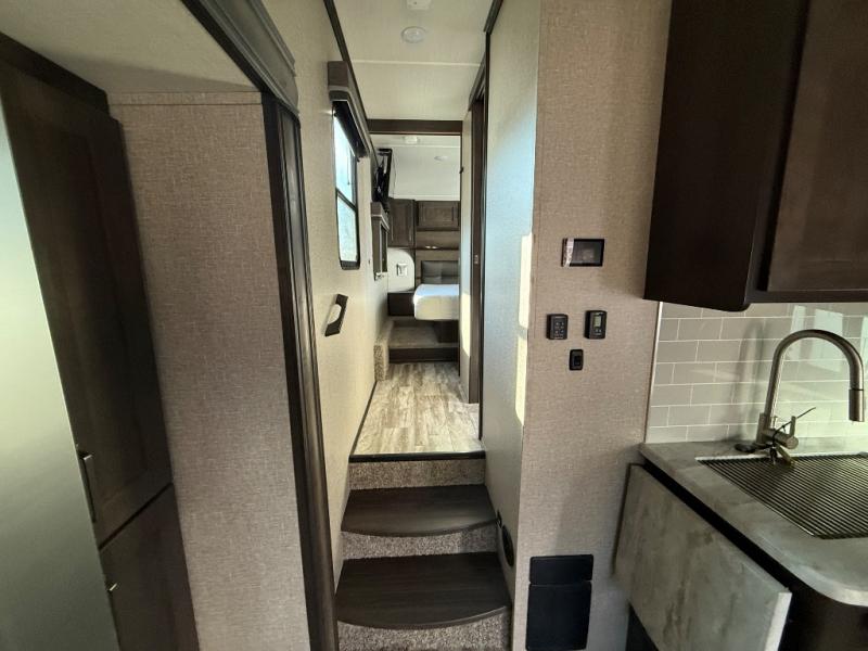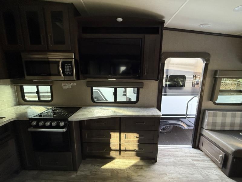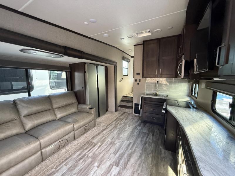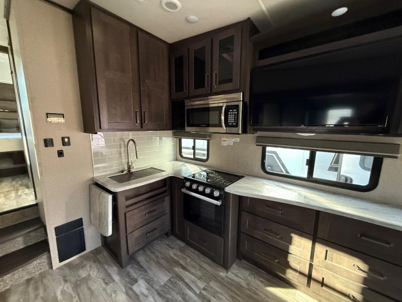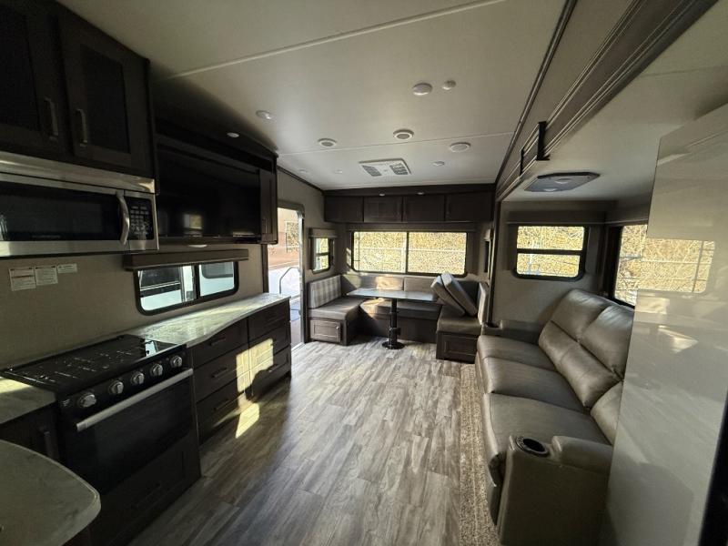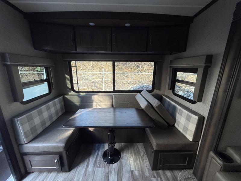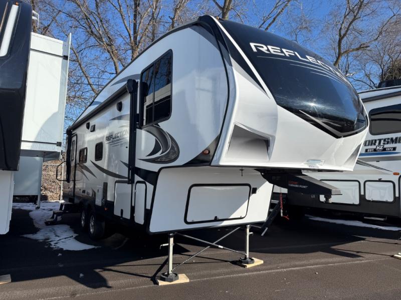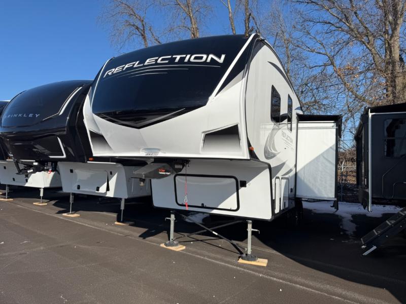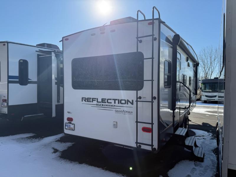 With any Reflection 150 Series fifth wheel by Grand Design, there is more available payload capacity and a broader range of half-ton trucks capable of towing this fifth wheel, and no slider hitch is needed thanks to the 90-degree turning radius which makes them short bed friendly and easier to tow. The mandatory Ultimate Power package provides a "One-Touch" automatic leveling system and a detachable power cord with LED light for easy setup, plus motion sensor pass-through lighting and entry lighting, and the Tire Linc TPMS will help you stay safe on the road. The interior offers residential luxury from the cabinetry and gunstock hardware plus the booth dinette to the residential-style window treatment. Make your refined decision today!