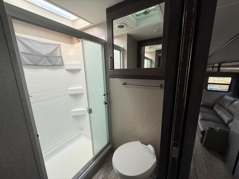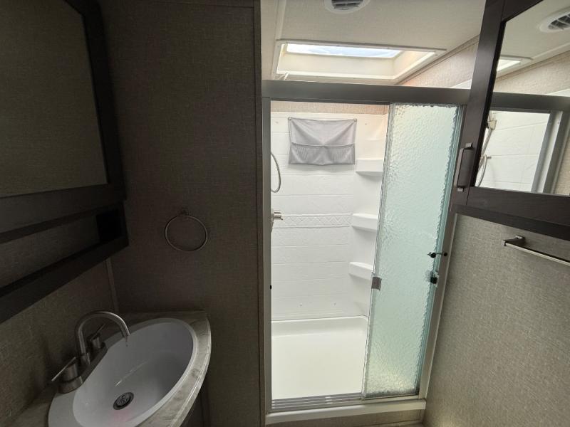 Feel right at home in this Reflection 150 Series with a private bedroom that includes a walk-around queen bed with storage on each side, windows, and a space savings sliding door. The full bathroom offers a walk-in shower, storage for your linens and a sliding door for easy access. When you get hungry, the cook will have an L-shaped kitchen area to make meals, plus full amenities including a 30" microwave, a flip-up counter extension, a pantry for your dry goods and a 16 cu. ft. refrigerator to store lots of food and cold beverages. You can dine at the rear U-shaped dinette lounge and enjoy the view out of all the windows or outside under the 18' electric awning. And the theatre seating will be a nice place to relax and watch the 40" LED HDTV.