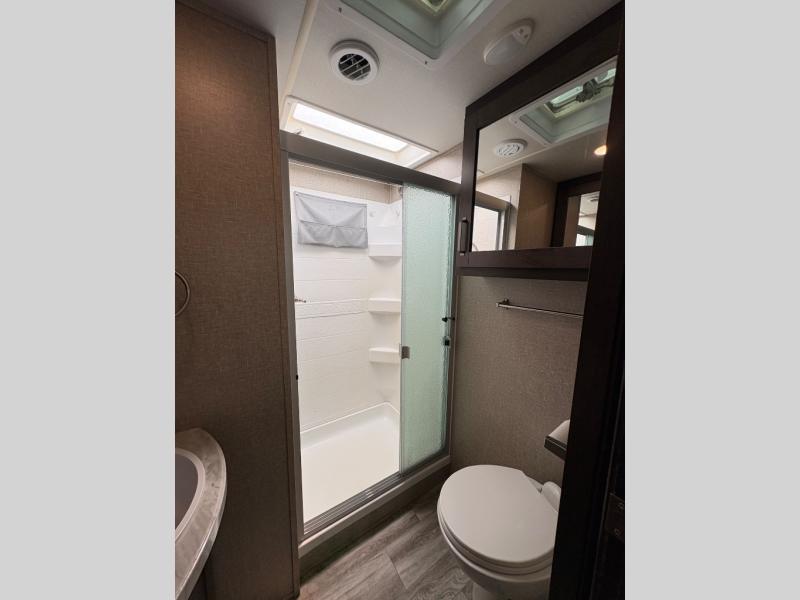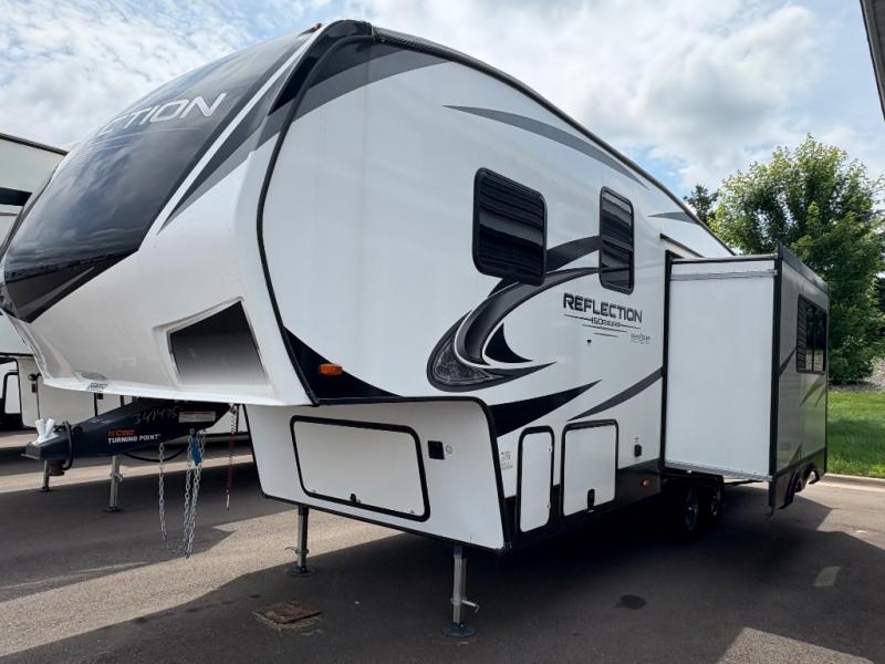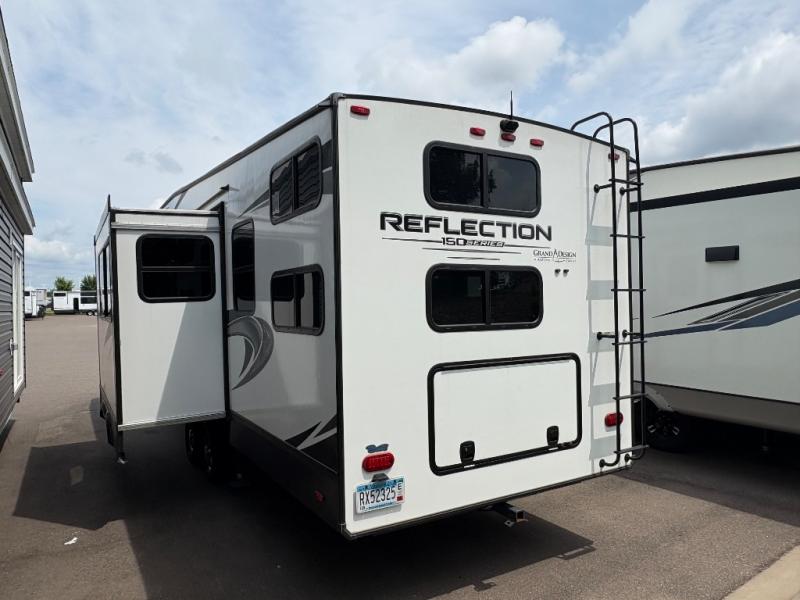With any Reflection 150 Series fifth wheel by Grand Design, there is more available payload capacity and a broader range of half-ton trucks capable of towing this fifth wheel, and no slider hitch is needed thanks to the 90-degree turning radius which makes them short bed friendly and easier to tow. The mandatory Ultimate Power package provides a "One-Touch" automatic leveling system and a detachable power cord with LED light for easy setup, plus motion sensor pass-through lighting and entry lighting, and the Tire Linc TPMS will help you stay safe on the road. The interior offers residential luxury from the cabinetry and gunstock hardware plus the booth dinette to the residential-style window treatment. Make your refined decision today!