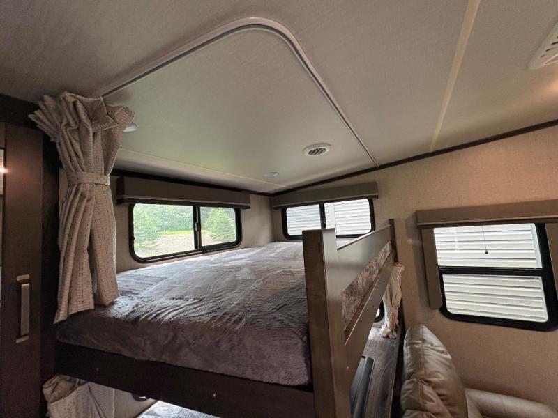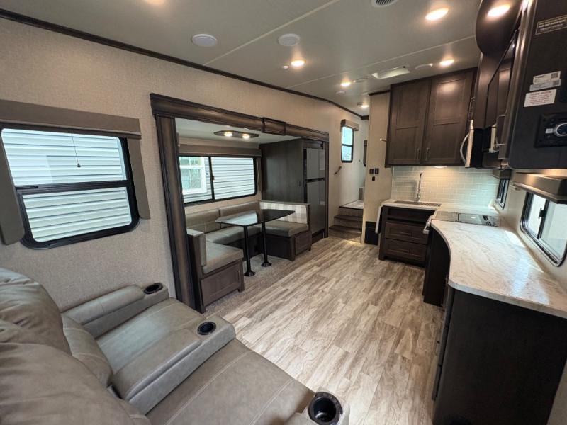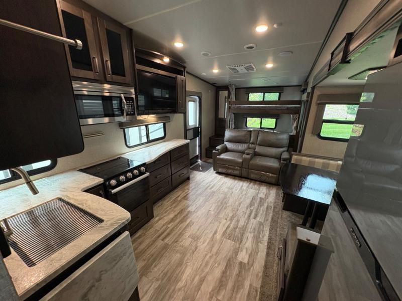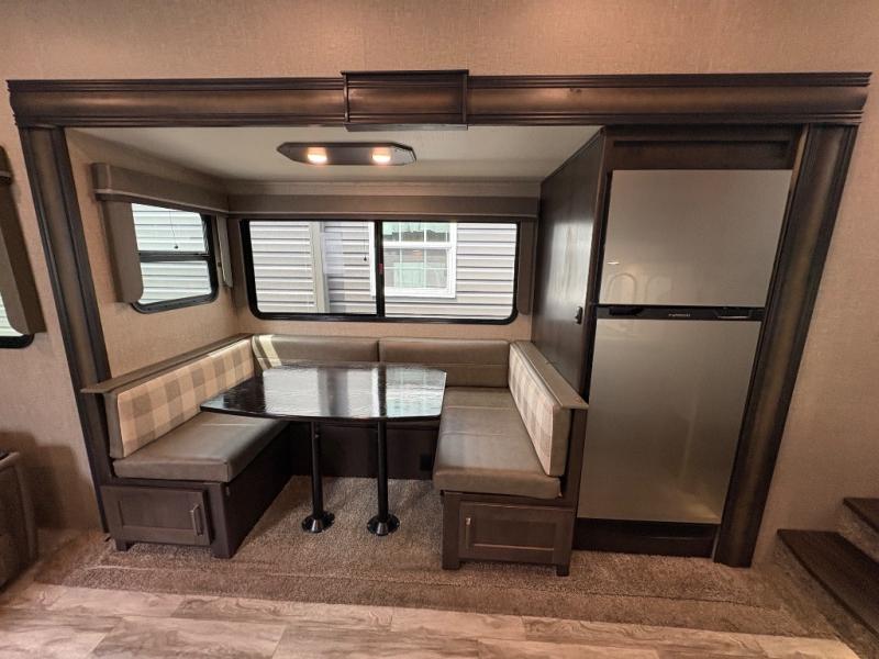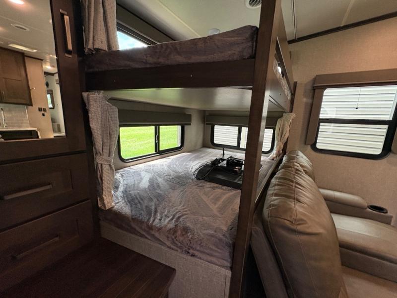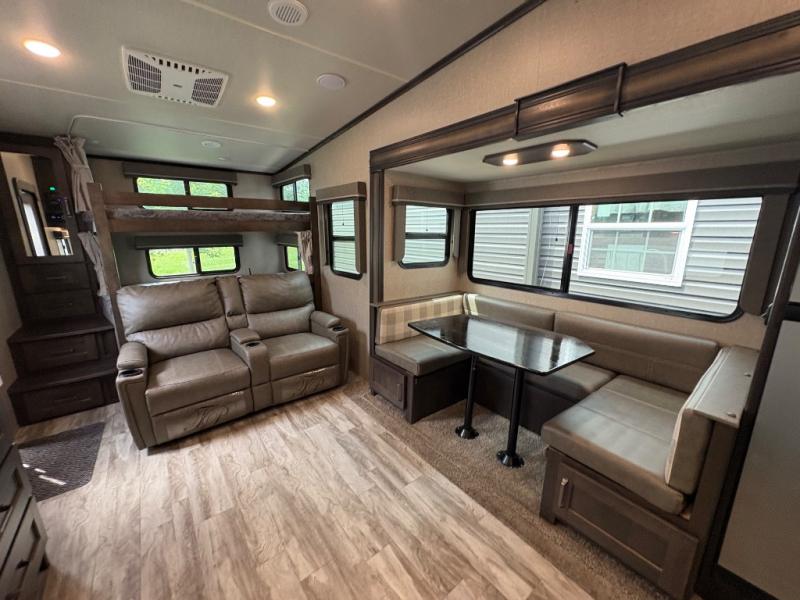 Get away from the hustle and bustle of the city every chance you get with this fifth wheel in tow! Once at your campsite, you can easily set up the single slide and the 20' electric awning and head out for a hike or relax on the U-shaped dinette and theatre seating while watching the 40" LED HDTV. The cook will love the L-shaped kitchen giving them their own space without interruptions and they will have full amenities to keep everyone fed. Everyone can take turns getting cleaned up in the walk-in shower in the full bathroom before calling it a night. The front bedroom offers a walk-around queen bed and plenty of storage, while the rear of this fifth wheel gives the kids or your friends 46" bunk beds to sleep on with their own storage near the step storage. And the U-shaped dinette offers extra sleeping space.