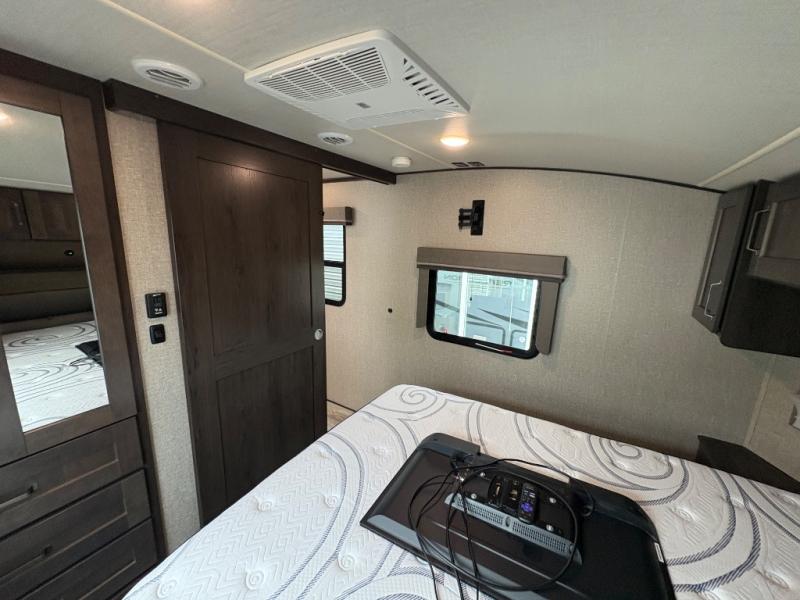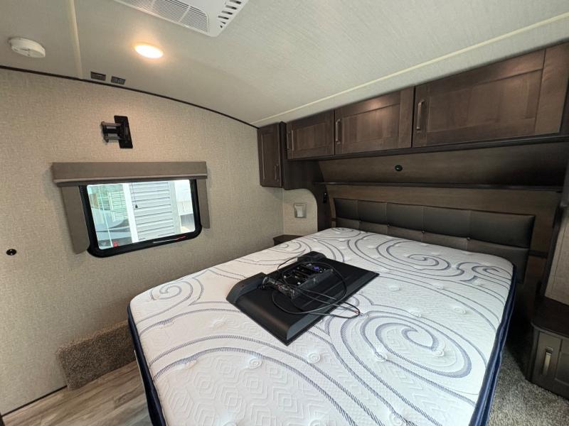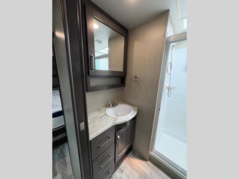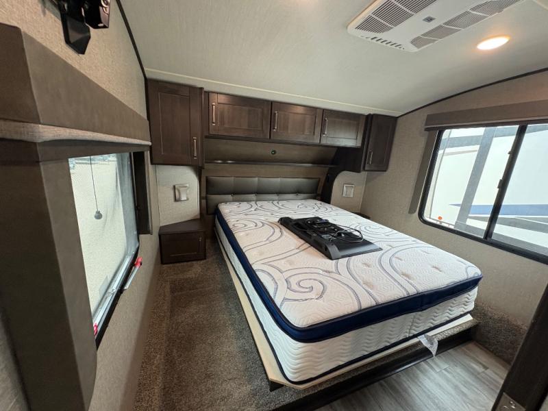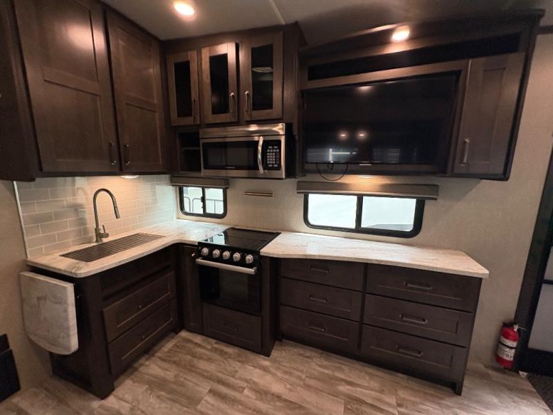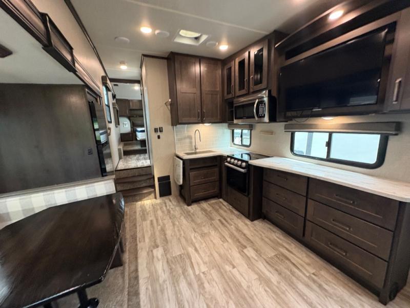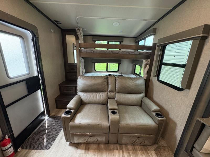 Get away from the hustle and bustle of the city every chance you get with this fifth wheel in tow! Once at your campsite, you can easily set up the single slide and the 20' electric awning and head out for a hike or relax on the U-shaped dinette and theatre seating while watching the 40" LED HDTV. The cook will love the L-shaped kitchen giving them their own space without interruptions and they will have full amenities to keep everyone fed. Everyone can take turns getting cleaned up in the walk-in shower in the full bathroom before calling it a night. The front bedroom offers a walk-around queen bed and plenty of storage, while the rear of this fifth wheel gives the kids or your friends 46" bunk beds to sleep on with their own storage near the step storage. And the U-shaped dinette offers extra sleeping space.