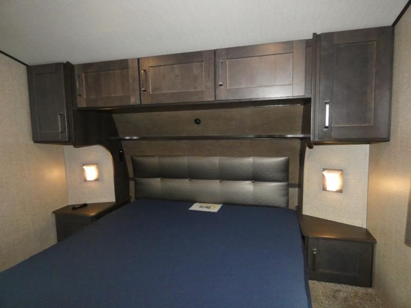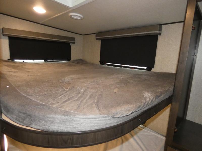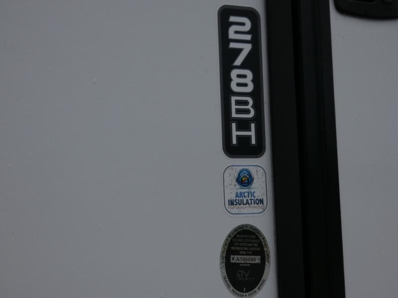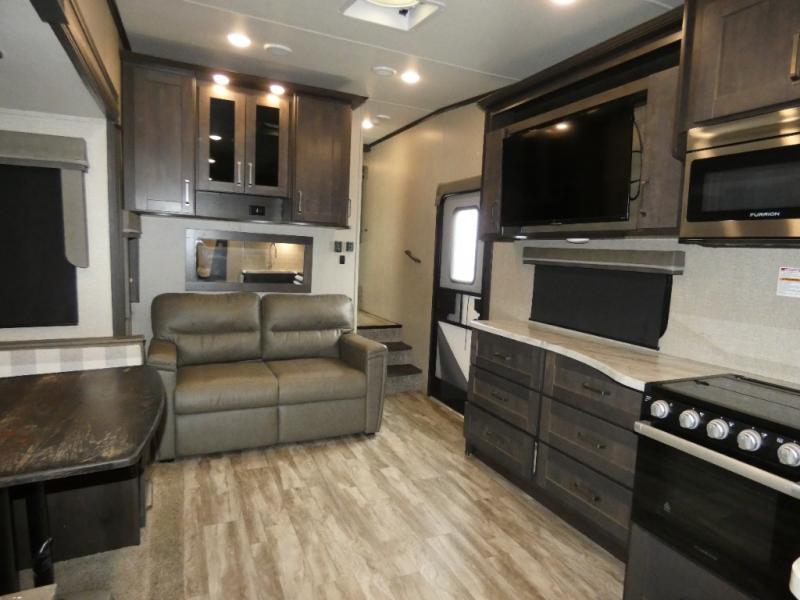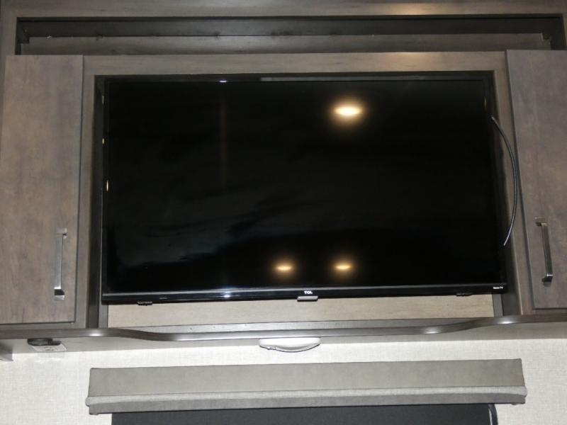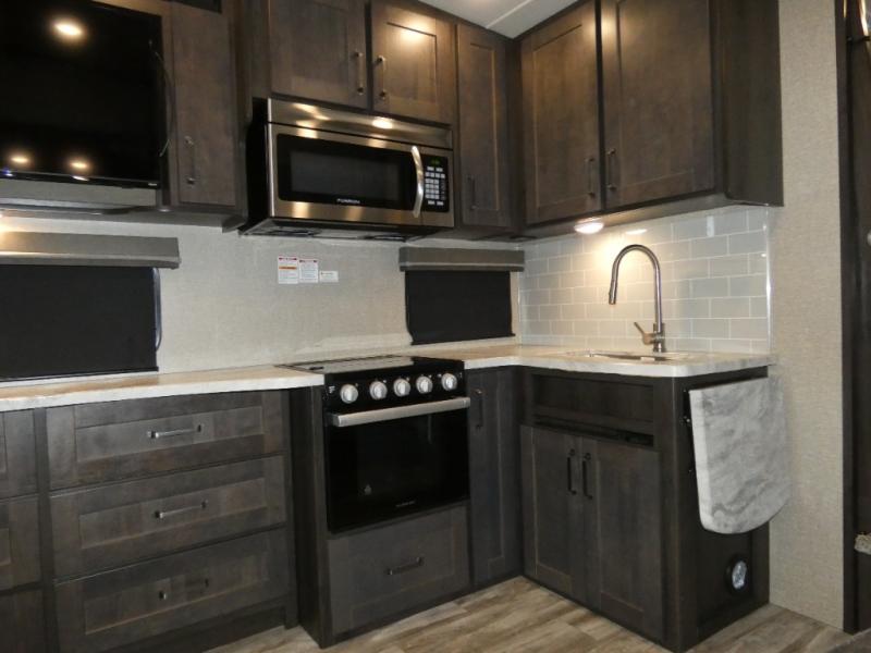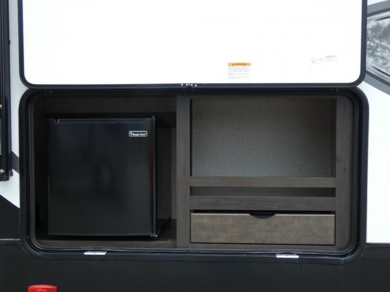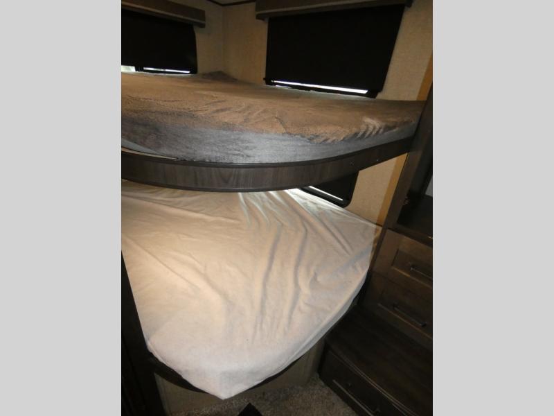 When you enjoy the outdoors as much as the indoors, this fifth wheel offers convenience and comfort throughout the inside and outside! From some of the exterior features such as the outside kitchen to make meals while visiting with other RVers, the spray port to wash off dirty shoes, the rear storage, the All-In-One docking station, the 20' electric awning and aluminum entry steps for safe entry to the interior features with a walk-around queen bed in the front private bedroom and the double-size bunks in the rear with step storage to the 40" LED HDTV in the main living and kitchen area. The tri-fold sofa and U-shaped dinette offer extra sleeping space as well, and the cook will love the L-shaped kitchen area inside with full amenities.