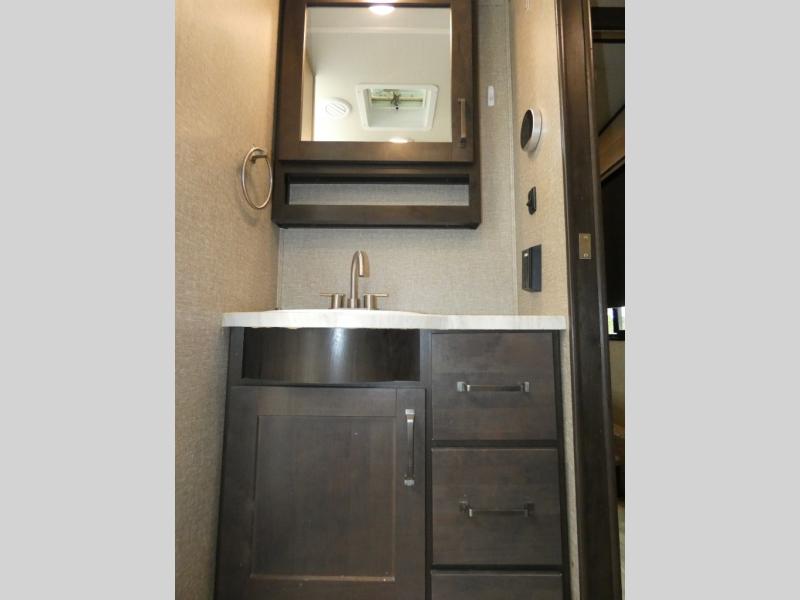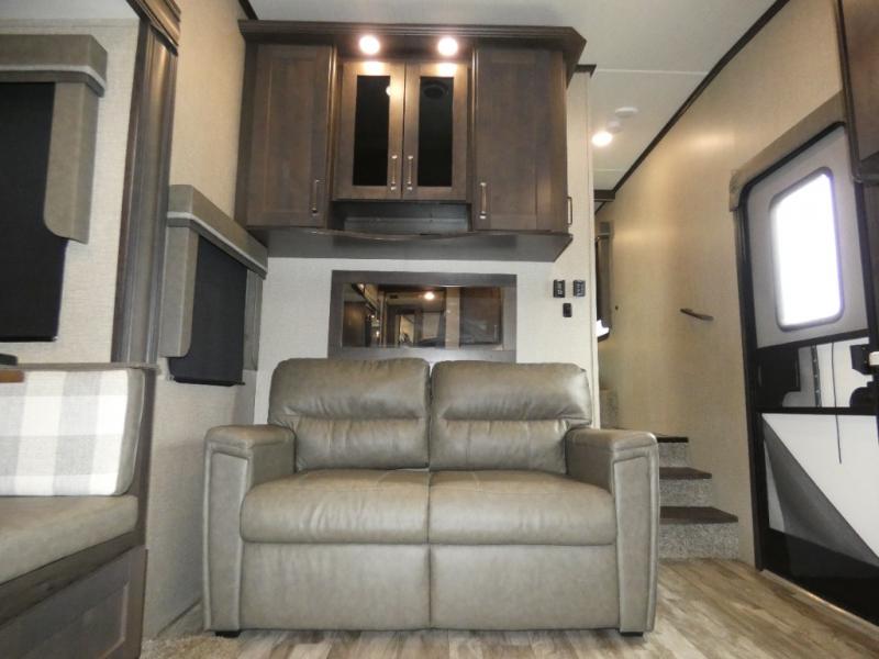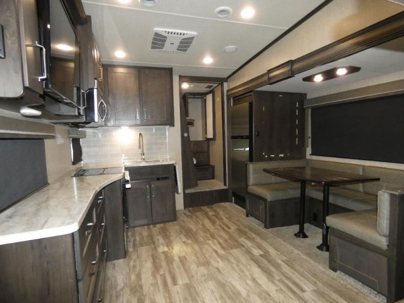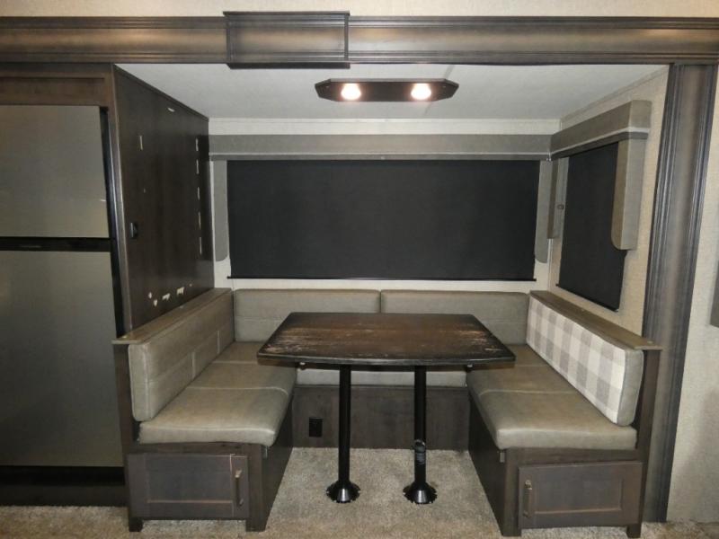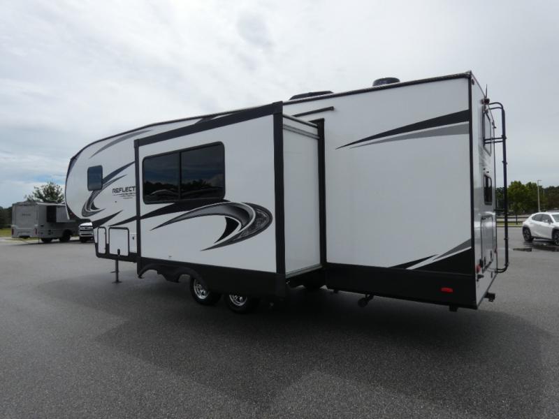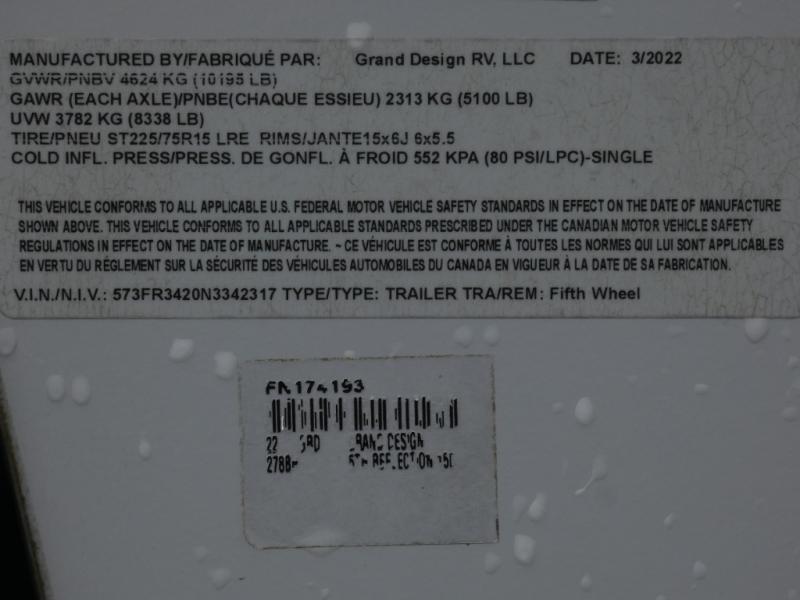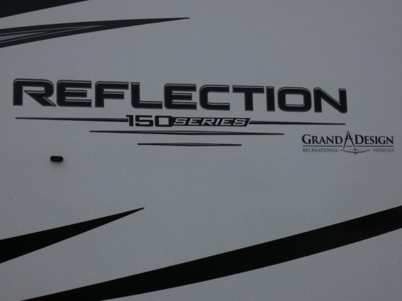 With any Reflection 150 Series fifth wheel by Grand Design, there is more available payload capacity and a broader range of half-ton trucks capable of towing this fifth wheel, and no slider hitch is needed thanks to the 90-degree turning radius which makes them short bed friendly and easier to tow. The mandatory Ultimate Power package provides a "One-Touch" automatic leveling system and a detachable power cord with LED light for easy setup, plus motion sensor pass-through lighting and entry lighting, and the Tire Linc TPMS will help you stay safe on the road. The interior offers residential luxury from the cabinetry and gunstock hardware plus the booth dinette to the residential-style window treatment. Make your refined decision today!
