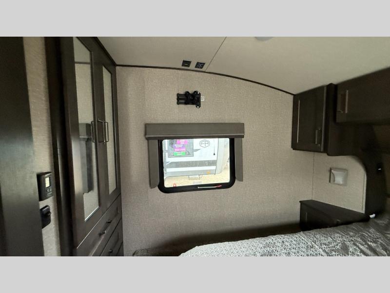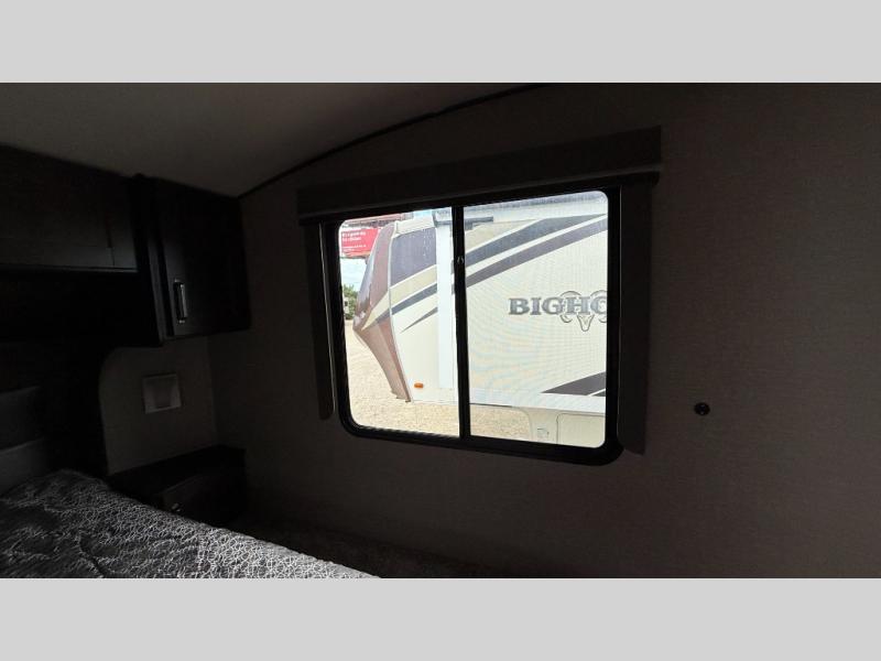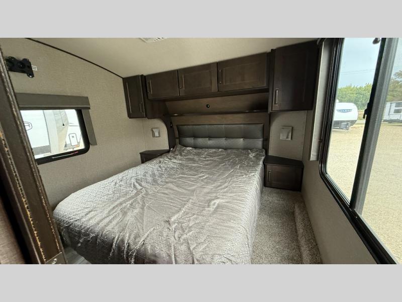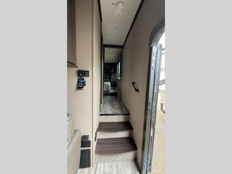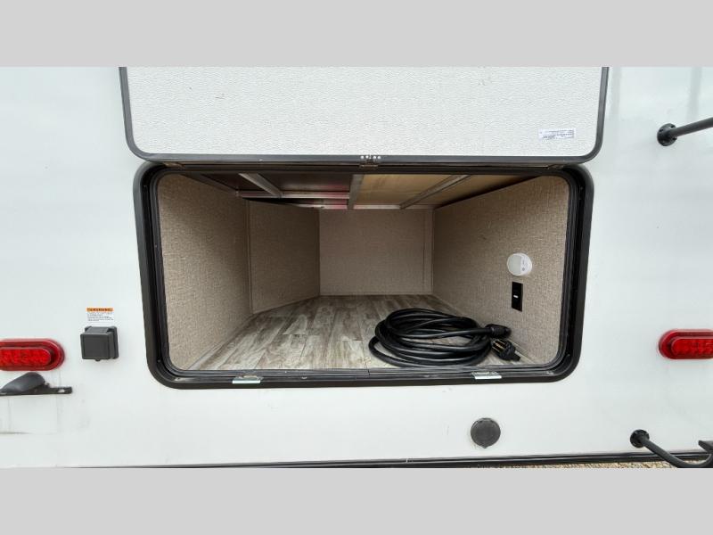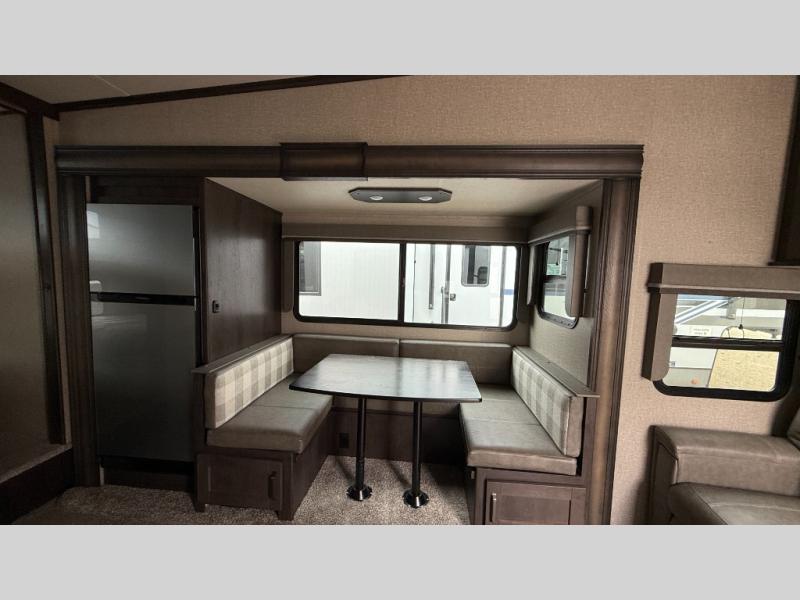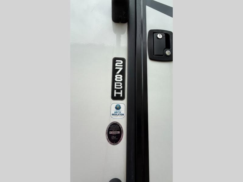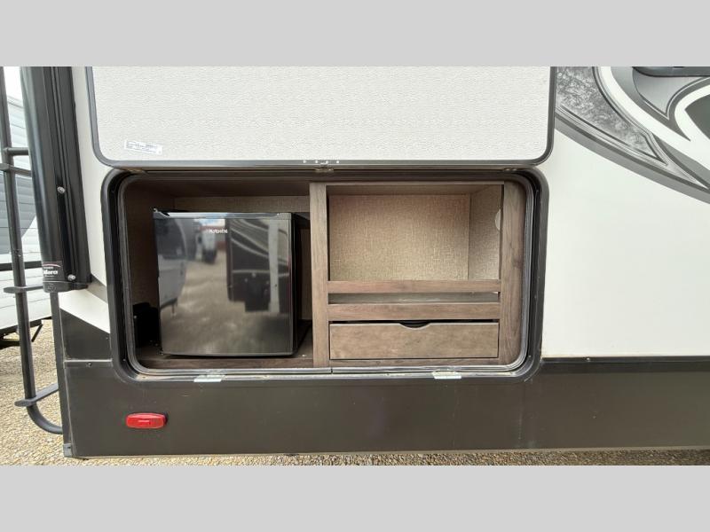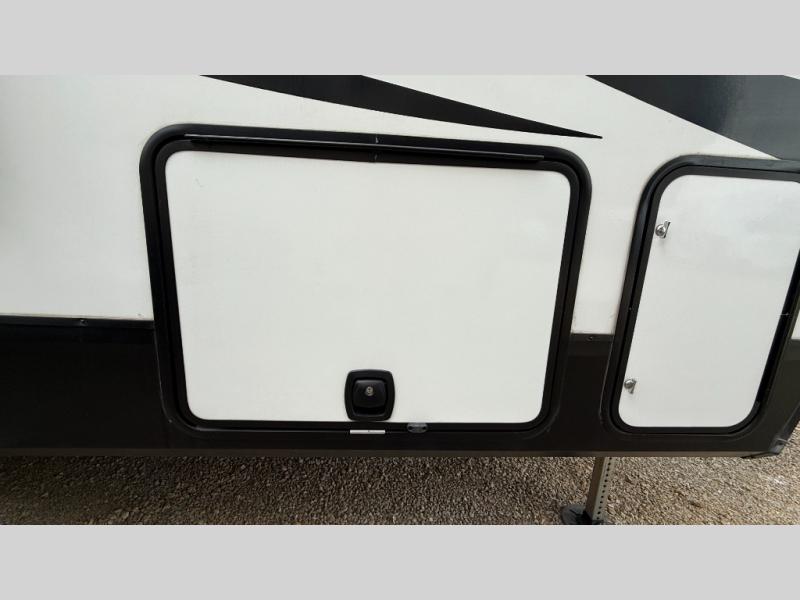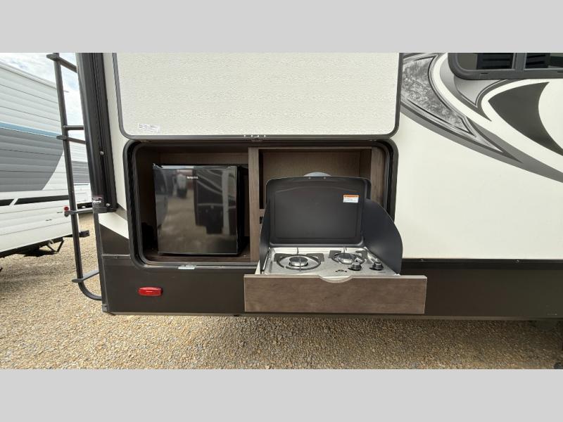 When you enjoy the outdoors as much as the indoors, this fifth wheel offers convenience and comfort throughout the inside and outside! From some of the exterior features such as the outside kitchen to make meals while visiting with other RVers, the spray port to wash off dirty shoes, the rear storage, the All-In-One docking station, the 20' electric awning and aluminum entry steps for safe entry to the interior features with a walk-around queen bed in the front private bedroom and the double-size bunks in the rear with step storage to the 40" LED HDTV in the main living and kitchen area. The tri-fold sofa and U-shaped dinette offer extra sleeping space as well, and the cook will love the L-shaped kitchen area inside with full amenities.