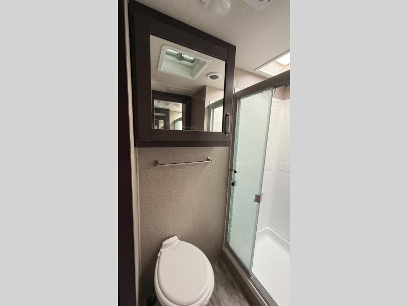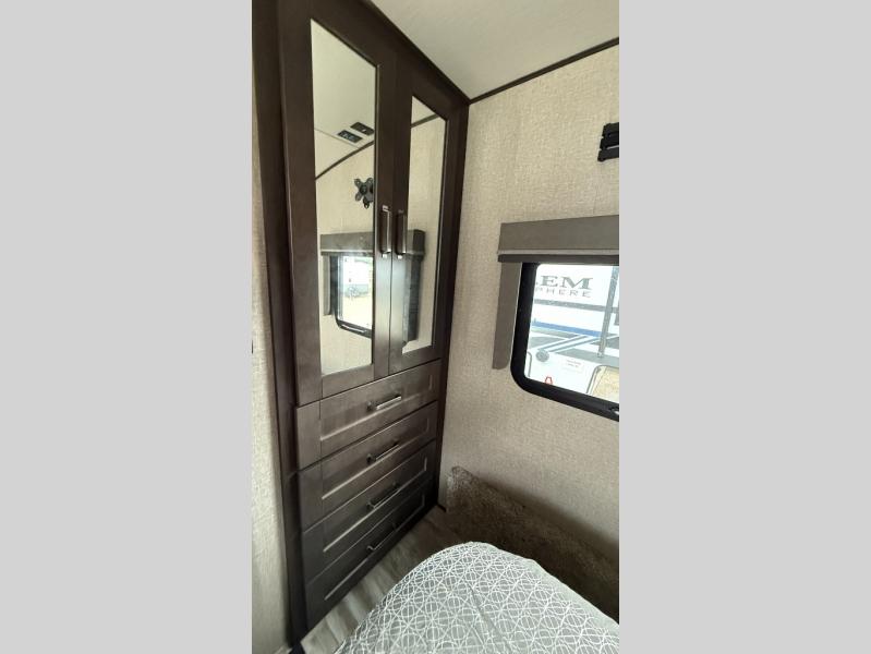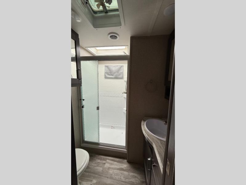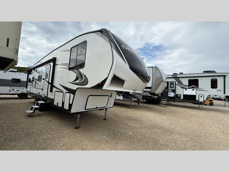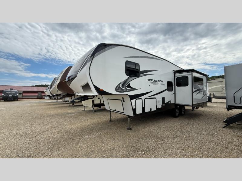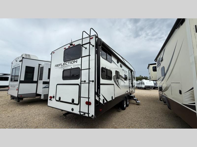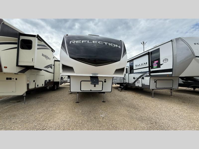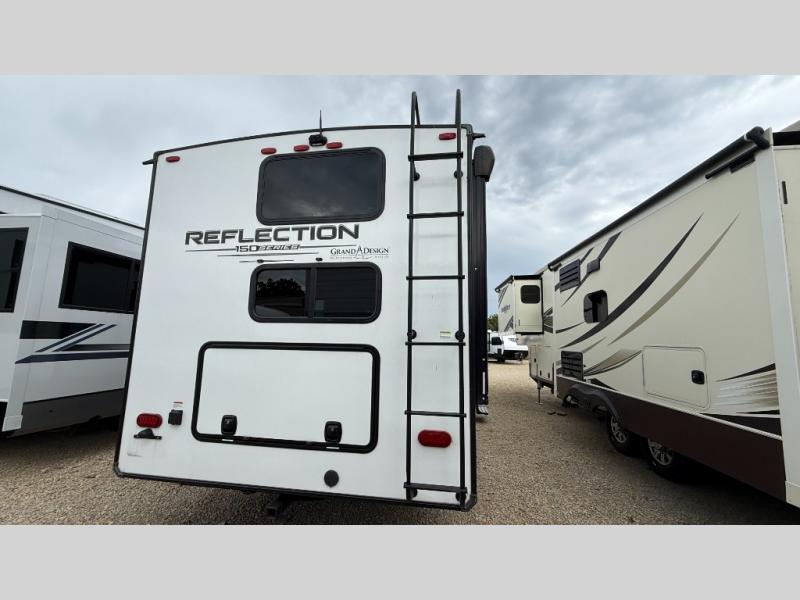 With any Reflection 150 Series fifth wheel by Grand Design, there is more available payload capacity and a broader range of half-ton trucks capable of towing this fifth wheel, and no slider hitch is needed thanks to the 90-degree turning radius which makes them short bed friendly and easier to tow. The mandatory Ultimate Power package provides a "One-Touch" automatic leveling system and a detachable power cord with LED light for easy setup, plus motion sensor pass-through lighting and entry lighting, and the Tire Linc TPMS will help you stay safe on the road. The interior offers residential luxury from the cabinetry and gunstock hardware plus the booth dinette to the residential-style window treatment. Make your refined decision today!