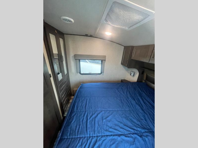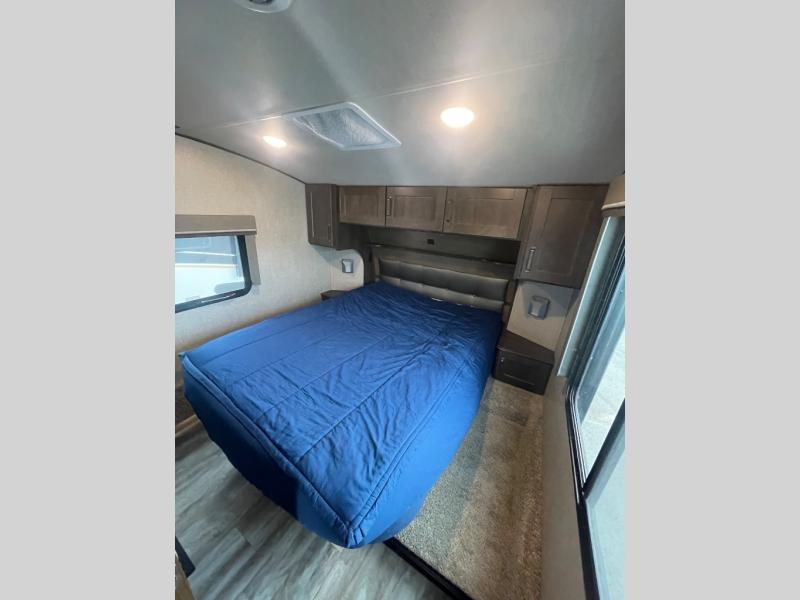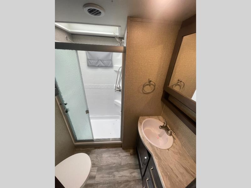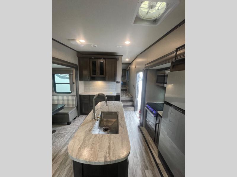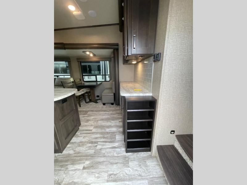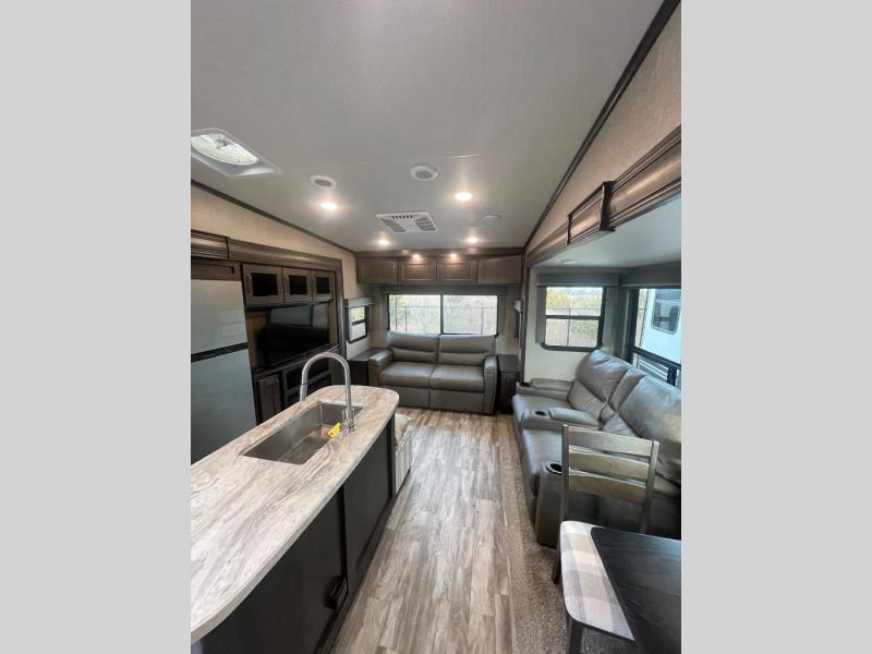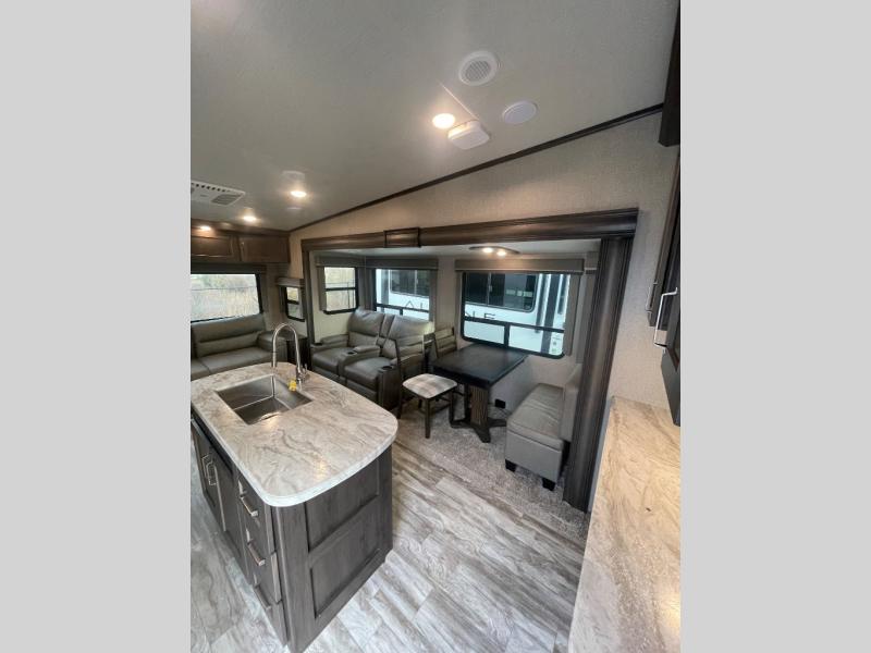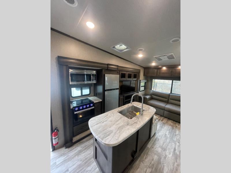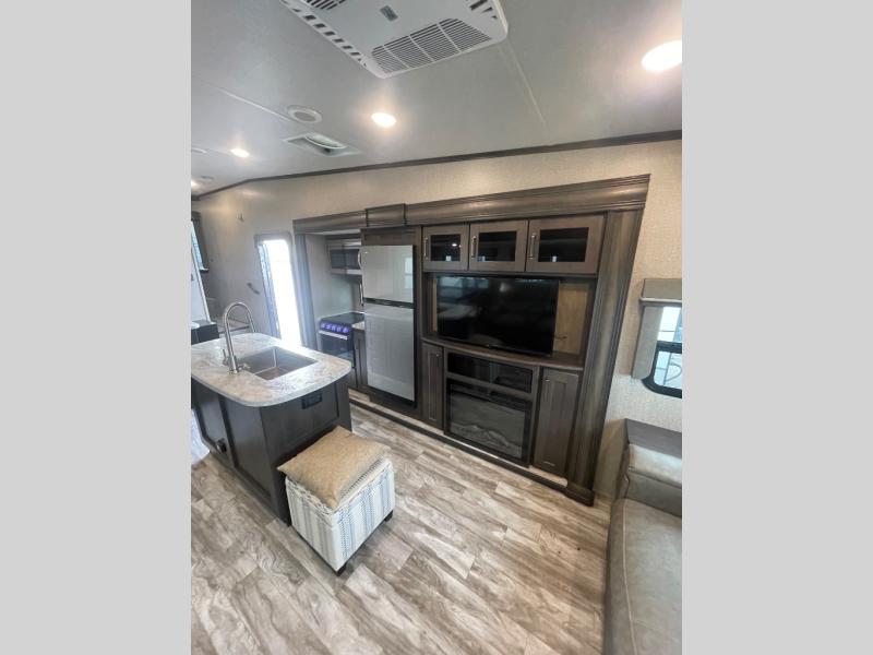 Get ready to enjoy the inside just as much as the outdoors when you have this fifth wheel at the campgrounds. The interior offers a spacious main living and kitchen area thanks to the opposing slides which make walking around the kitchen island easy. The hutch offers more counter and storage space to prepare and serve meals, plus bring extra dishes and such, and the 10 cu. ft. refrigerator will hold your leftovers plus some. Relax on the tri-fold sofa that offers extra sleeping space for guests, and you will love the theatre seats while watching the 40" LED HDTV with fireplace below. There is a full bathroom with a walk-in shower, and the front bedroom allows you to sleep like a queen!