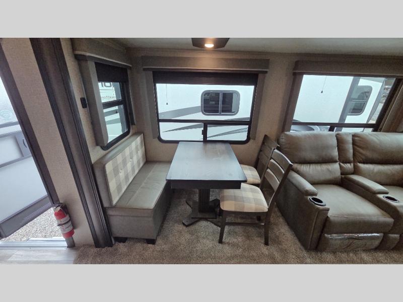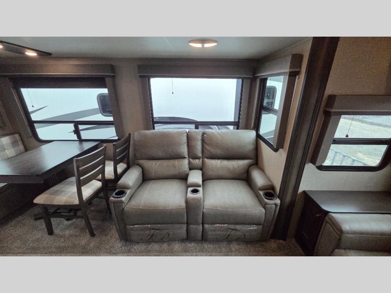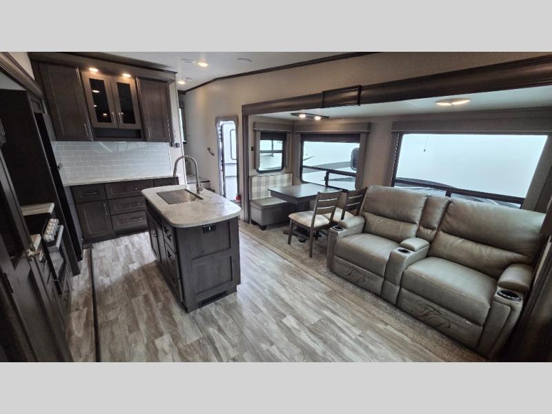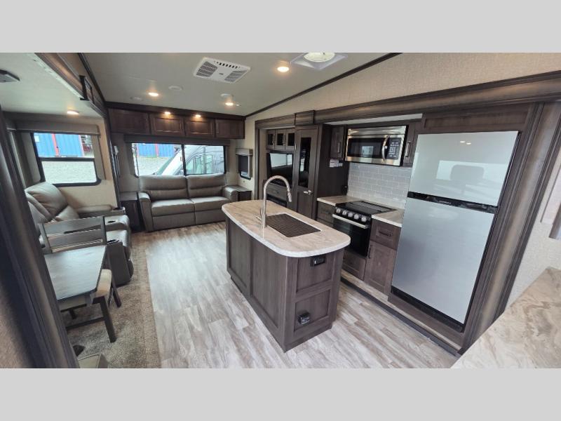 Get ready to enjoy everything the campgrounds and surrounding area has to offer when you are setup to camp in this fifth wheel! The two electric awnings offer protected areas creating outdoor living spaces, just grab your camping chairs from the unobstructed pass-through storage. And the interior offers a spacious living area and kitchen combination with two slide outs. You can sit on the tri-fold sofa or the dinette with an option for a free standing dinette. The hutch and kitchen island offer counter space to prepare and serve meals, and there is a large pantry for goodies. The 40" LED HDTV with fireplace below provides entertainment before bedtime or on a rainy day. And the front bedroom offers privacy, a walk-around queen bed, storage, and it is next to the full bathroom which is just a few steps down the hallway.