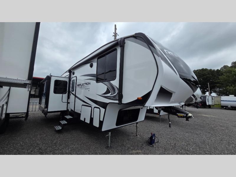With any Reflection 150 Series fifth wheel by Grand Design, there is more available payload capacity and a broader range of half-ton trucks capable of towing this fifth wheel, and no slider hitch is needed thanks to the 90-degree turning radius which makes them short bed friendly and easier to tow. The mandatory Ultimate Power package provides a "One-Touch" automatic leveling system and a detachable power cord with LED light for easy setup, plus motion sensor pass-through lighting and entry lighting, and the Tire Linc TPMS will help you stay safe on the road. The interior offers residential luxury from the cabinetry and gunstock hardware plus the booth dinette to the residential-style window treatment. Make your refined decision today!
